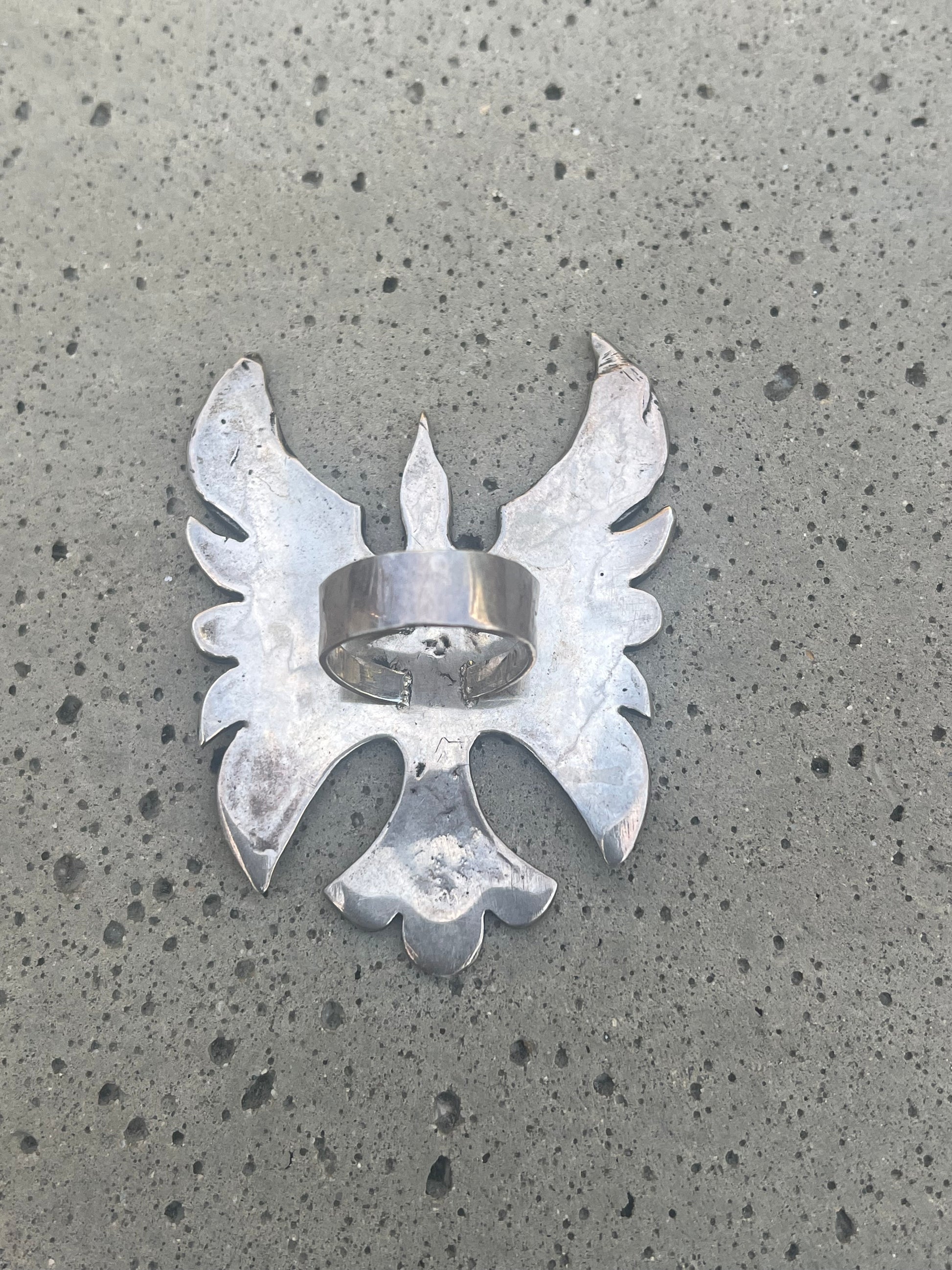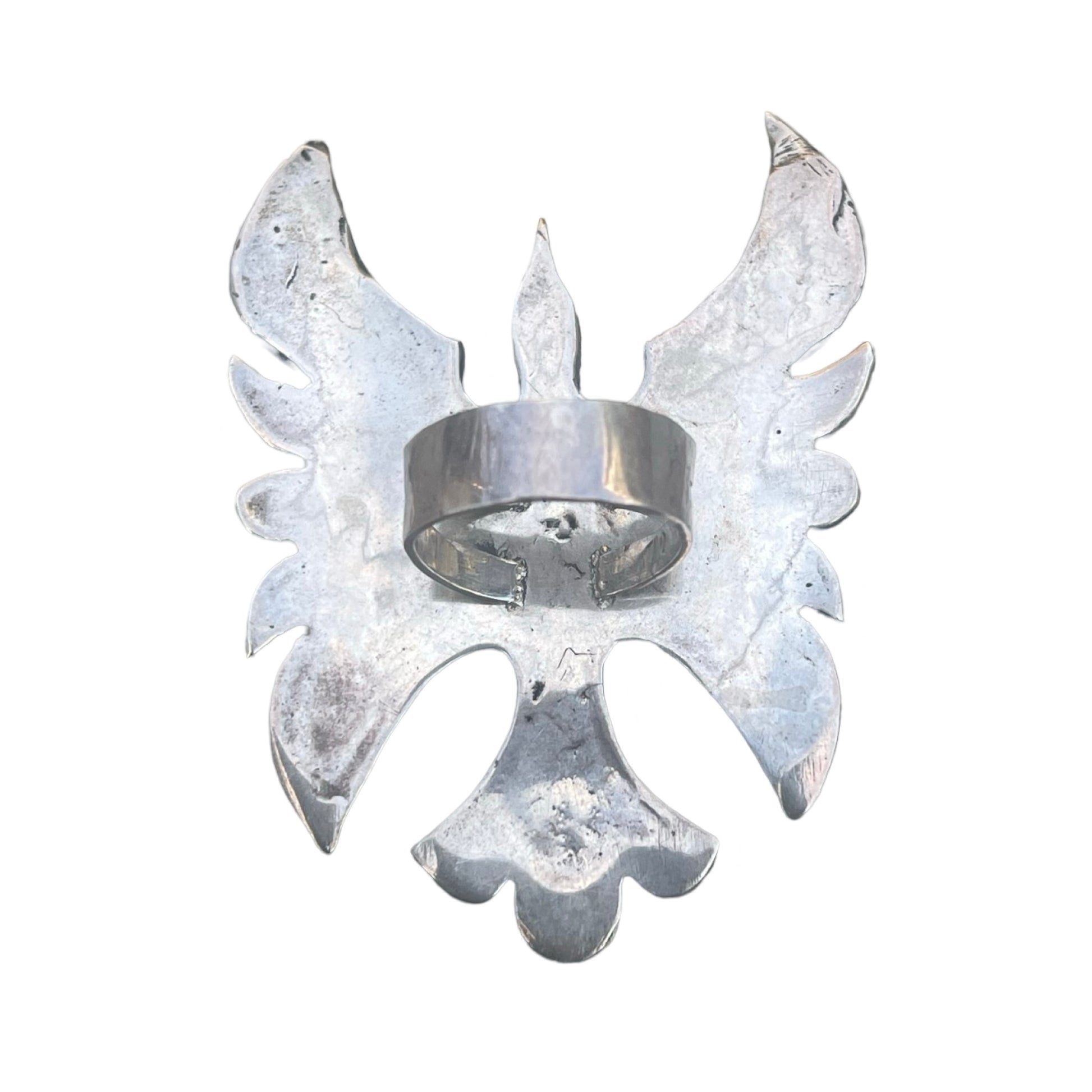 Huuuuge vintage Navajo sterling silver, turquoise and coral mosaic inlay Thunderbird ring. Stunning size measures 2 1/4” tall by 2” wide, size 9. A show-stopping statement piece of Native American jewelry.