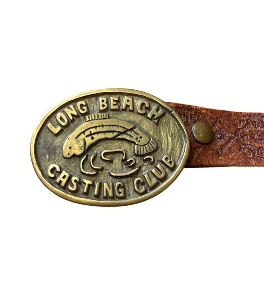 Vintage Signed ‘87 Handmade Long Beach Casting Club Solid Brass Buckle on Vintage Tooled Leather Belt