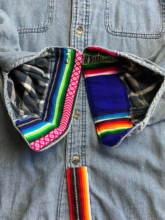 Vintage Flannel Lined Denim Shirt Serape Textile Accents w/ Pockets S