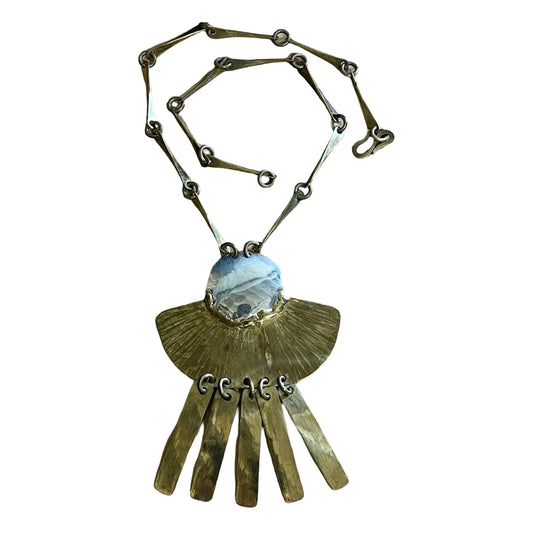 Vintage Modernist Brutalist Crystal Brass Silver Statement Necklace