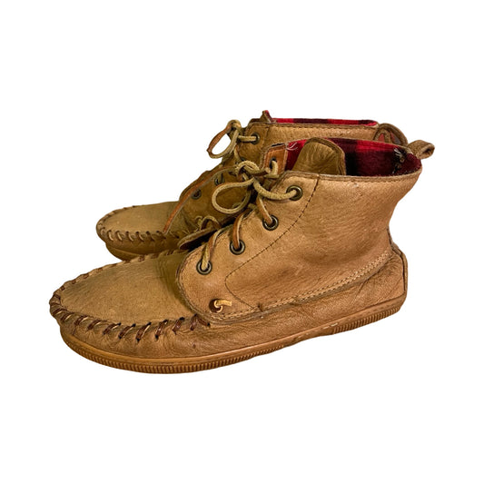 Vintage 70’s Handmade Leather Moccasin Boots w/ Buffalo Plaid Flannel Lining 8