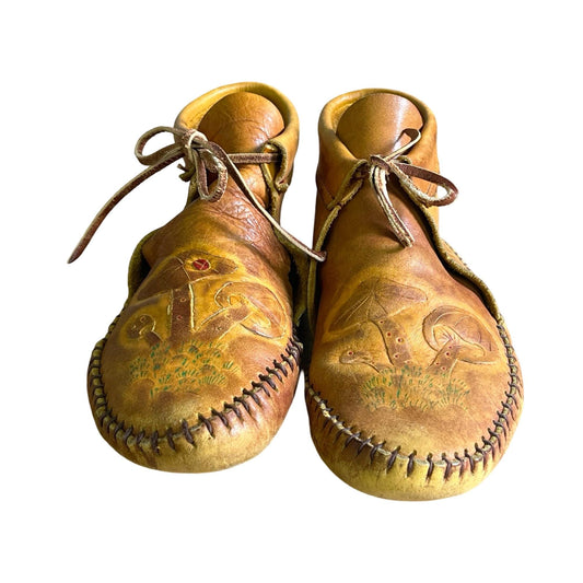 Rare Vintage Mushroom Moccasins Hand Tooled Hand Painted Handmade Leather Women’s 8/8.5