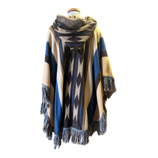 Vintage 70's Cuddle Knit Southwestern Print Hooded Fringe Trim Poncho O/S
