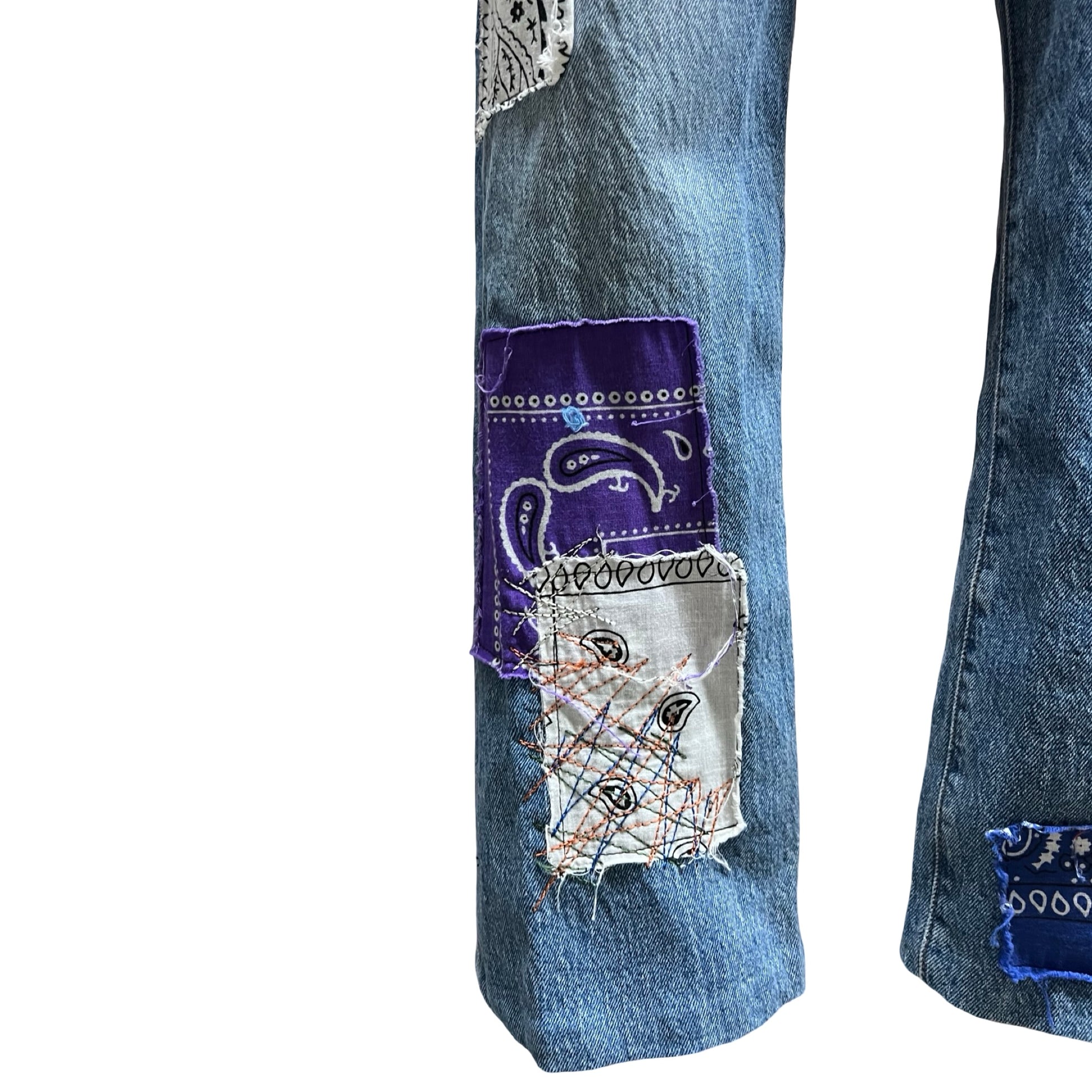 Incredibly rare pair of ten year old Levi’s 501’s (especially in this size) with custom bandana patches by Rialto Jean Project for Free People. Soft and worn, this is a great fitting and amazing pair of jeans! Tag size 36 x 32, actual measurements 36 x 27.