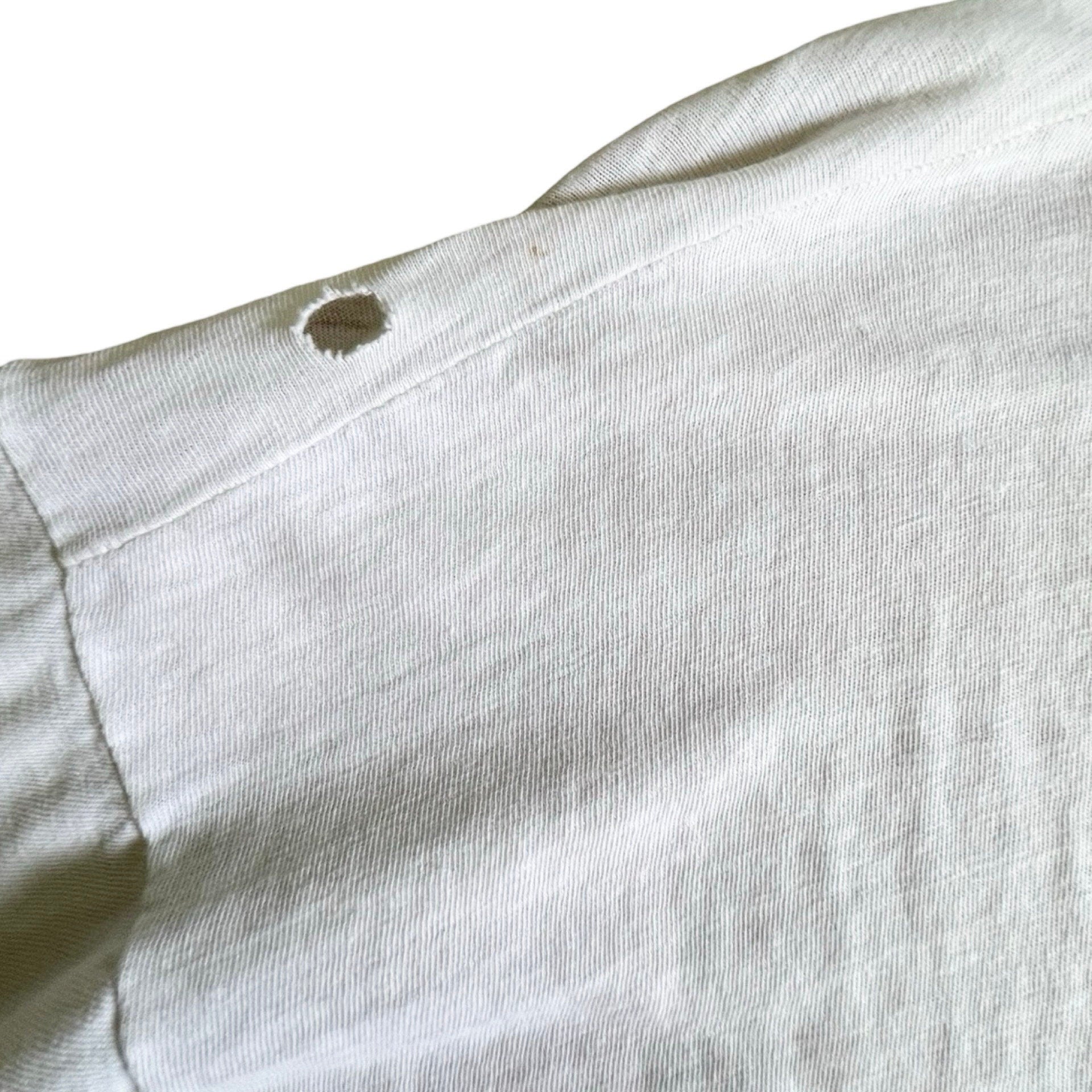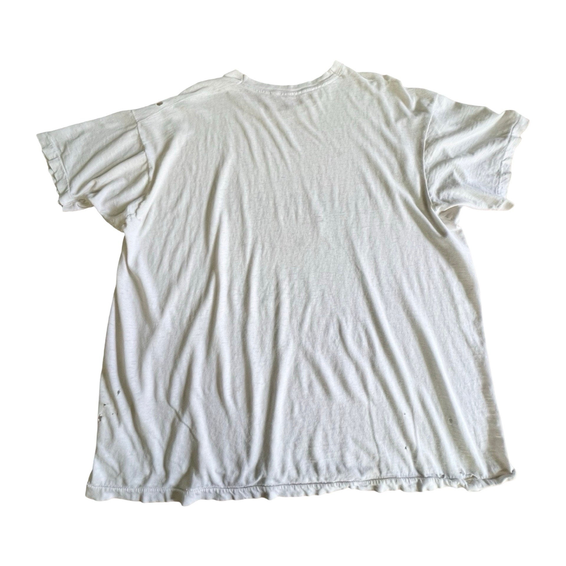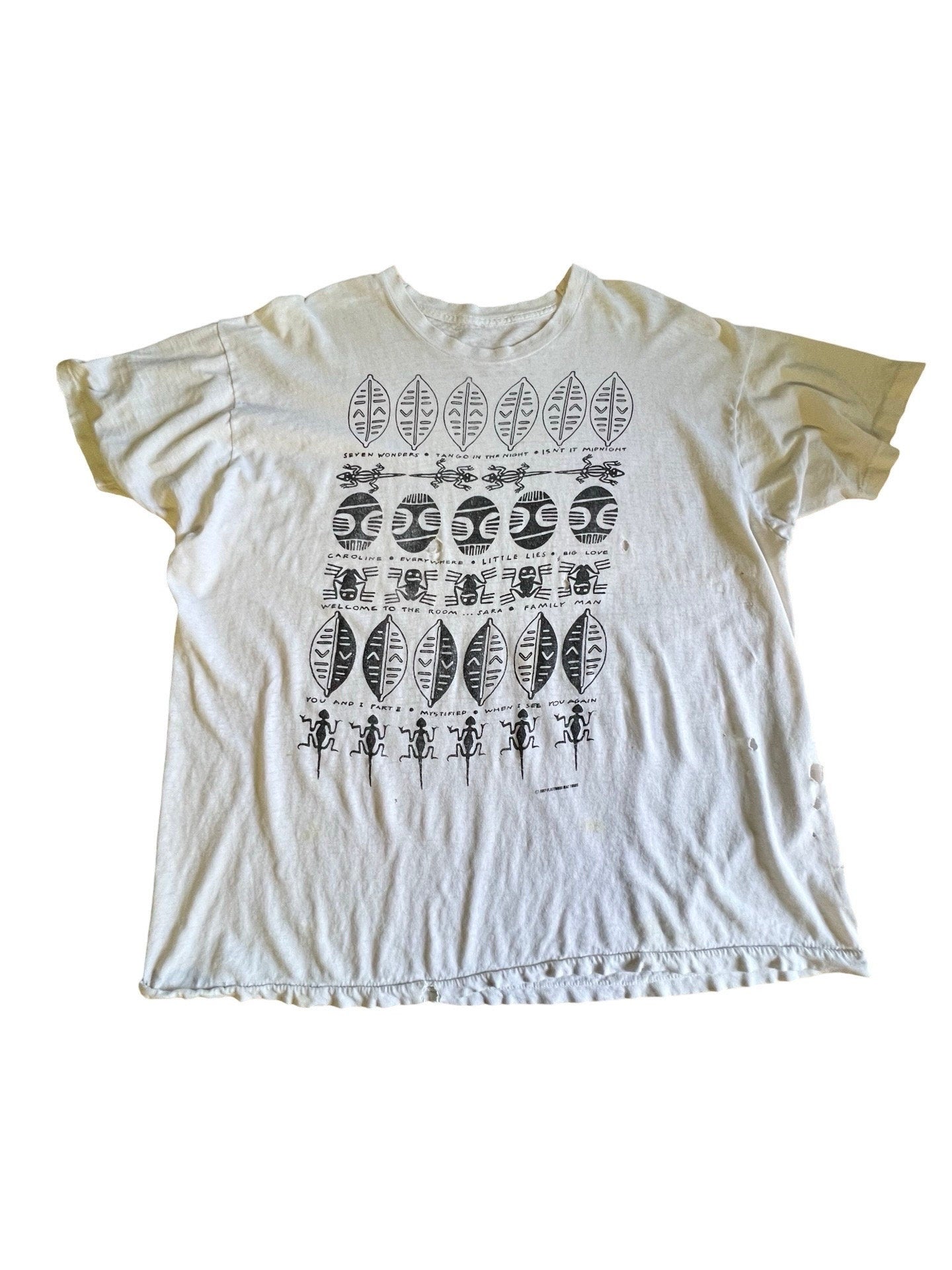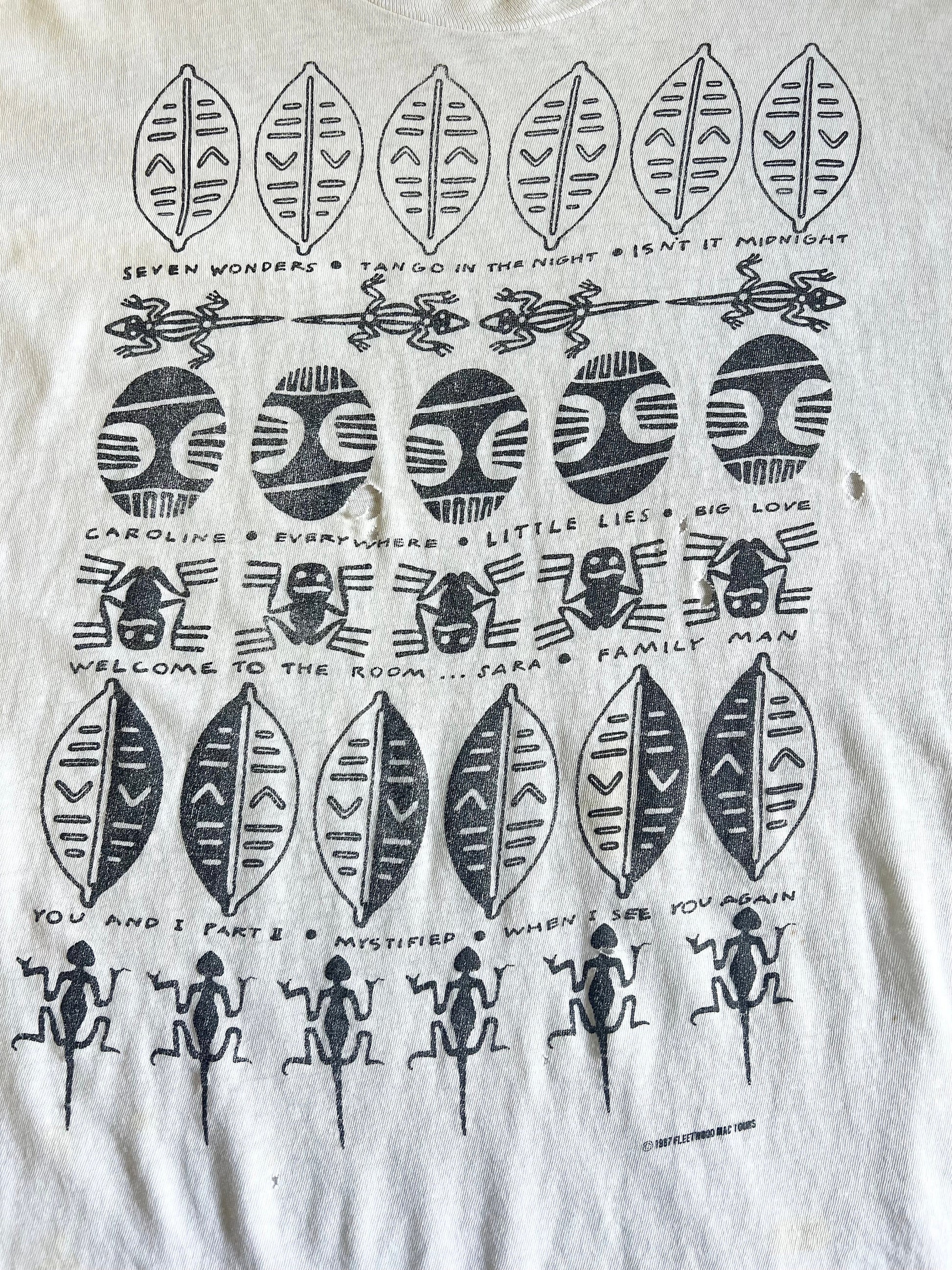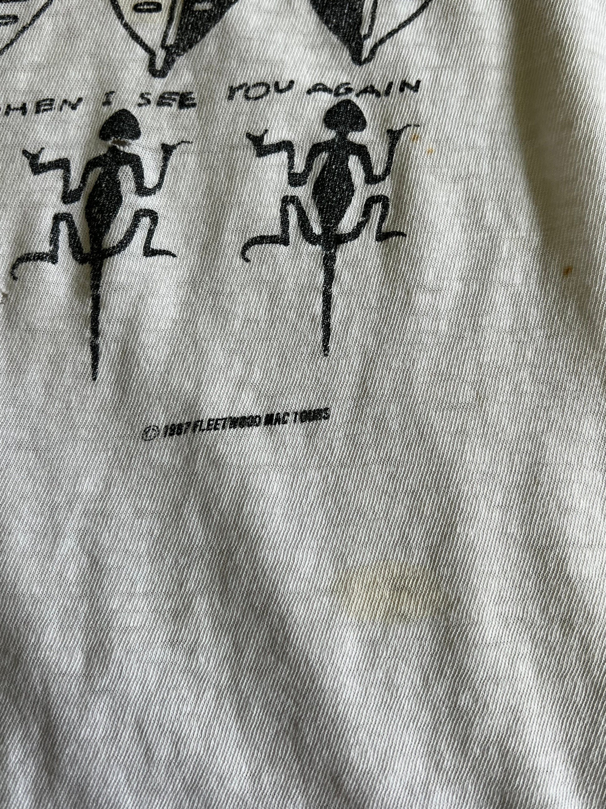 Extremely rare Fleetwood Mac 1987 Tango In The Night song list t-shirt…I’ve never ever seen another one like it! Single stitch with no tag, this shirt has definitely been well worn and well loved…you’ll find some holes and stains throughout this 35+ year old shirt (only adds to the charm imho). Copyright mark 1987 Fleetwood Mac Tours at bottom of graphic, the shirt has a beautiful drape and a slightly oversized fit measuring 24” pit to pit and 26” top to bottom. Such a rare and collectible piece of Fleetwood Mac history!!