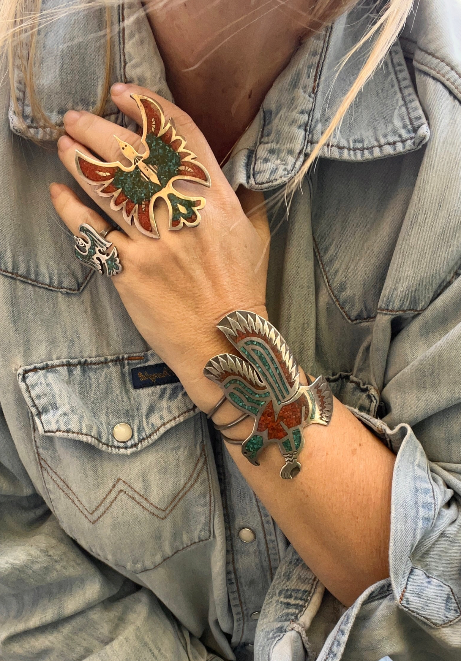 Huuuuge vintage Navajo sterling silver, turquoise and coral mosaic inlay Thunderbird ring. Stunning size measures 2 1/4” tall by 2” wide, size 9. A show-stopping statement piece of Native American jewelry.