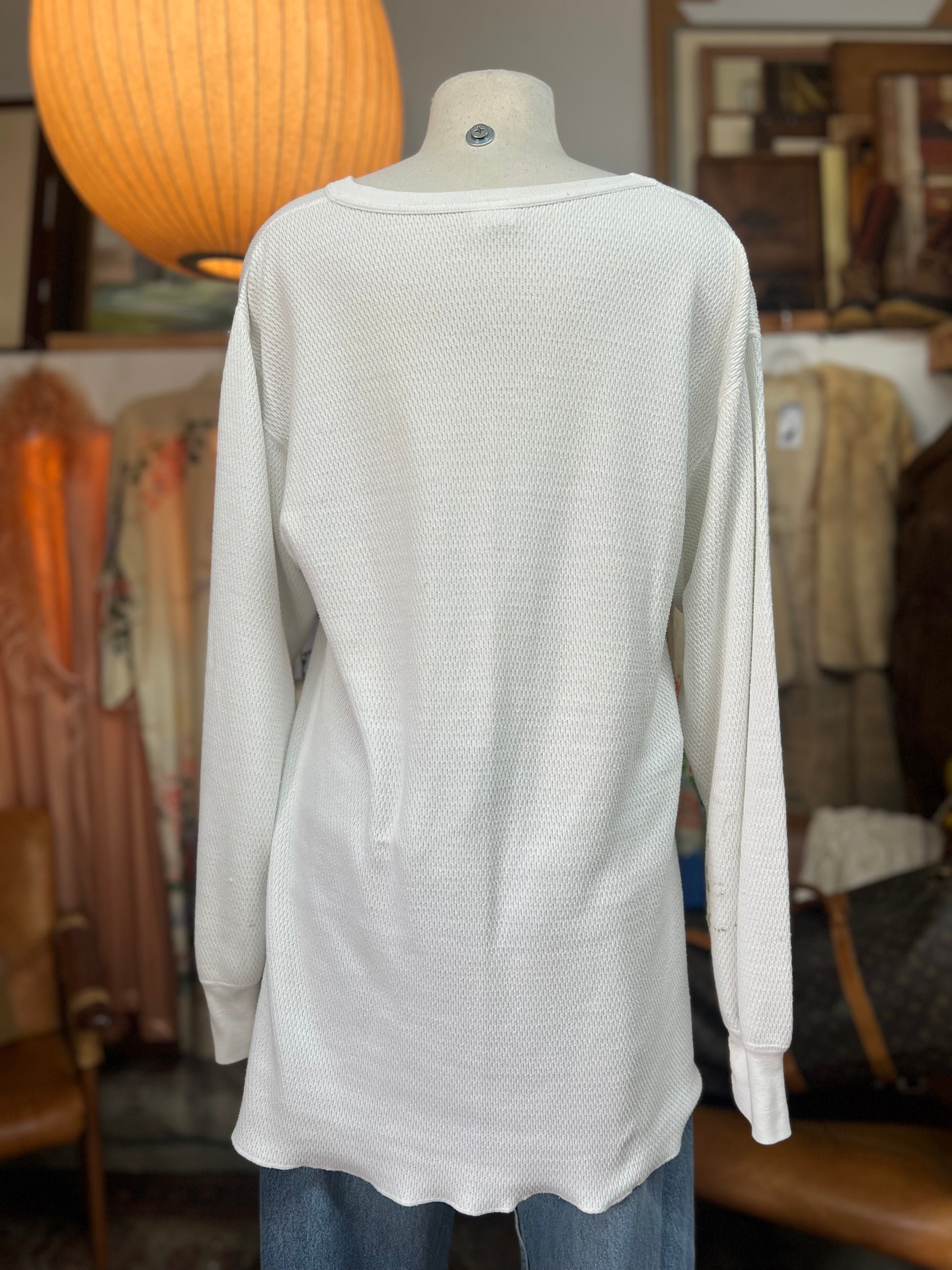 Super rare vintage 1980’s Harley Davidson distressed thermal with front and sleeve graphics. These are so hard to find, especially in white and especially in a larger size! Some slight allover pilling and some hard paint spots on lower right sleeve. All graphics are cracked and a bit faded. Tag reads JL Morgan Super Johns 3XL and measures 20.5” pit to pit and 30” top to bottom….perfect for tall and lanky fellas or as a dress on a shorter girlie! This one is loooong.