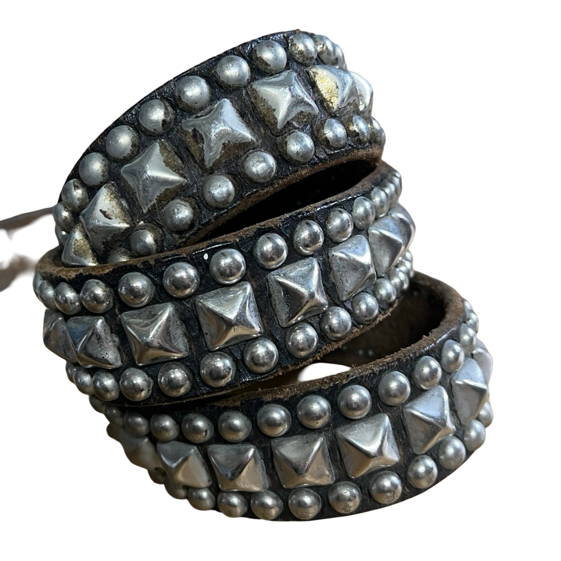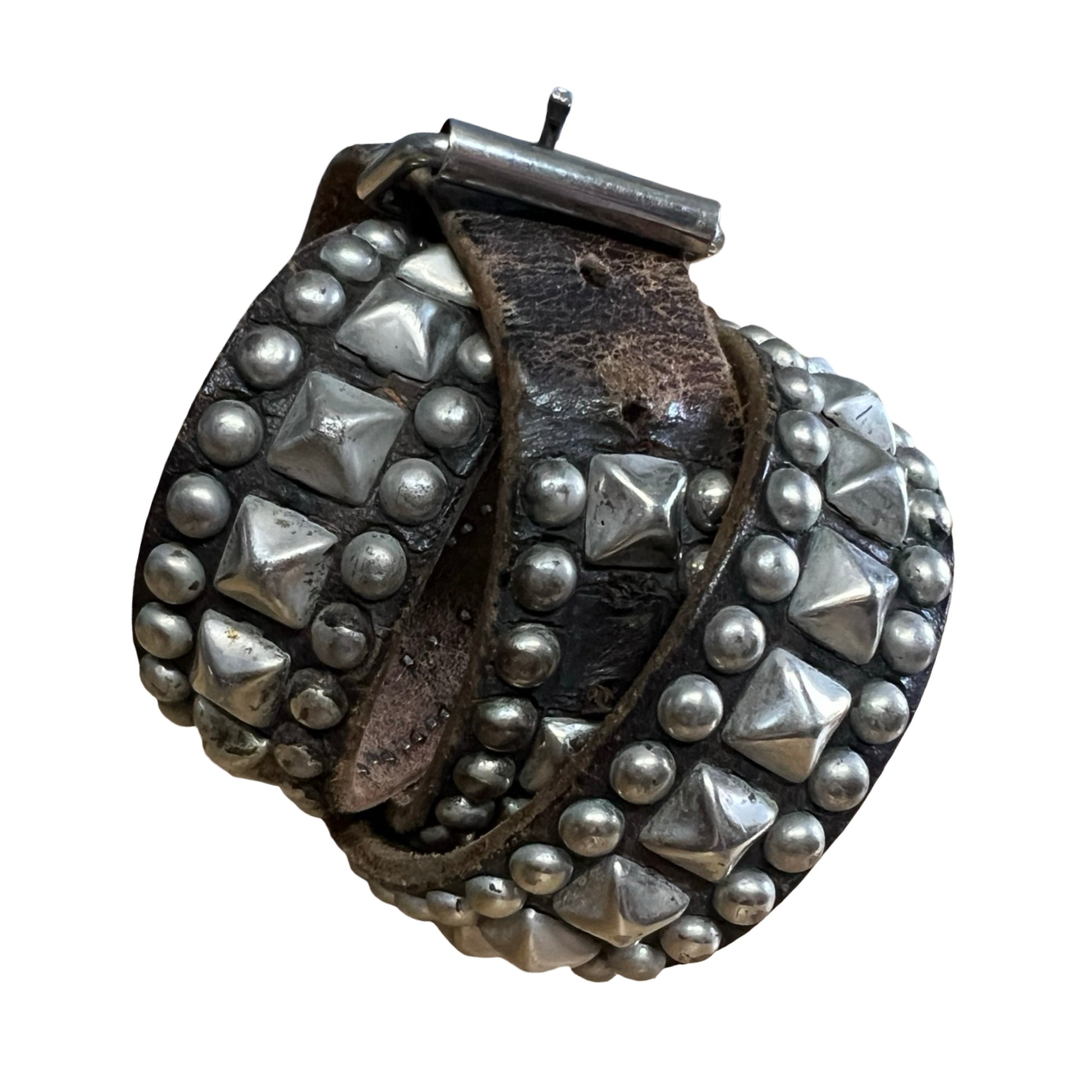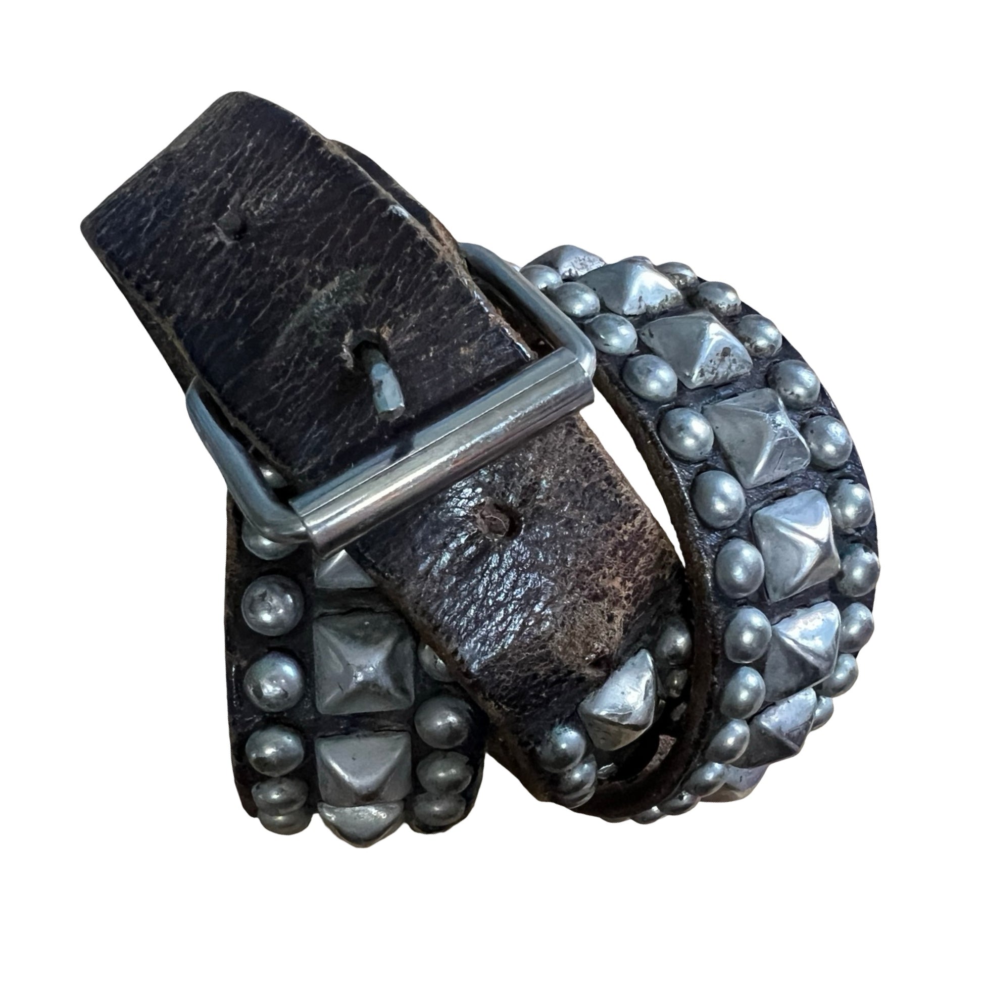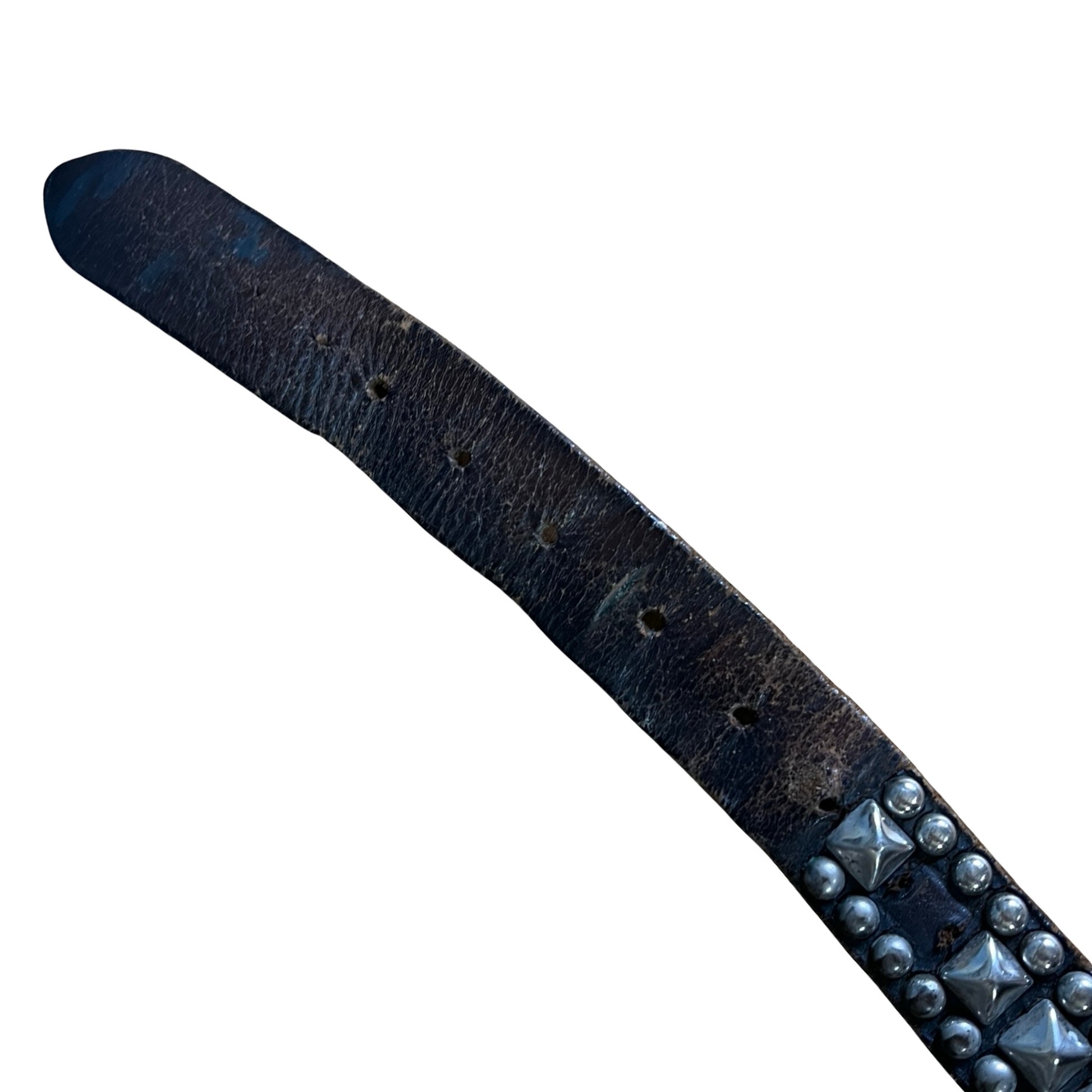 This belt is insane, an absolute collectors piece and worn to perfection. And SO rare to find in this size!! Authentic 1980’s punk rock distressed leather and stuffed belt. SO many contemporary designers have done versions of this, but this one’s the real deal. Leaving all the original patina in tact which includes dirt, paint, scuffs, marks, and shockingly only one missing stud!! Leather is worn soft and thin and the studs are nice and matte due to age. A one of a kind piece and a chance to own some punk history. Measures 42” end to end (not including buckle).
