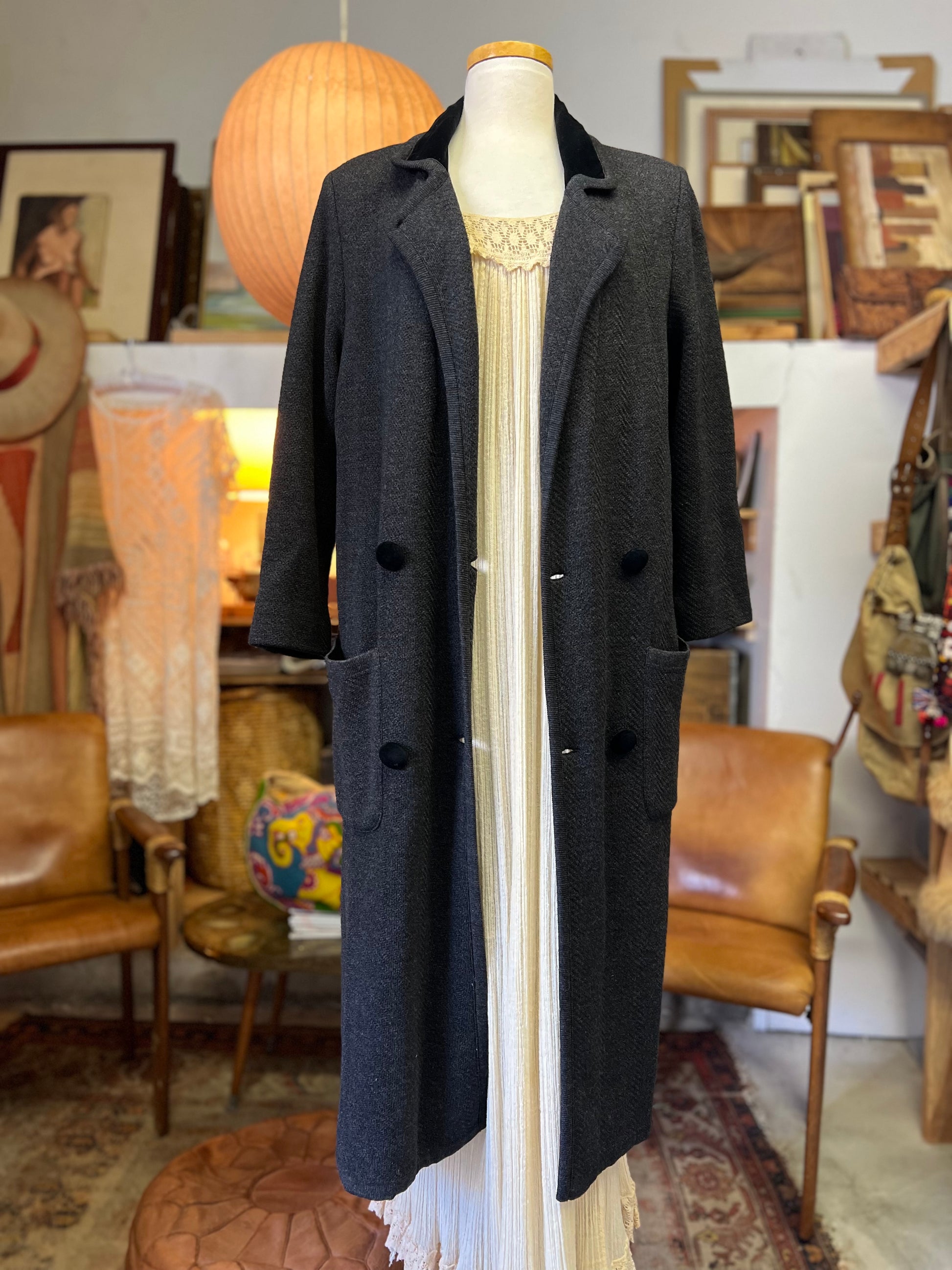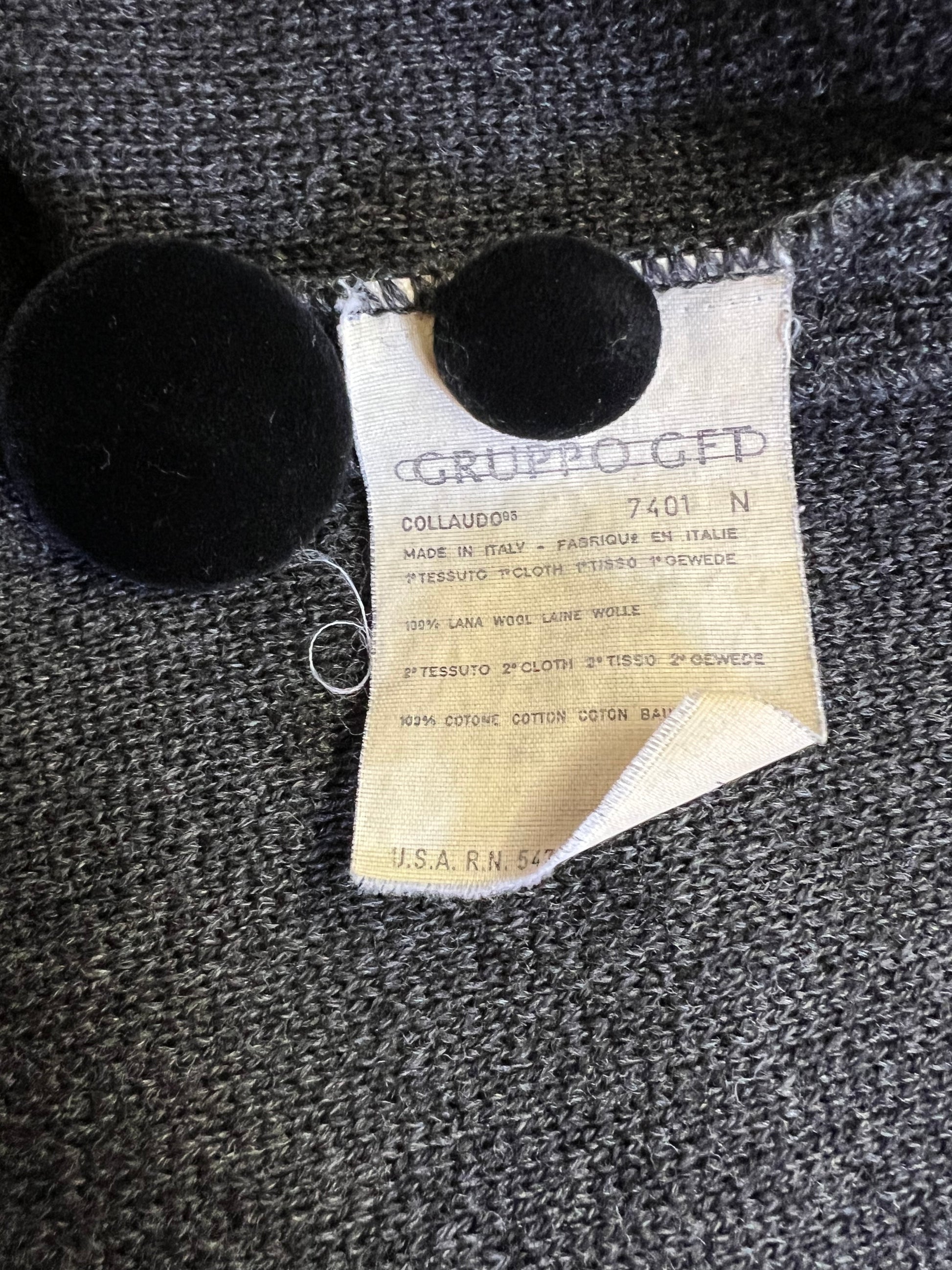 This vintage Valentino Studio coat is as stunning as it is cozy!! Made of the softest, stretchy merino wool with velvet accents. All velvet button are in tact, including both sizes of the extra buttons inside! Velvet at collar, buttons, and button cuffs. Back and side vents. Shoulder pads that are easily removable but definitely add to the drama! The feel of this reminds me of my Lauren Manoogian duster….super soft with some ‘bounce’ and ‘stretch’ to the fabric. Tagged size 42/8, Made In Italy, 100% lana wool. Measures 20” pit to pit and 48” top to bottom. This one is very special. It’s giving Carrie Bradshaw meets Audrey Hepburn.