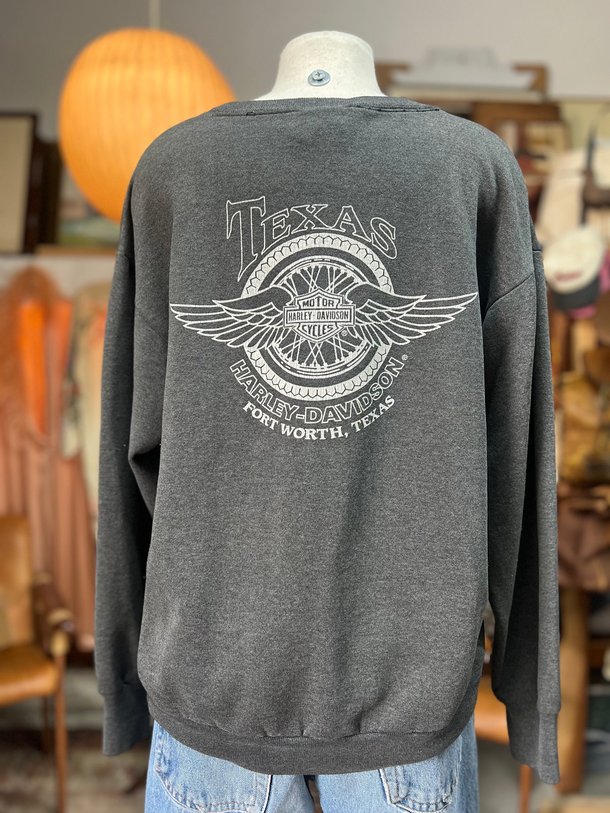 Butter soft and paper thin vintage double sided Harley sweatshirt featuring a ferocious wolf and the 3D emblem logo. Worn to perfection, the fit on this one is amazing. Copyright 3D Emblem 1992. Back Ft. Worth, Texas graphic is faded & cracked. Tag size XL, measures 23” pit to pit and 25” top to bottom.