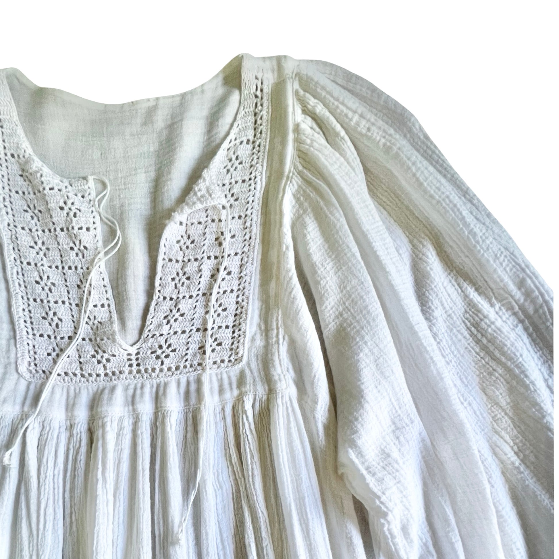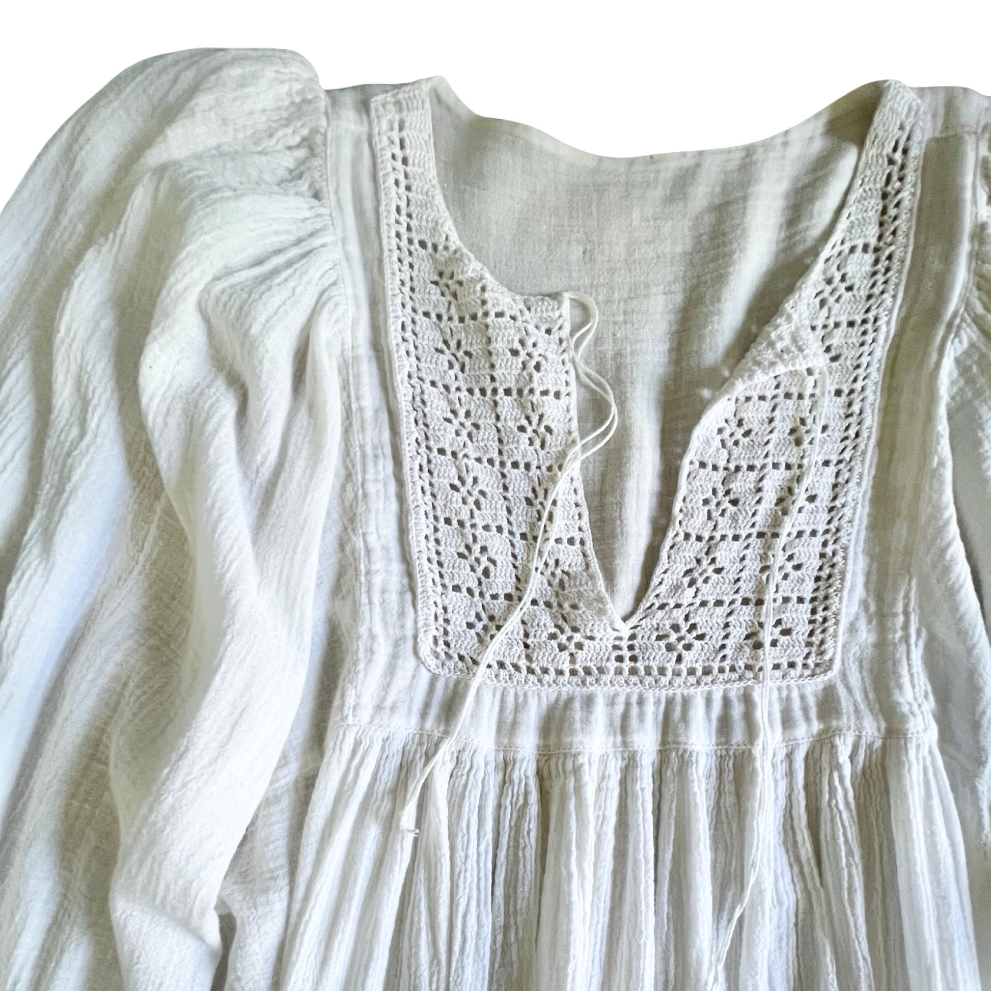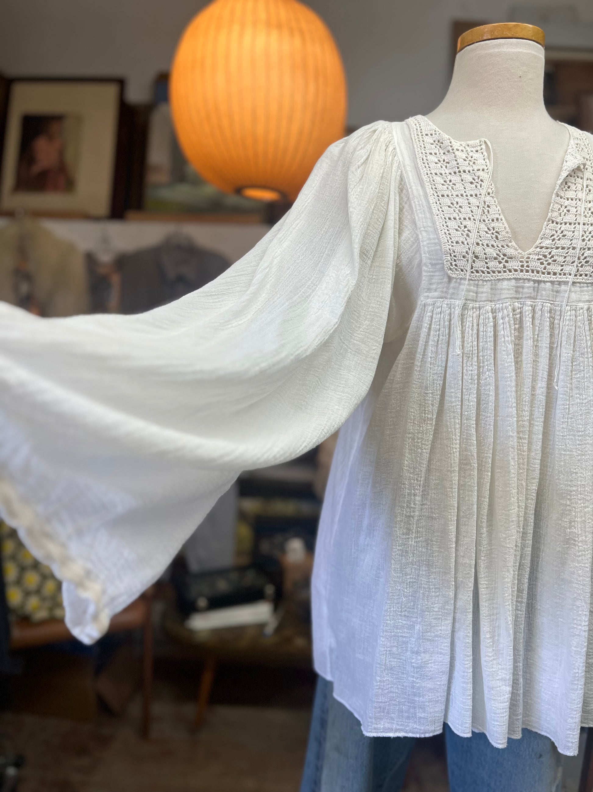 This billowy dreamy goddess angel blouses is a bohemian dream! Vintage sheer and soft cotton, this top features wide angel sleeves and a crochet placket. A couple small spots consistent with age, not even noticeable when wearing because there’s so much flowy fabric! Haven’t come across another one exactly like this. Measures 20” pit to pit approximately a size large.