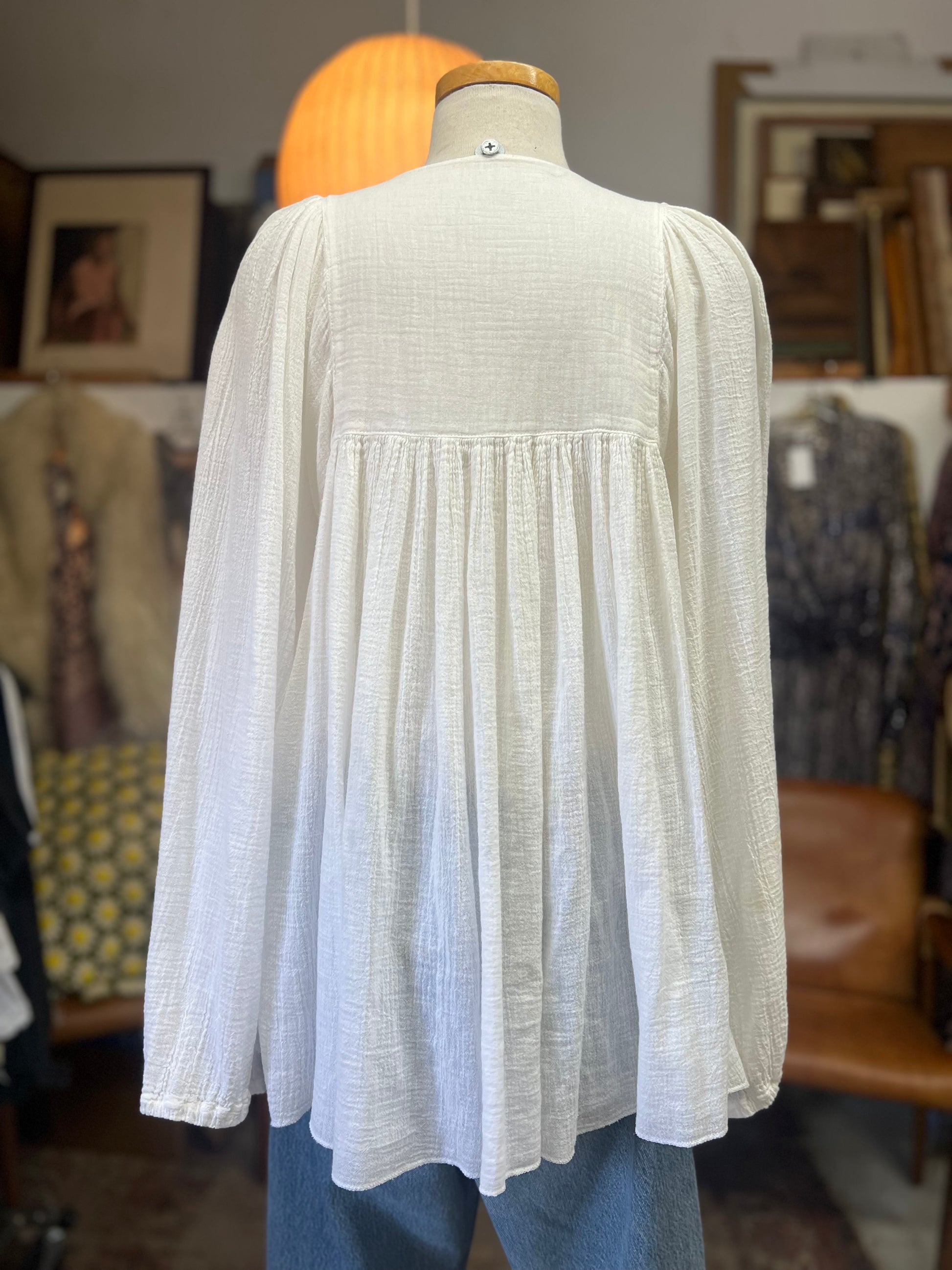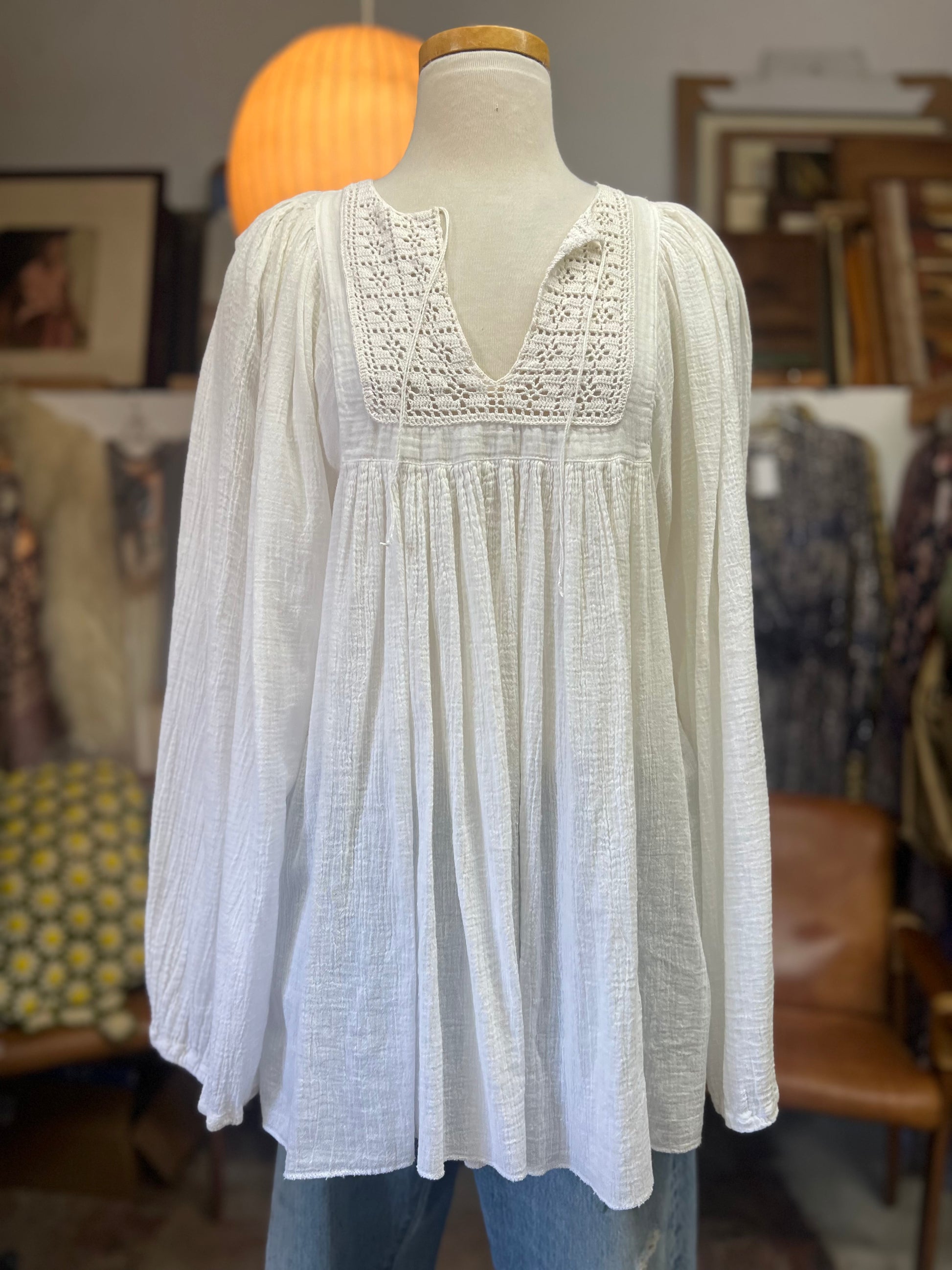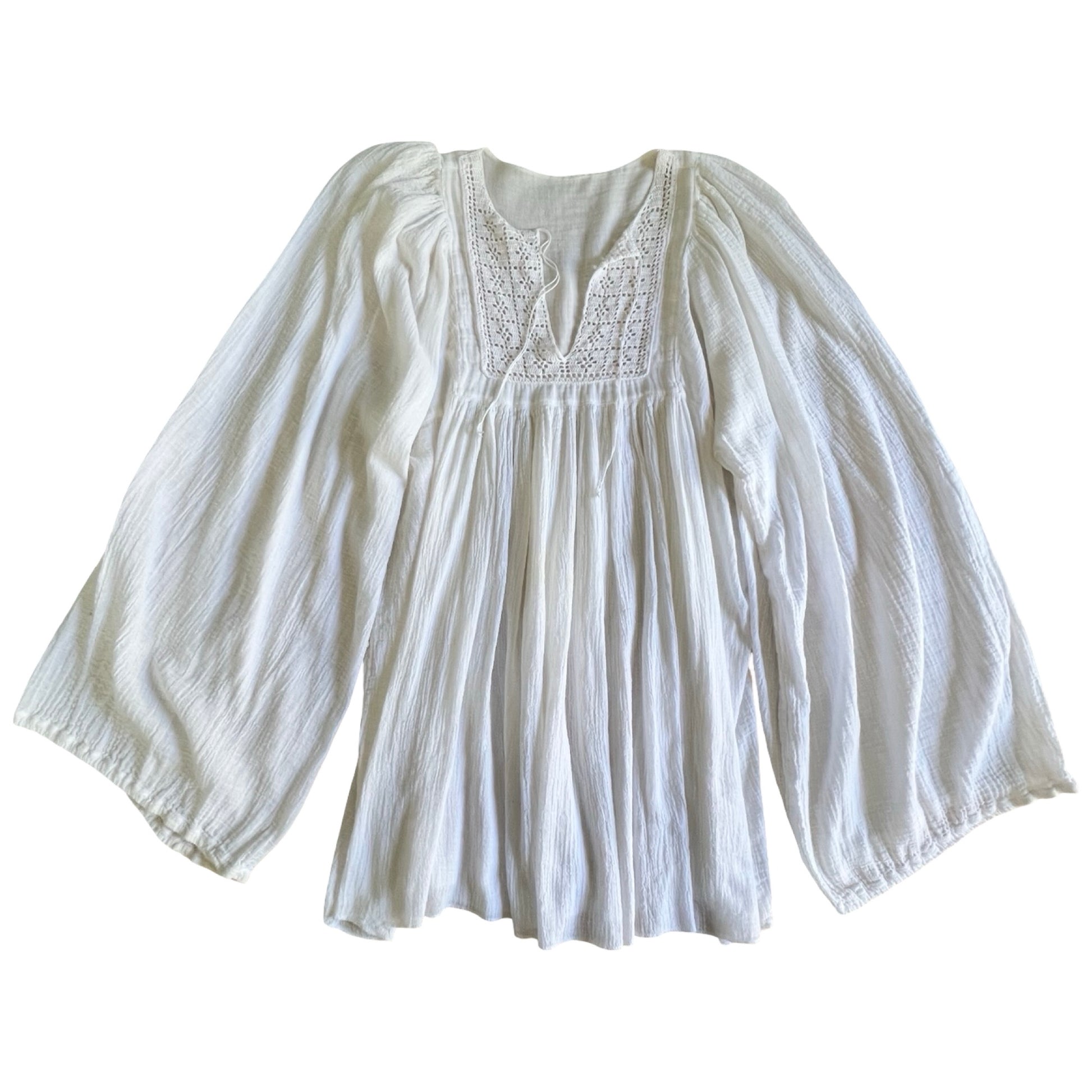 This billowy dreamy goddess angel blouses is a bohemian dream! Vintage sheer and soft cotton, this top features wide angel sleeves and a crochet placket. A couple small spots consistent with age, not even noticeable when wearing because there’s so much flowy fabric! Haven’t come across another one exactly like this. Measures 20” pit to pit approximately a size large.