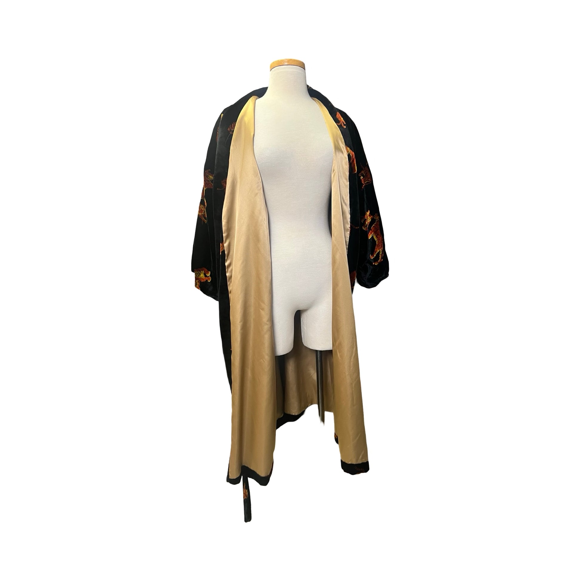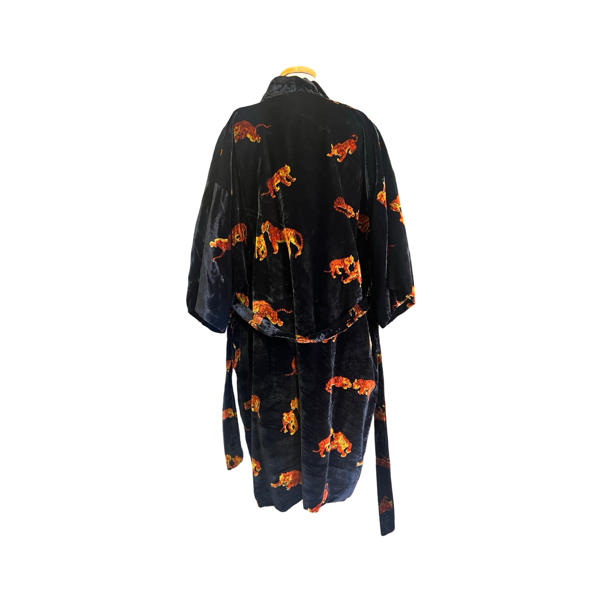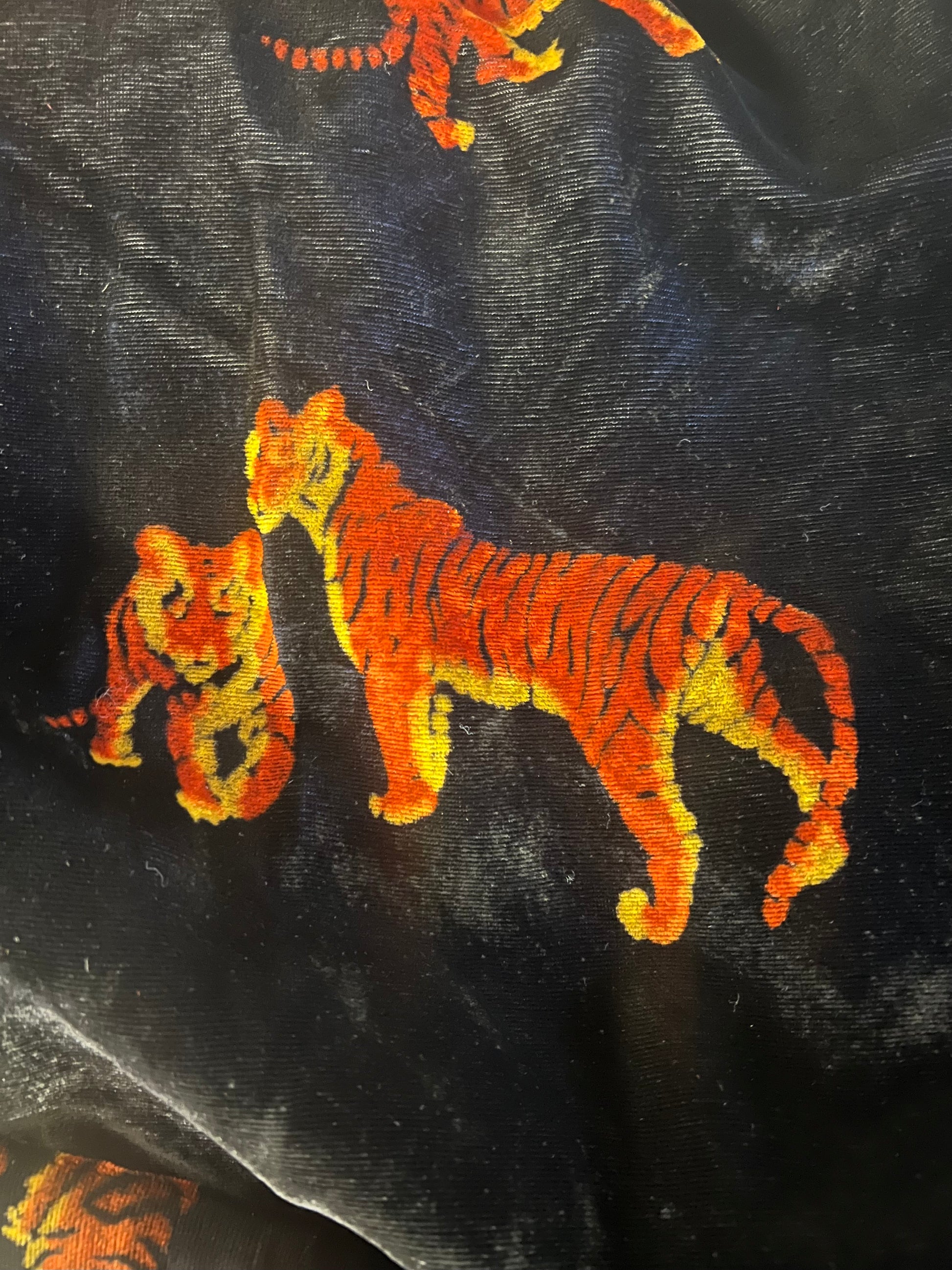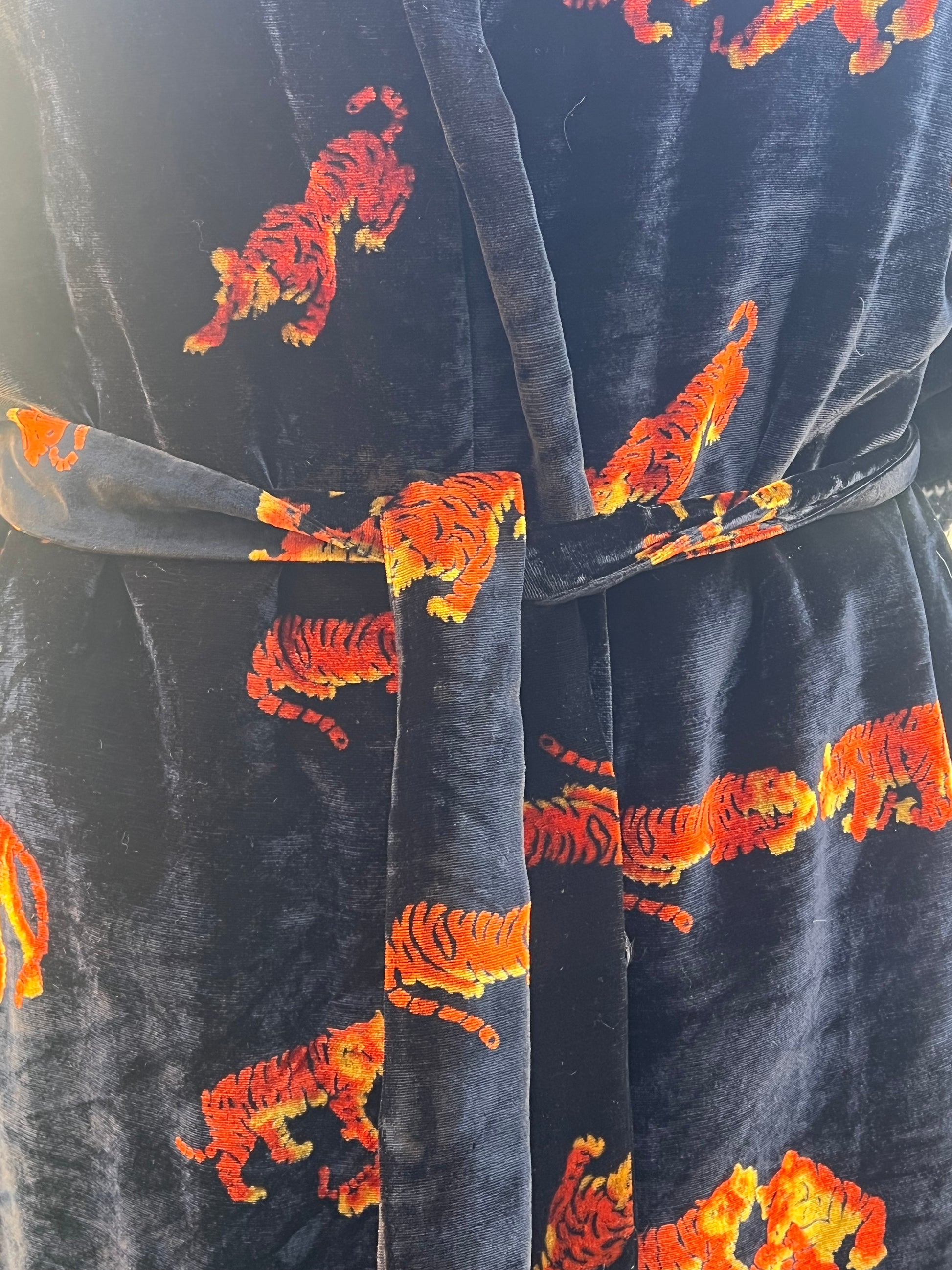 One of the favorites in my collection, this super rare (never seen another Dunhill robe like it) vintage 80’s Dunhill velvet smoking jacket/robe is incredible! All over tigers, fully lined in gold silky acetate, self-belt, 3/4 kimono sleeves, and lined pockets! This piece is a show-stopper and sure to get you noticed. Wear it lounging at home or layer it and wear it out! Soooo good. Approximately men’s size large.