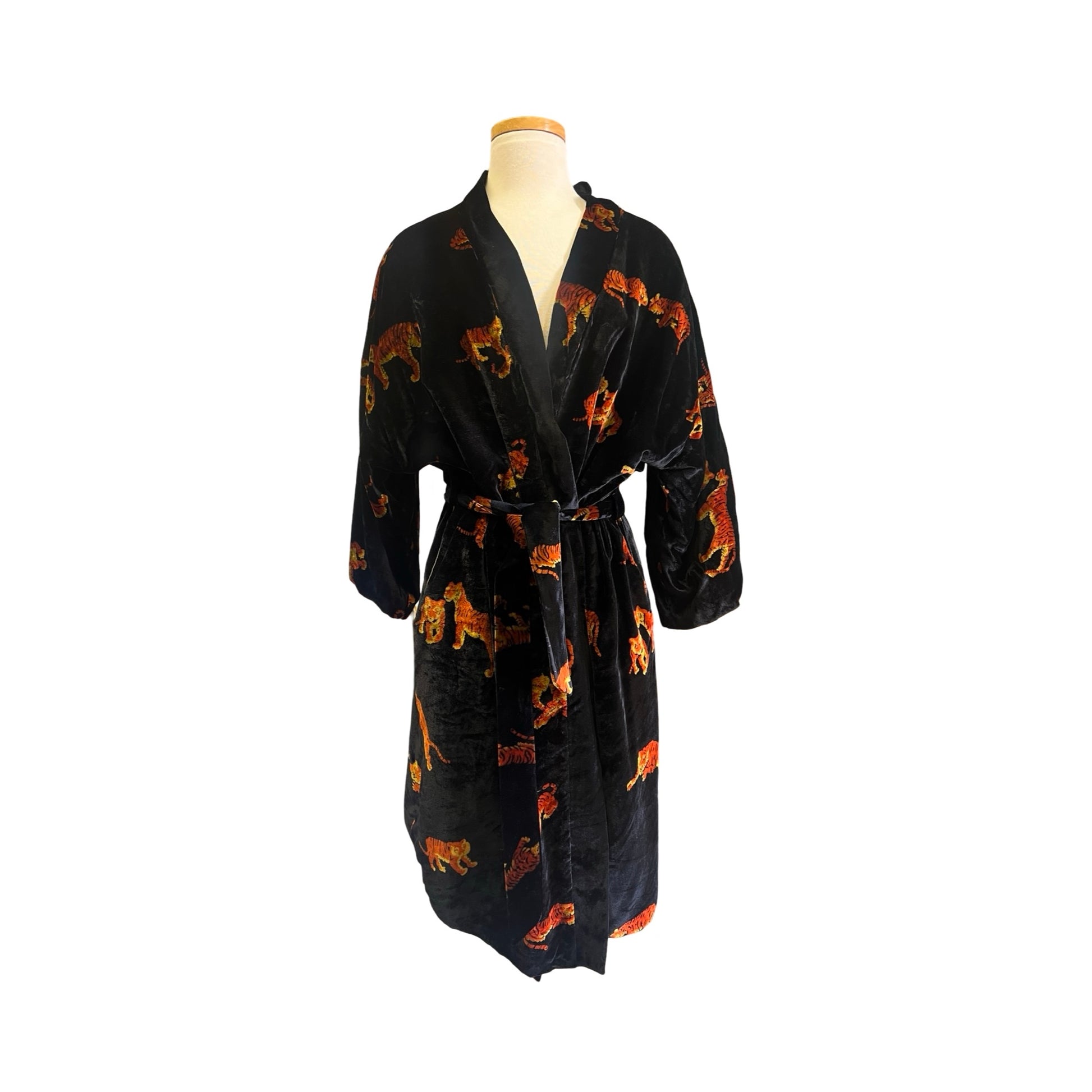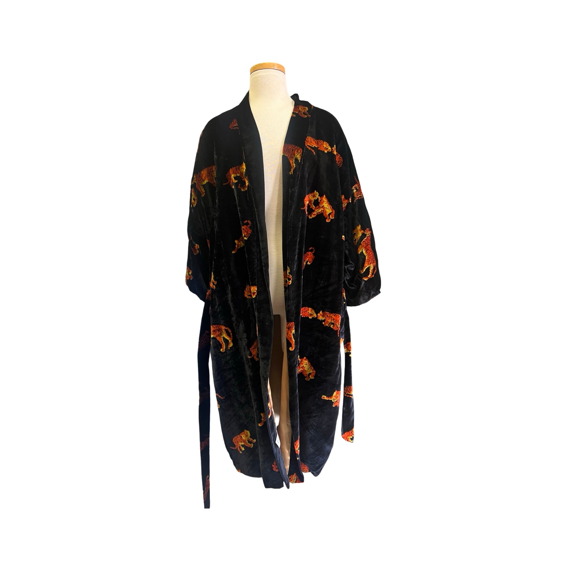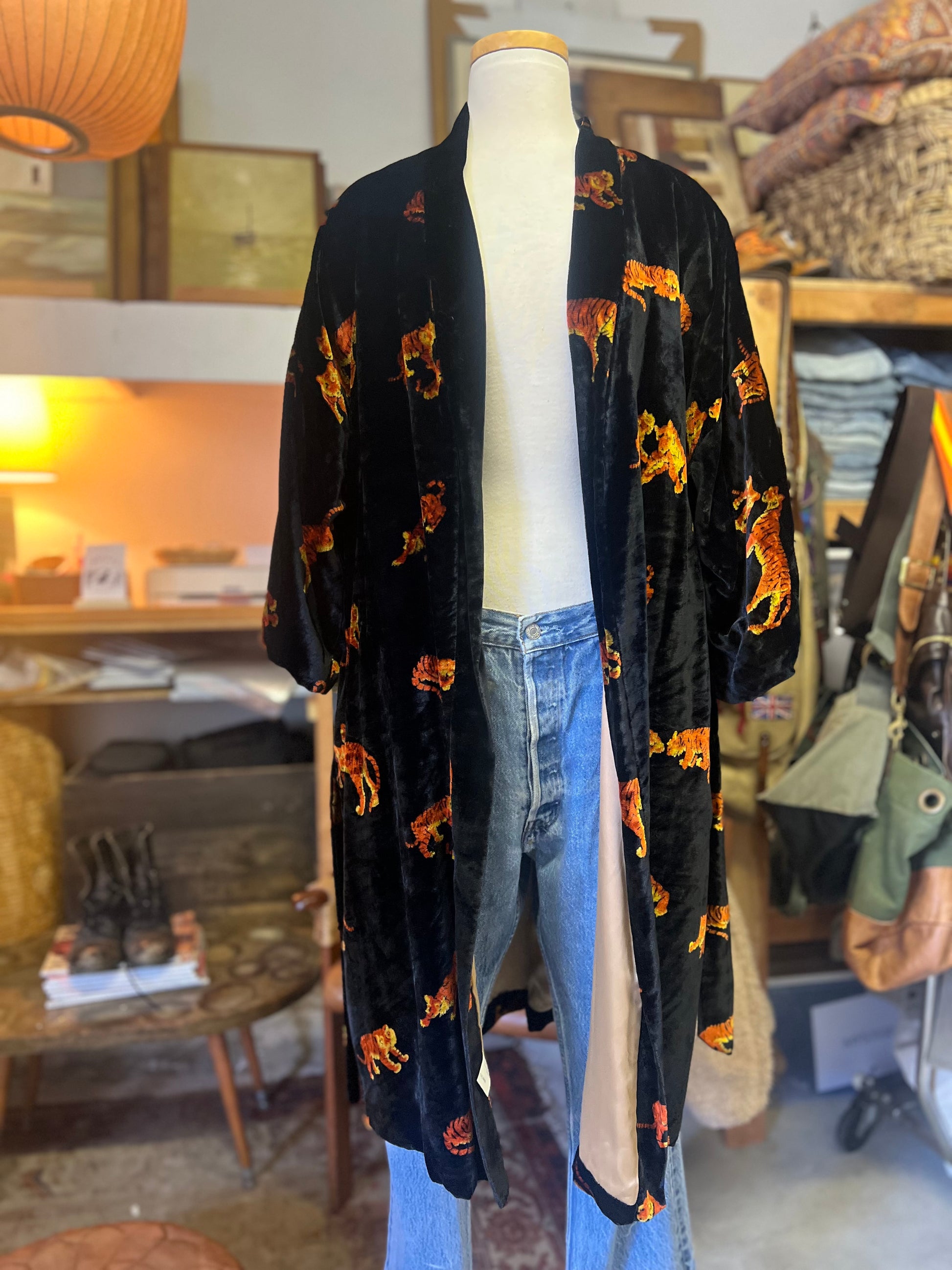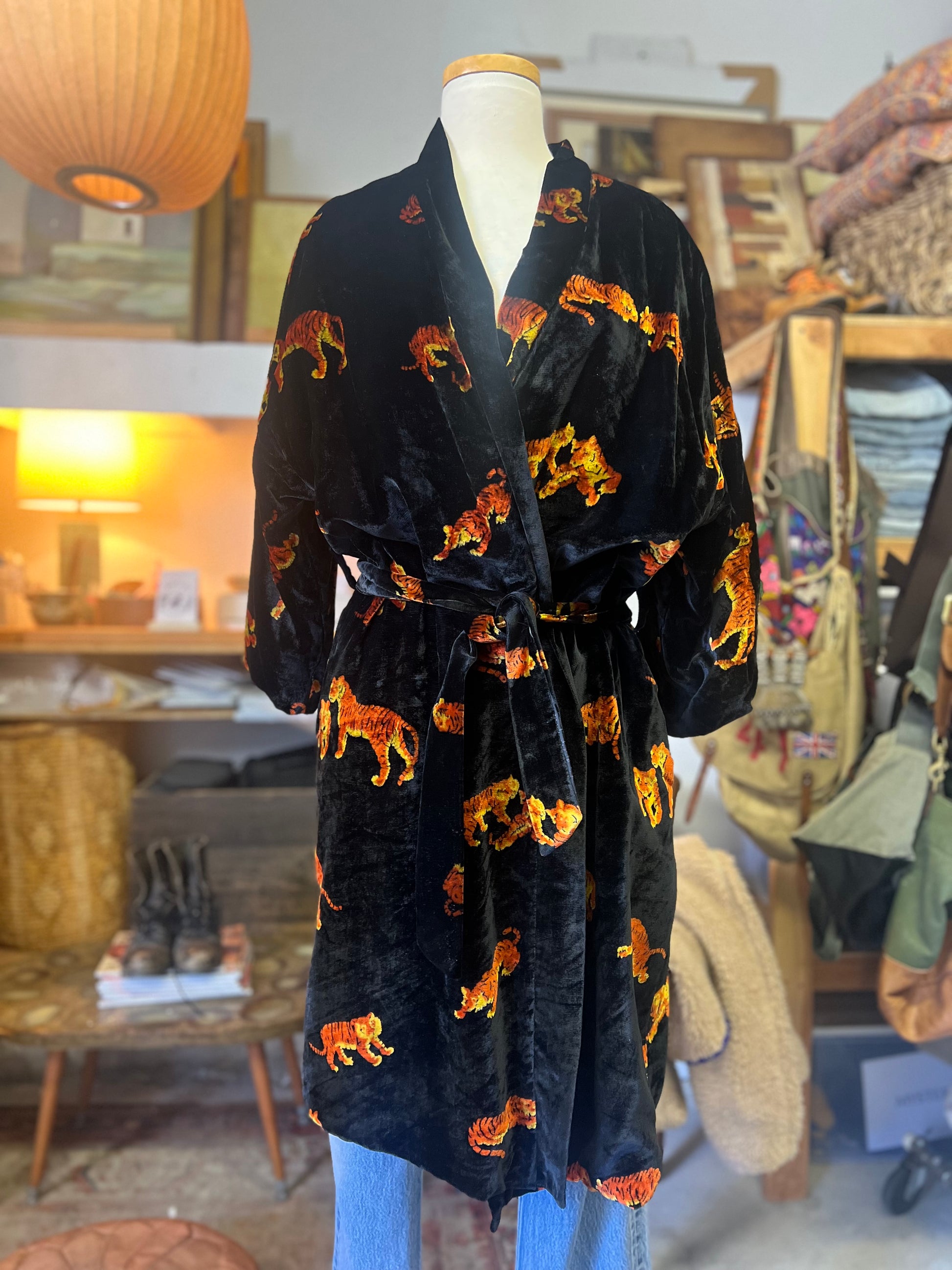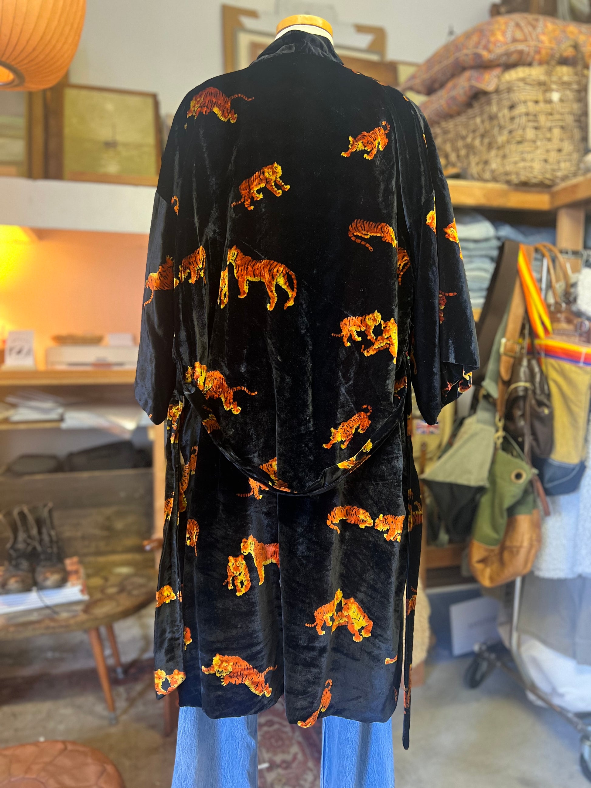 One of the favorites in my collection, this super rare (never seen another Dunhill robe like it) vintage 80’s Dunhill velvet smoking jacket/robe is incredible! All over tigers, fully lined in gold silky acetate, self-belt, 3/4 kimono sleeves, and lined pockets! This piece is a show-stopper and sure to get you noticed. Wear it lounging at home or layer it and wear it out! Soooo good. Approximately men’s size large.