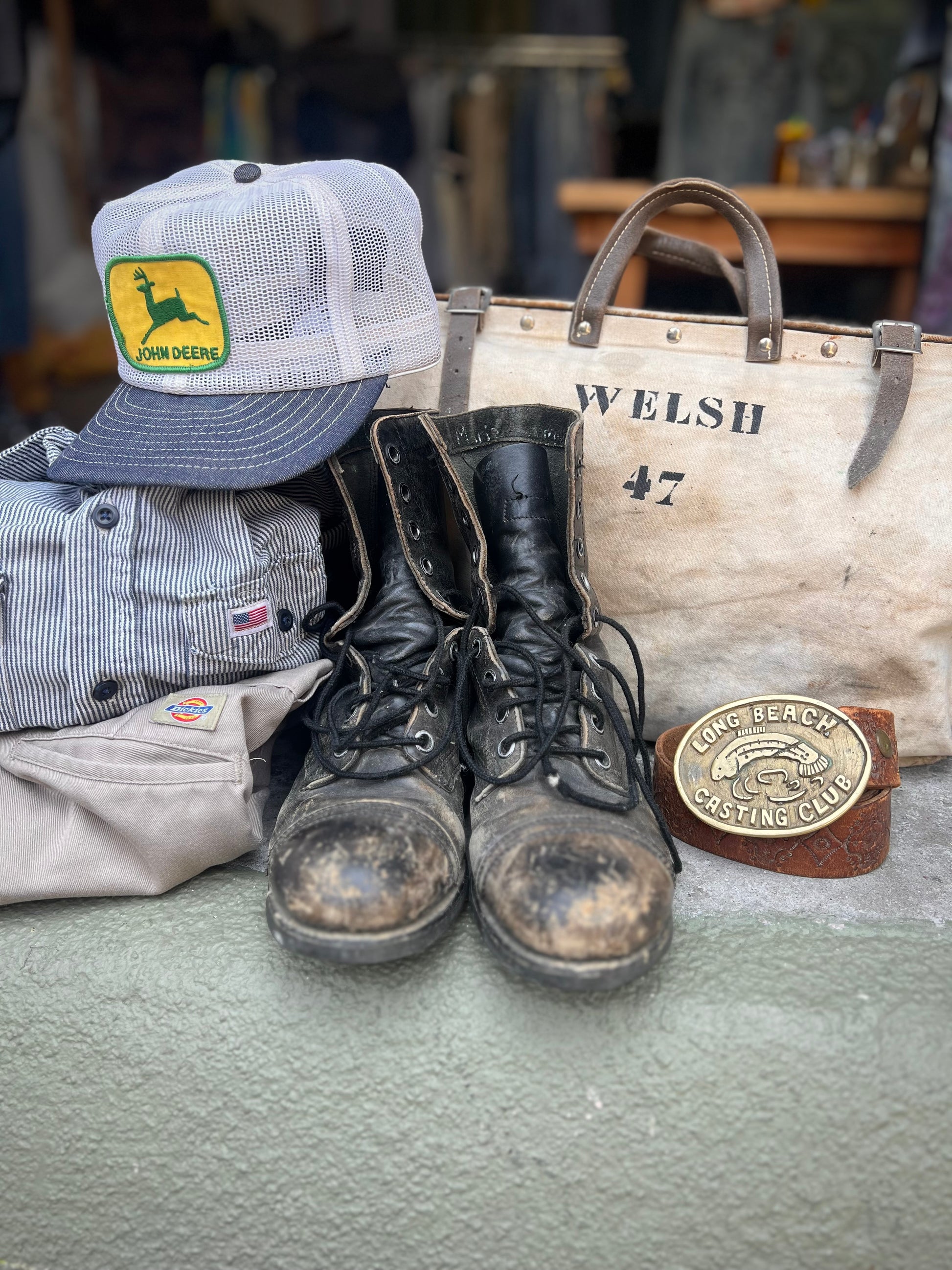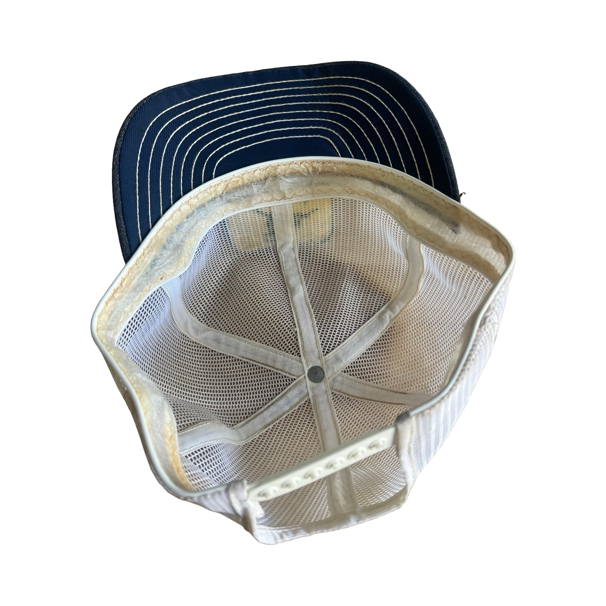Rare vintage 1990’s John Deere snapback mesh and denim trucker hat with patch. Good condition but definitely worn with staining to inside hat brim. Bill is soft, mesh is firm, hat retains shape. This is a hard to find classic!