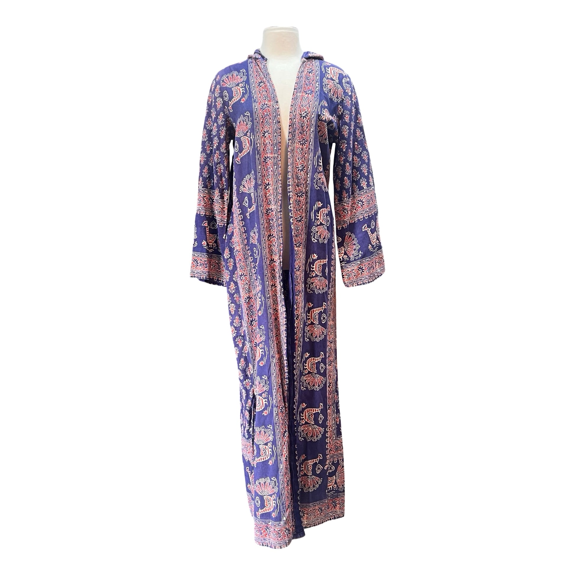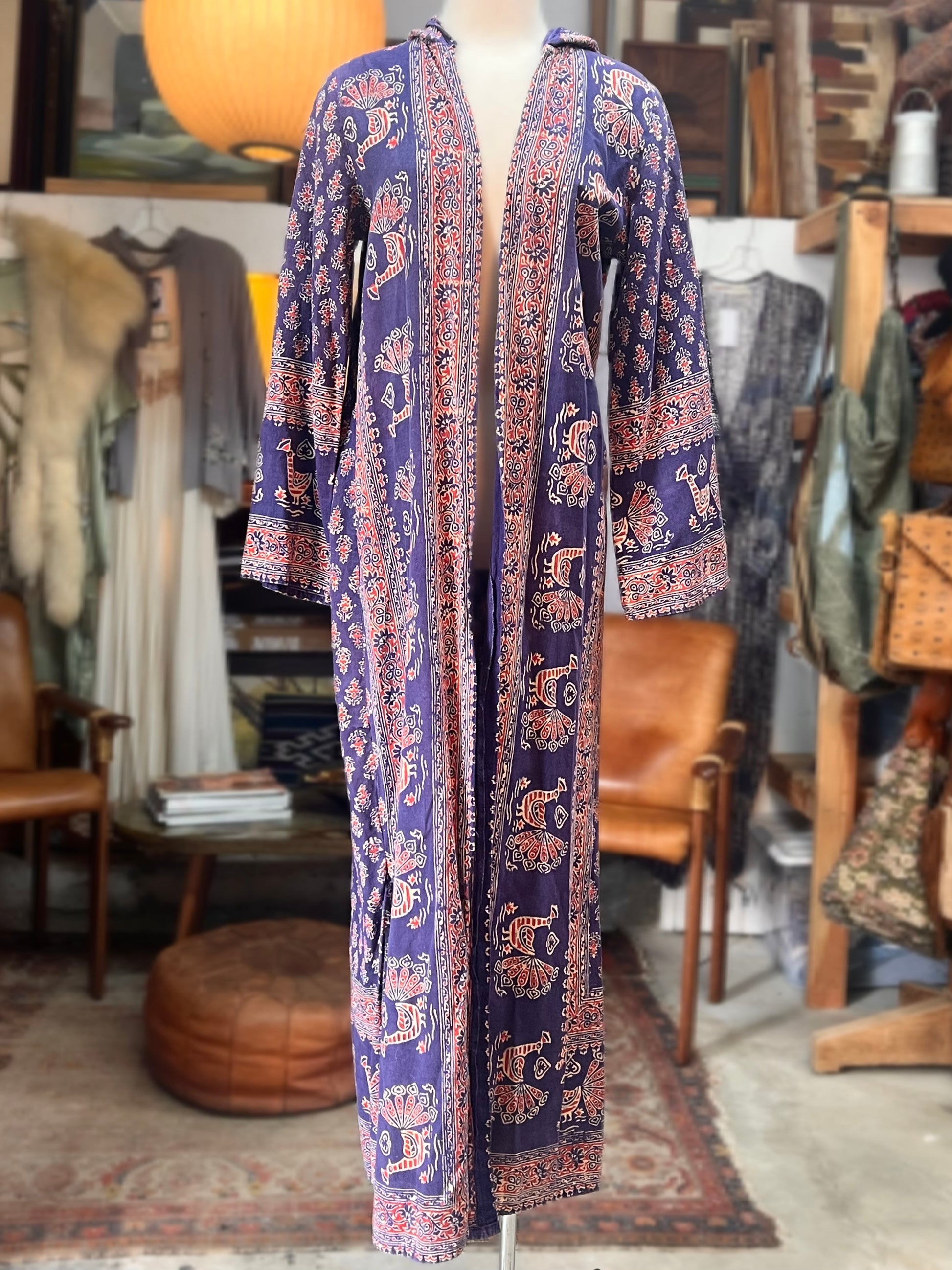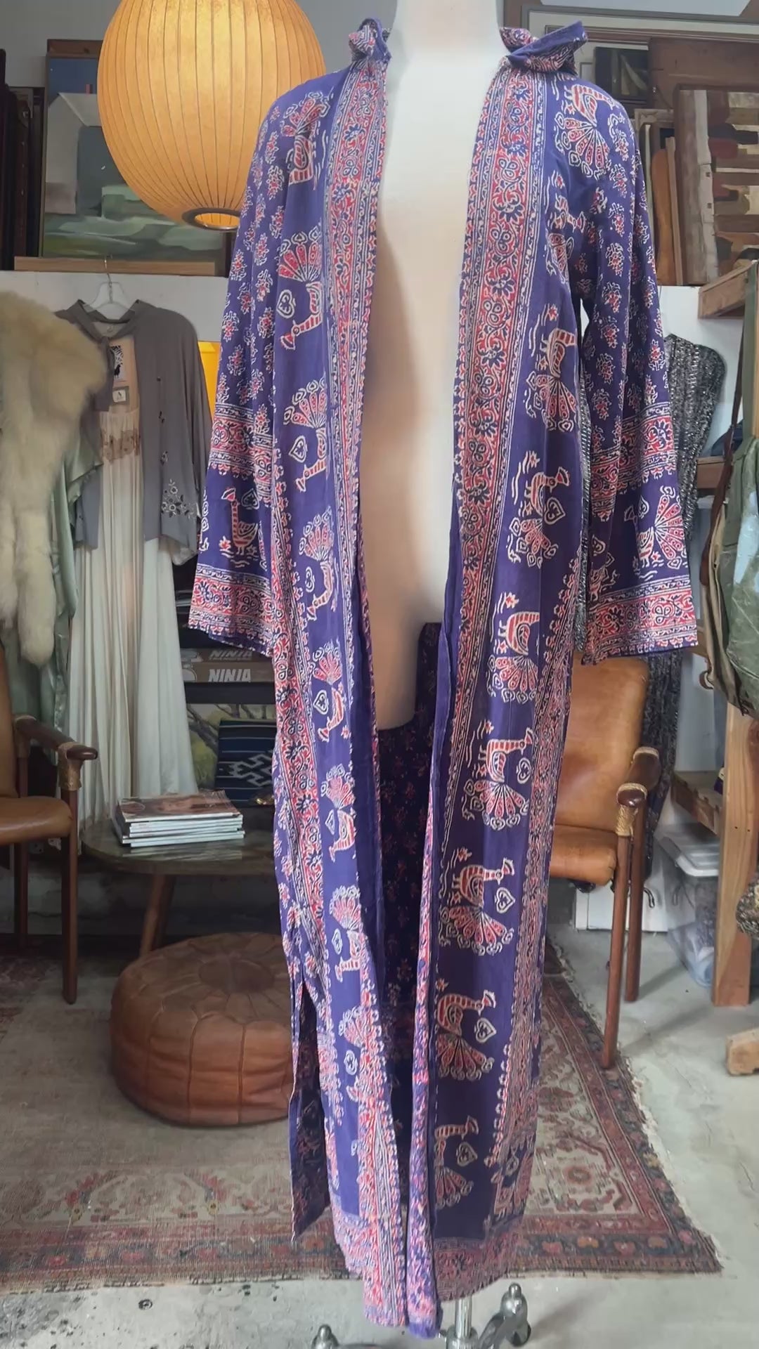 Rare silhouette in a vintage India block print piece…this 70’s robe features an oversized hood, open front with no closure, and a beautiful purple and pink batik peacock design. A very special and rare piece! Made in India.