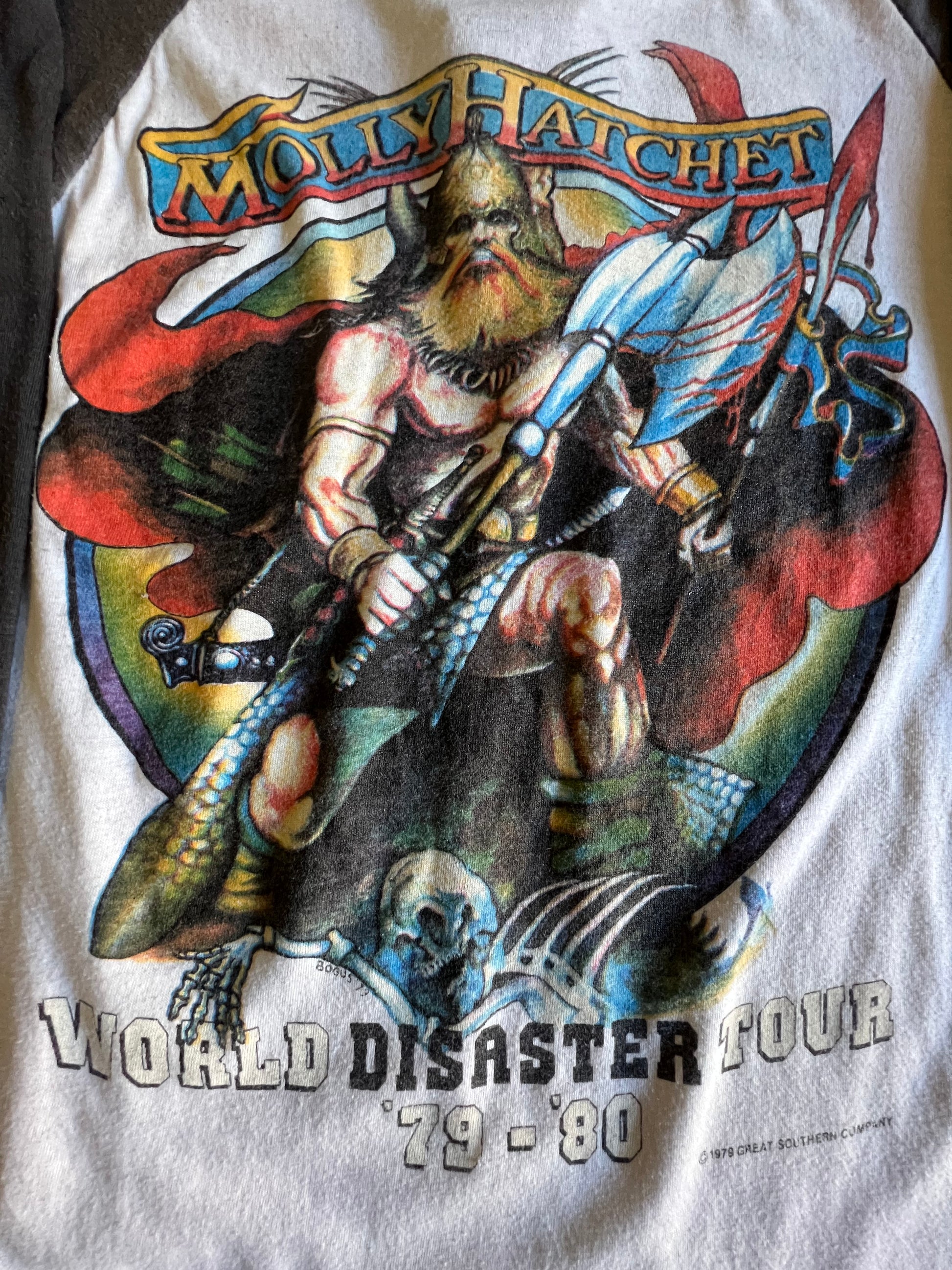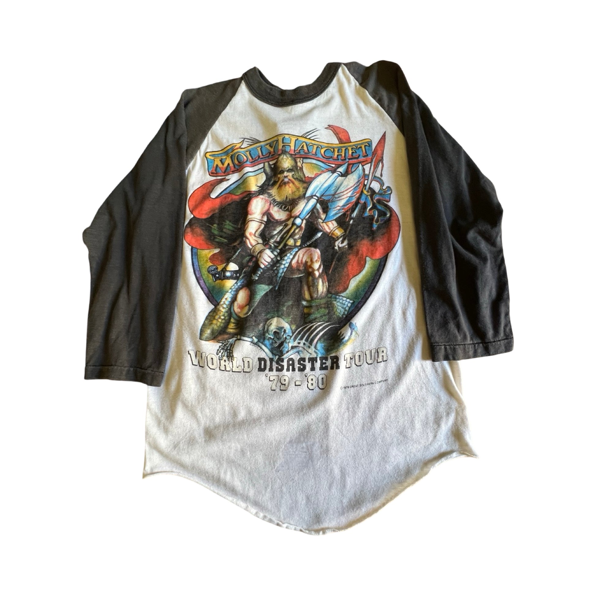 Rare vintage Molly Hatchet World Disaster Tour 1979/1980 single stitch raglan sleeve baseball t-shirt. Soft and thin and well worn, raw hem, no tag, measures 17” pit to pit and 24” top to bottom. Small spot front right arm area (see pics). Copyright 1979 Great Southern Company.