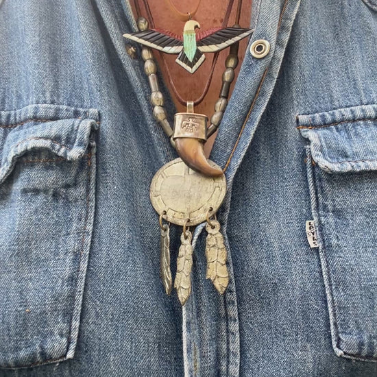 Absolutely stunning and rare vintage Native American Zuni style Thunderbird pendant. Lightweight on wood backing with hand carved onyx, coral, mother of pearl, and turquoise. Add it to a sterling chain or keep it on the deerskin leather included. I’ve never seen another one exactly like this handmade beaut! Measures 3” wide by 1.25” tall (not including bale).