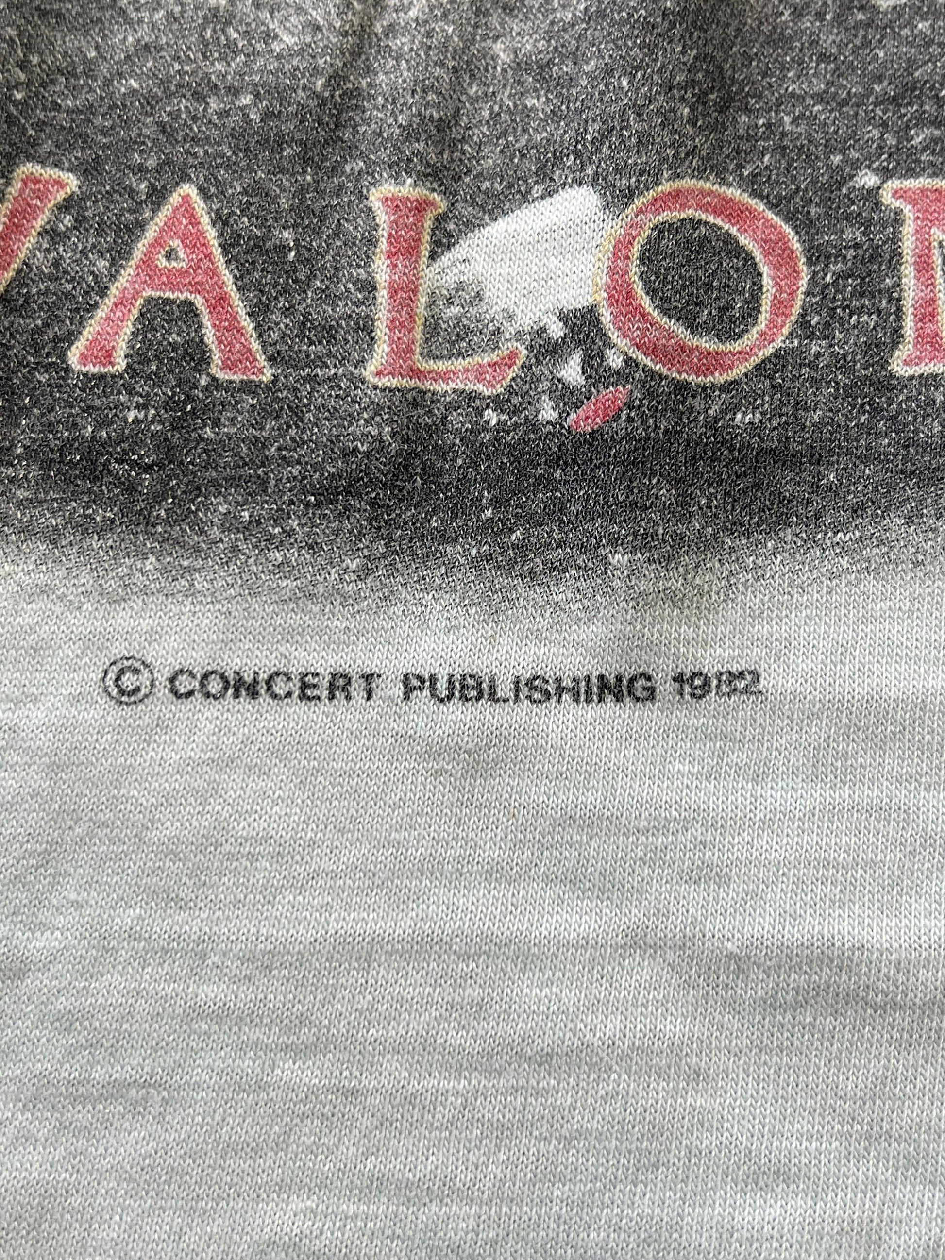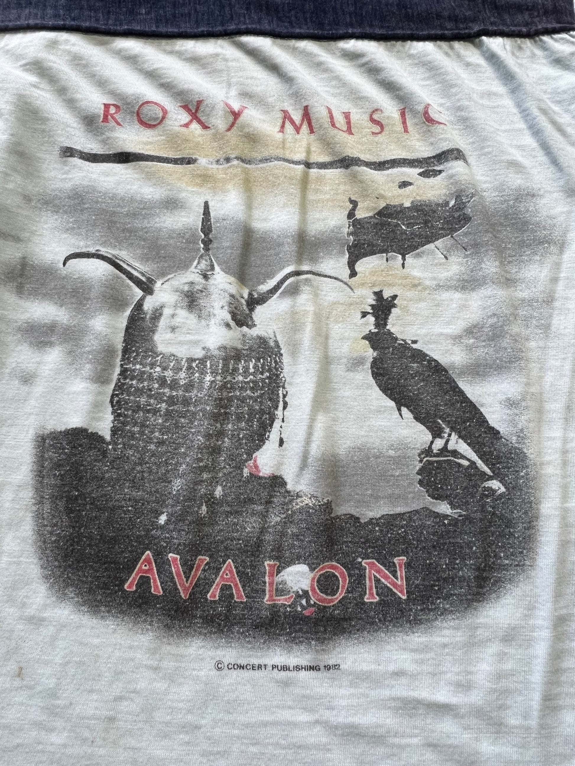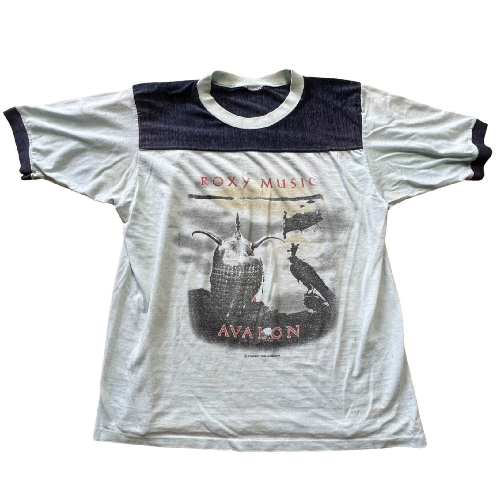 Super rare Roxy Music Avalon European Tour 1982 shirt….never seen another one like it! Copyright Concert Publishing 1982 it bottom of graphic. Some gold paint (?) spots near the bottom but otherwise great vintage condition. No tag but measures 19” pit to pit and 24” top to bottom. This is a rare Roxy Music beauty.