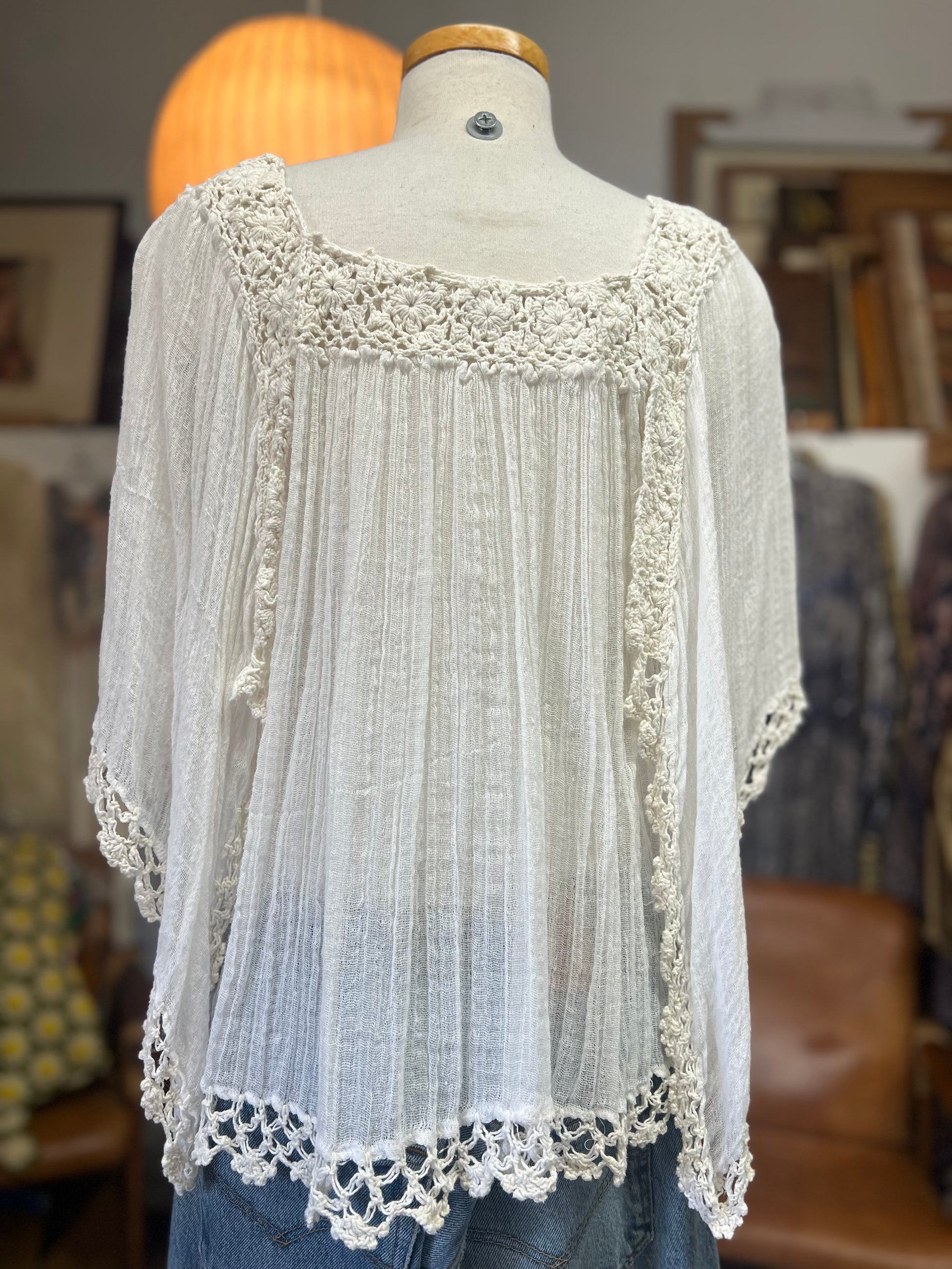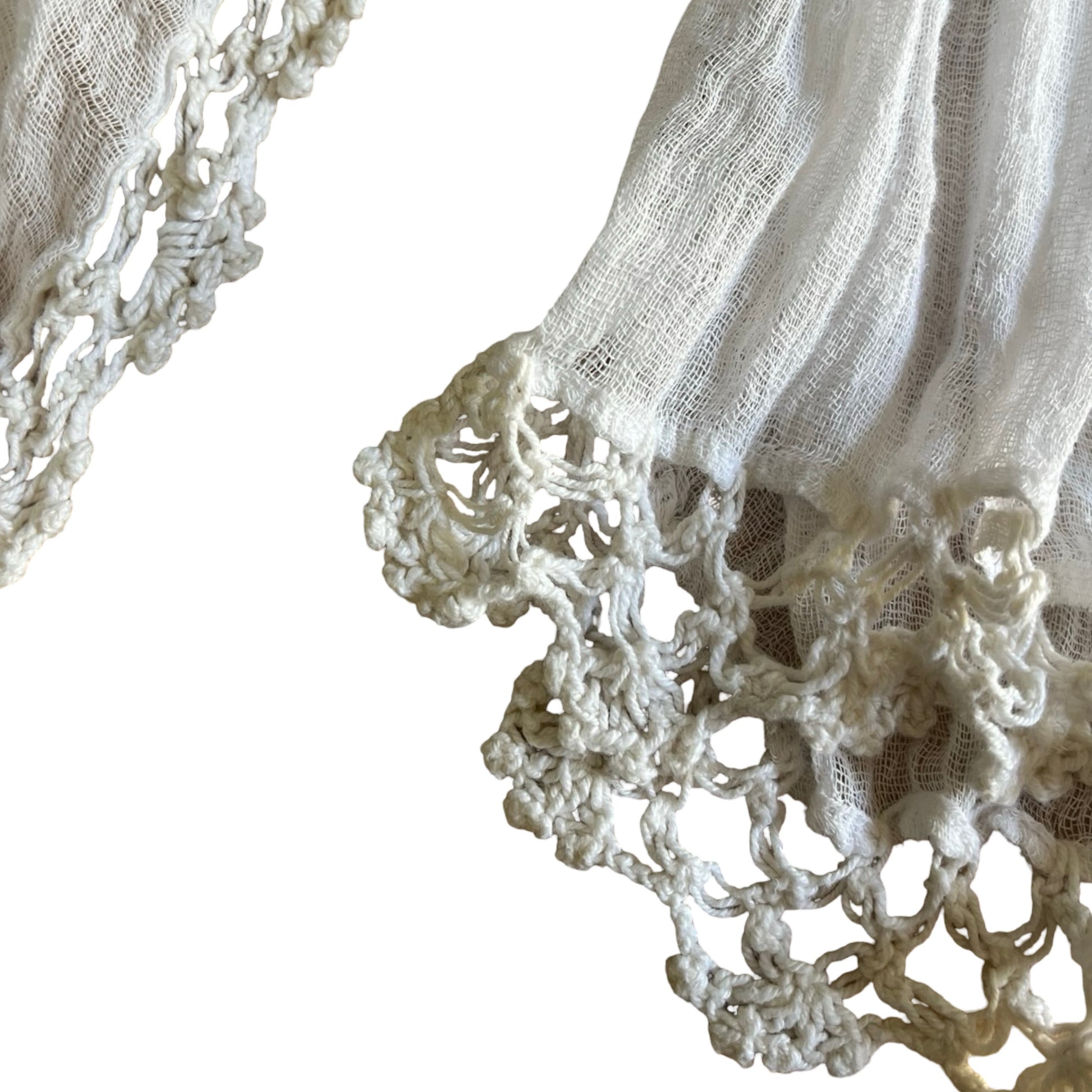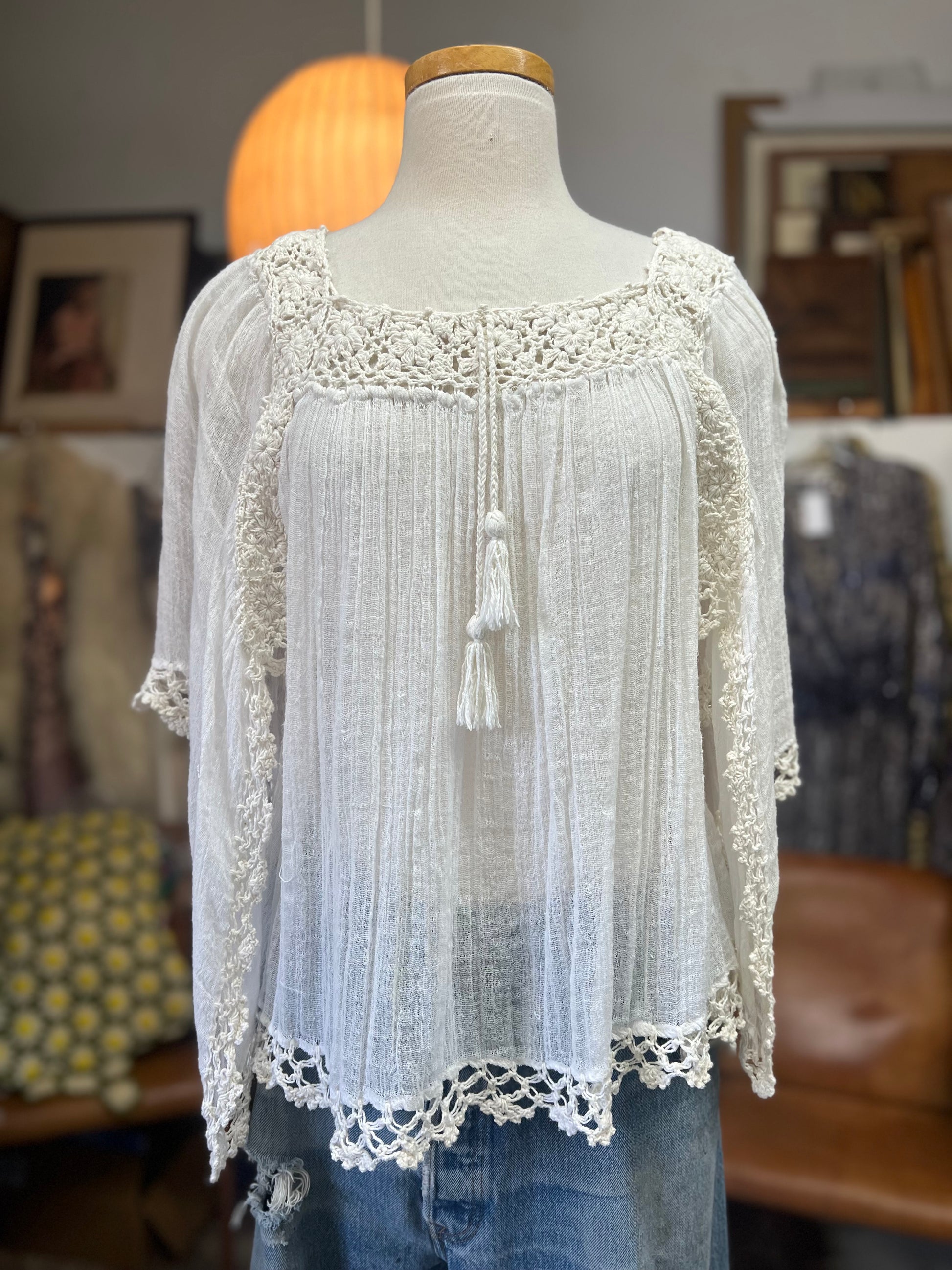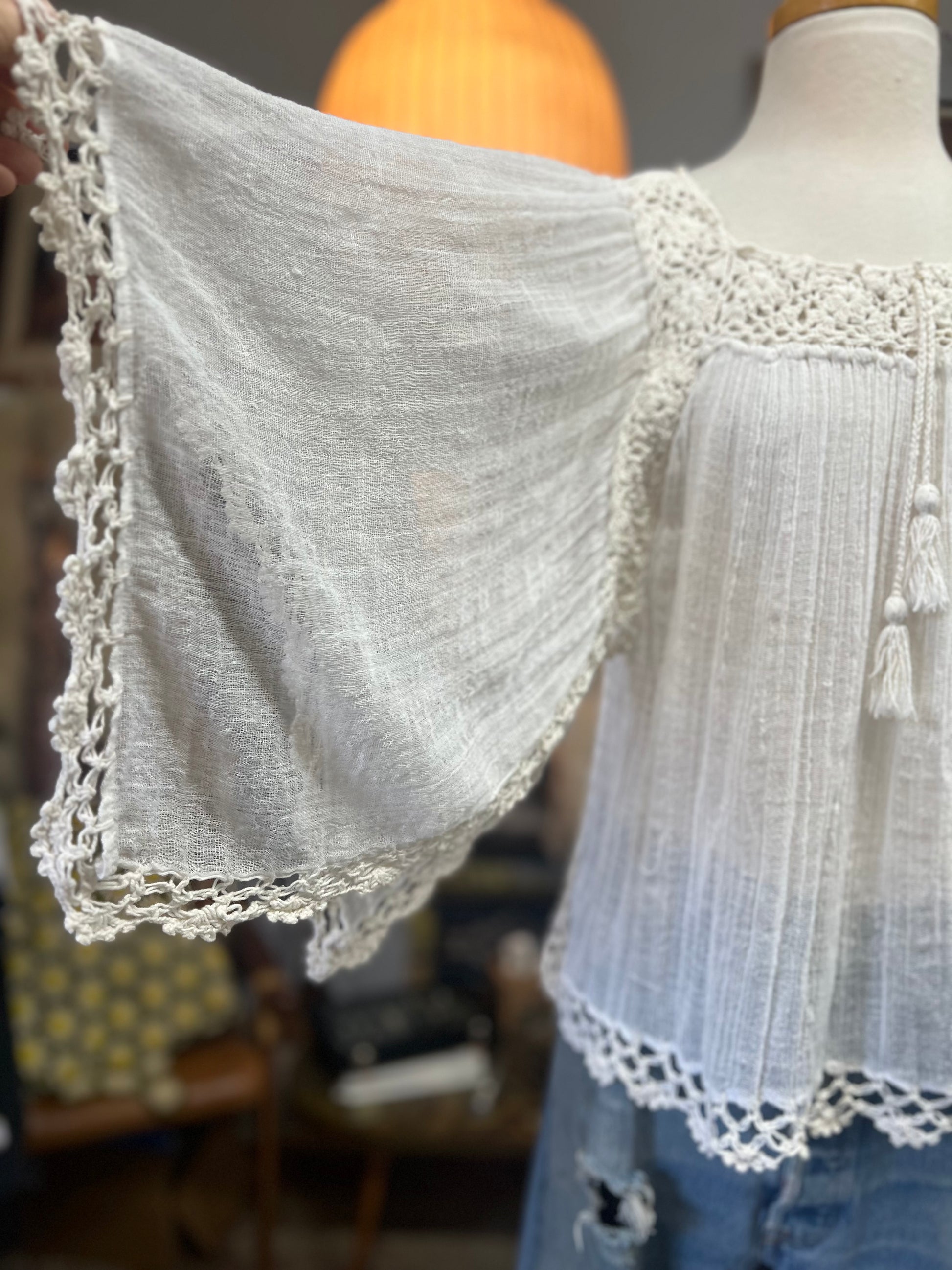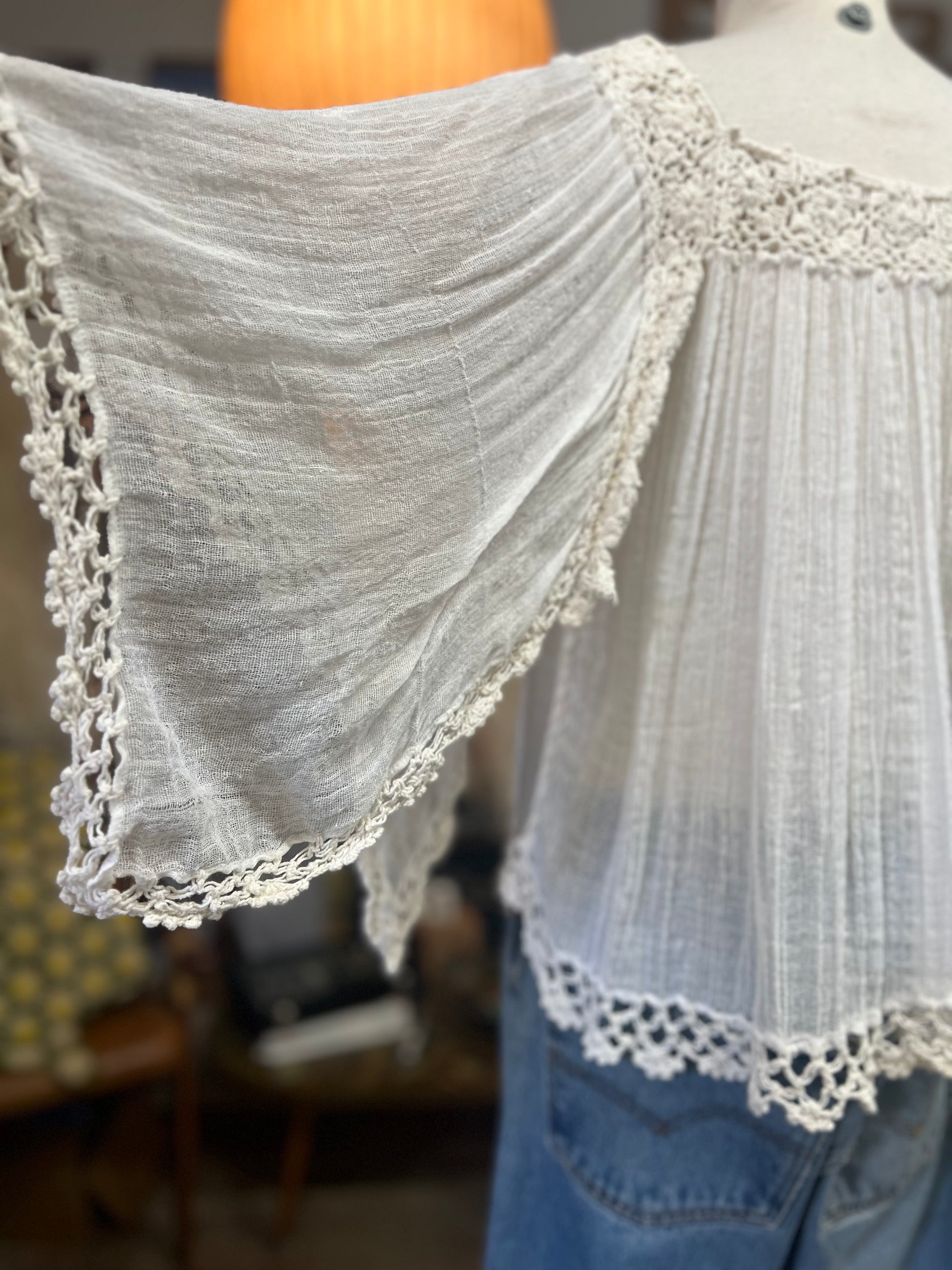 This rare ethereal dream of a top is stunning, I’ve never seen another one exactly like it! Super sheer and paper thin billowy gauze with gorgeous macrame trim throughout and tassels in front. Measures 17” across chest, probably best suited for a small or extra small for desired loose fit. She’s a delicate beauty.
