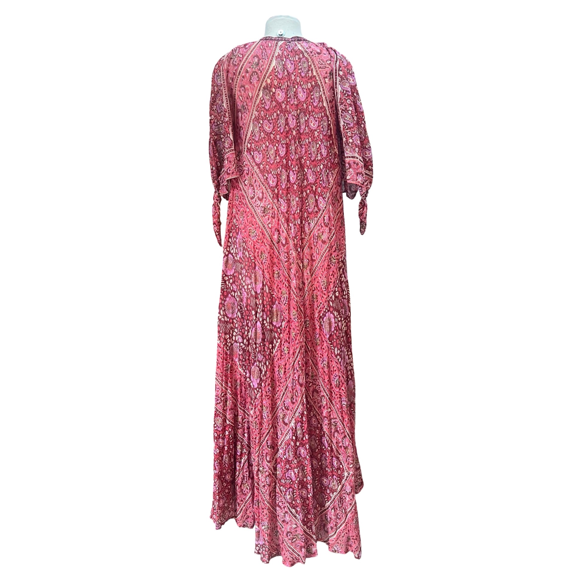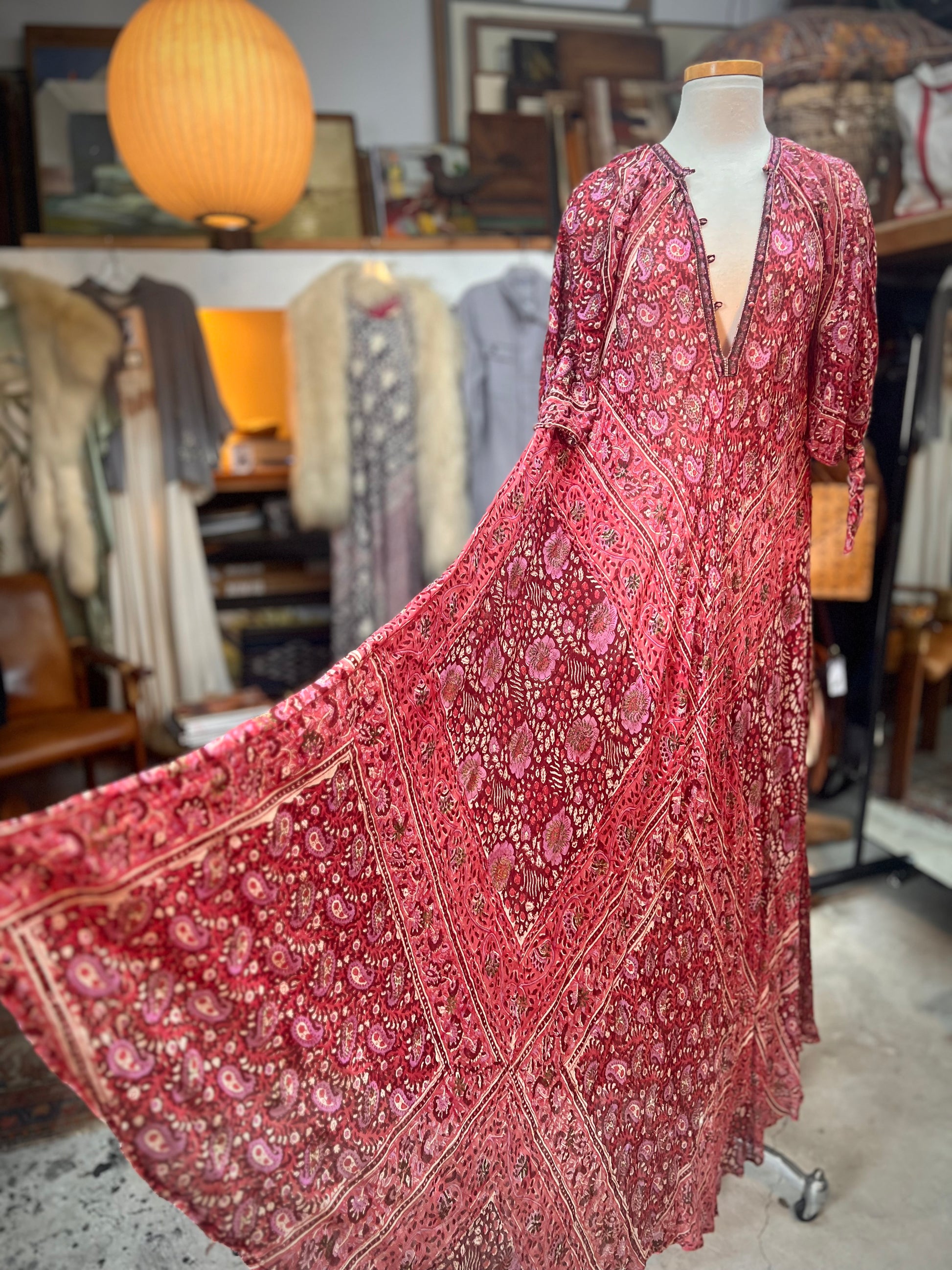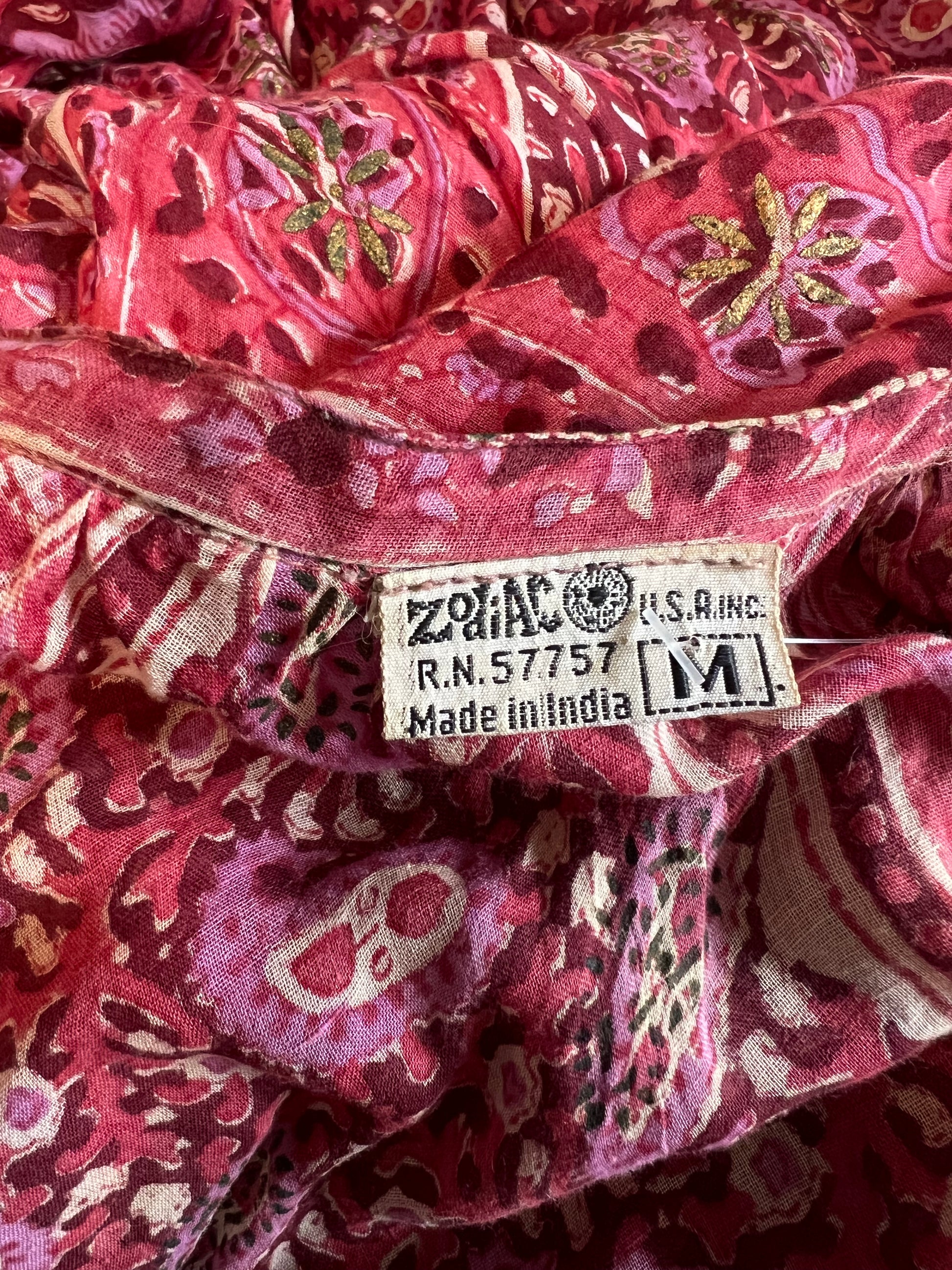 Absolutely stunning 70’s Zodiac block print maxi dress! Rare pink colorway, covered button placket, angel kimono sleeves, and TONS of soft sheer flowy cotton gauze. Small hole on right arm (pictured) not noticeable when wearing (but should get a patch). Tag size medium measures 19” pit to pit. A rare and stunning bohemain dream of a dress!