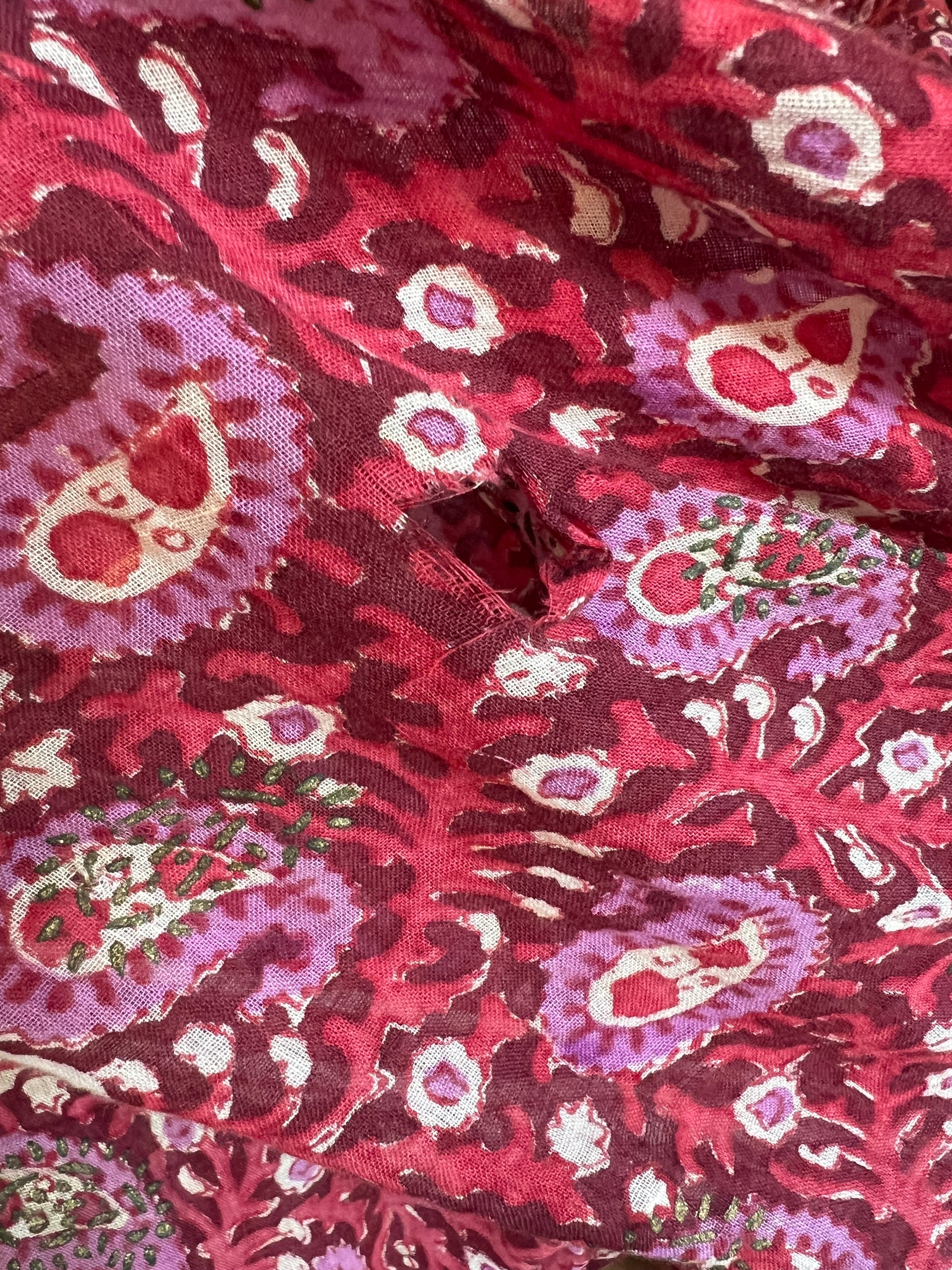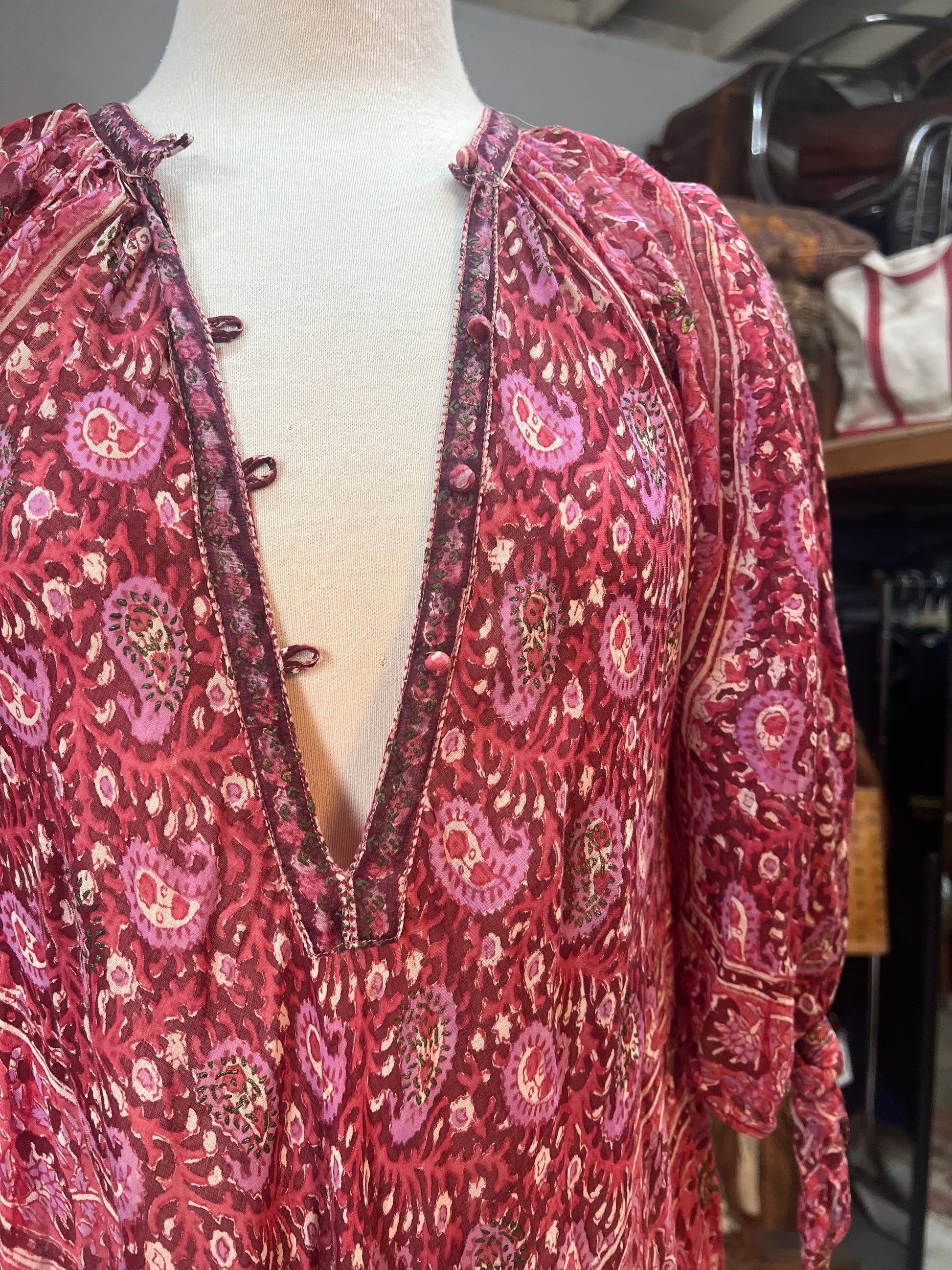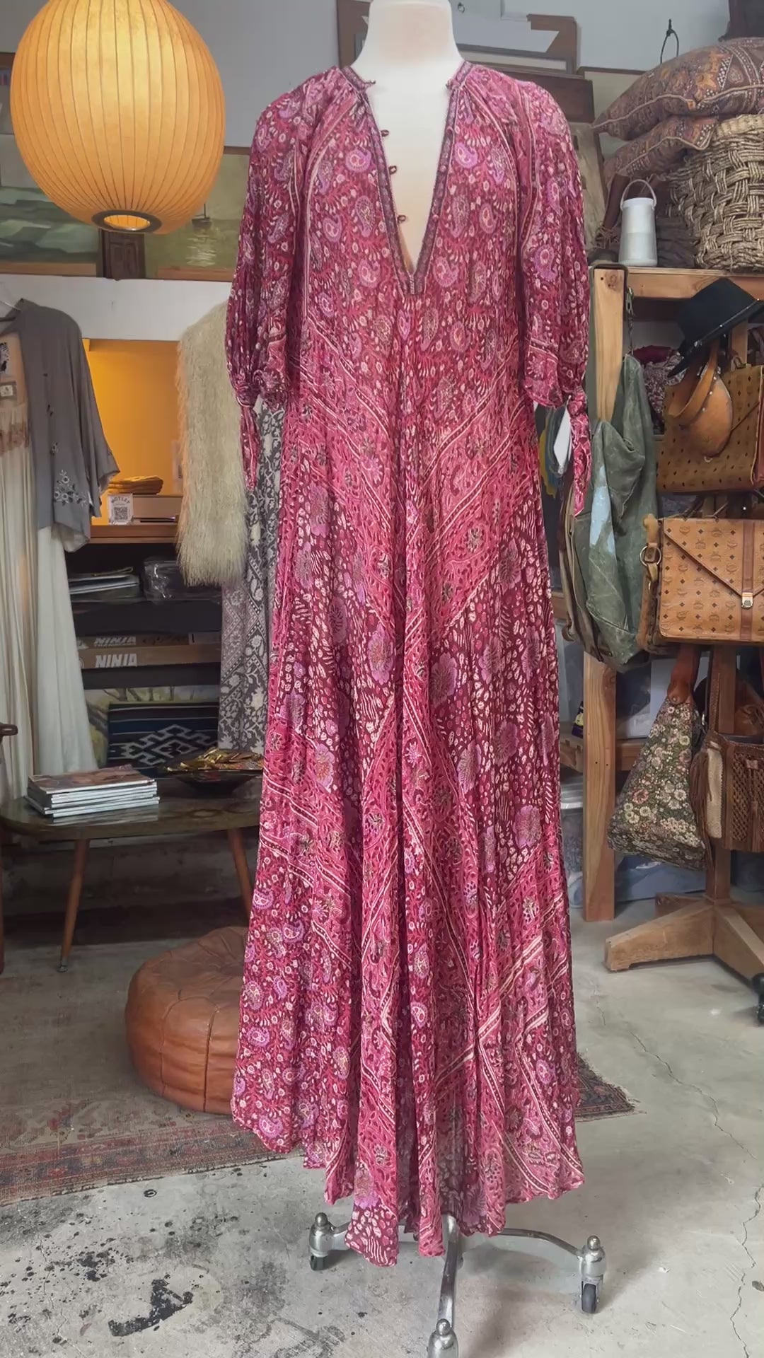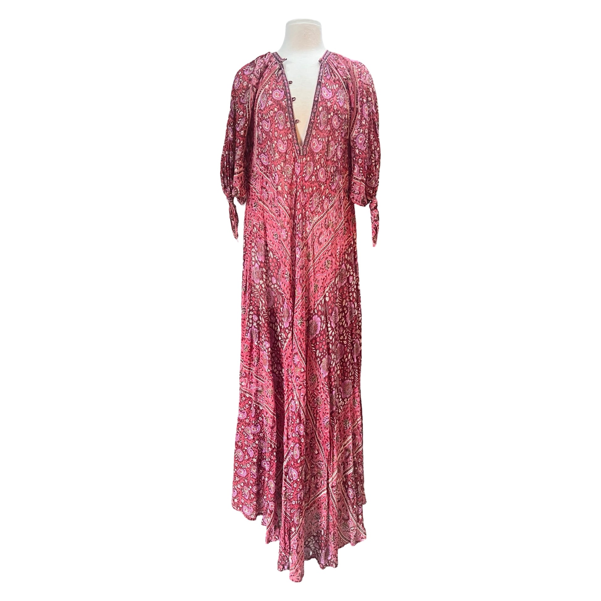 Absolutely stunning 70’s Zodiac block print maxi dress! Rare pink colorway, covered button placket, angel kimono sleeves, and TONS of soft sheer flowy cotton gauze. Small hole on right arm (pictured) not noticeable when wearing (but should get a patch). Tag size medium measures 19” pit to pit. A rare and stunning bohemain dream of a dress!