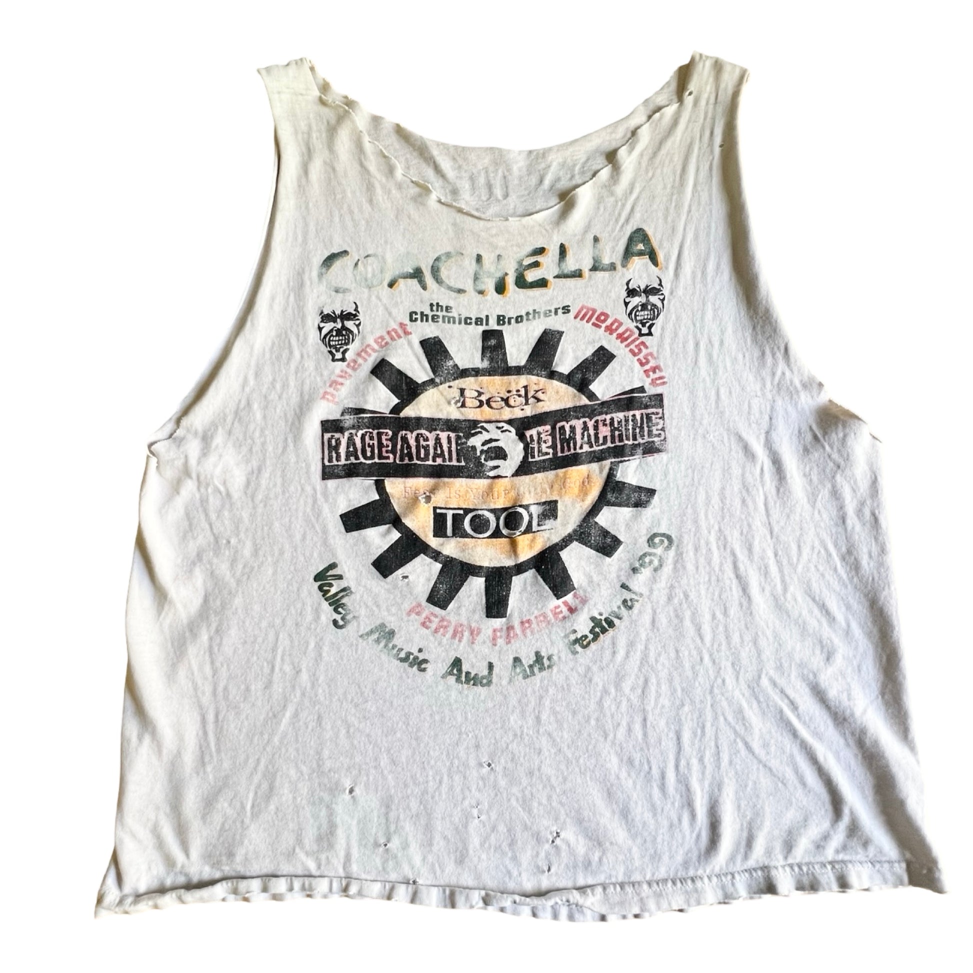 Super rare Coachella cut-off oversized tank from the very first year of the festival!!! Featuring artists Perry Farrell, Rage Against The Machine, Morrissey, Pavement, Beck Tool, Chemical Brothers. Amazing front and back graphics, faded worn and thrashed. Tank fits oversized and measures 23” across at widest part. An incredible piece of Coachella history!!