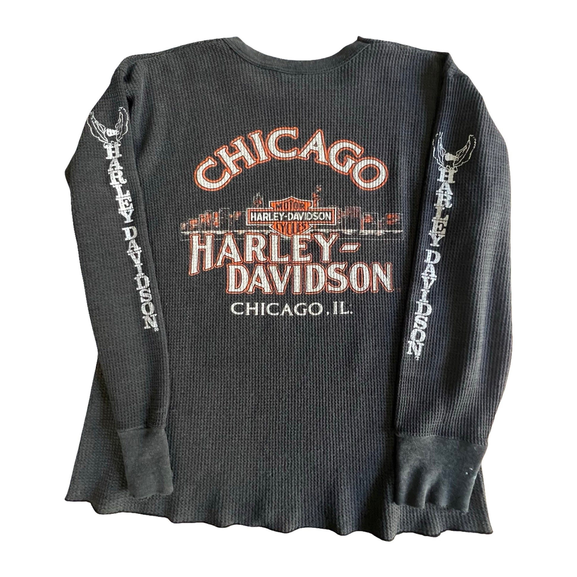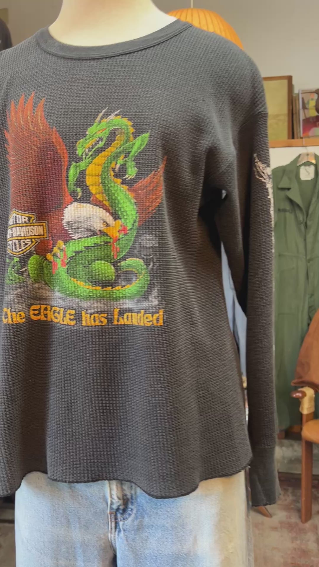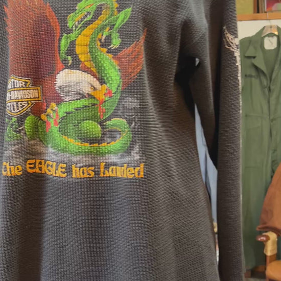 Another grail Harley Davidson piece! Original 1978 (copyright mark) The Eagle Has Landed thermal. These are very rare, especially in a larger size! This one is next level insane. Beautiful allover fading, gorgeous cracked graphics, with front, back, AND sleeve hits!! Distressing throughout, consistent with age with some paint and threadbare spots. Back graphic Chicago, IL. Handtex tag size XXL, measures 21” pit to pit and 24” top to bottom. What an extremely rare and incredible piece of Harley Davidson history!