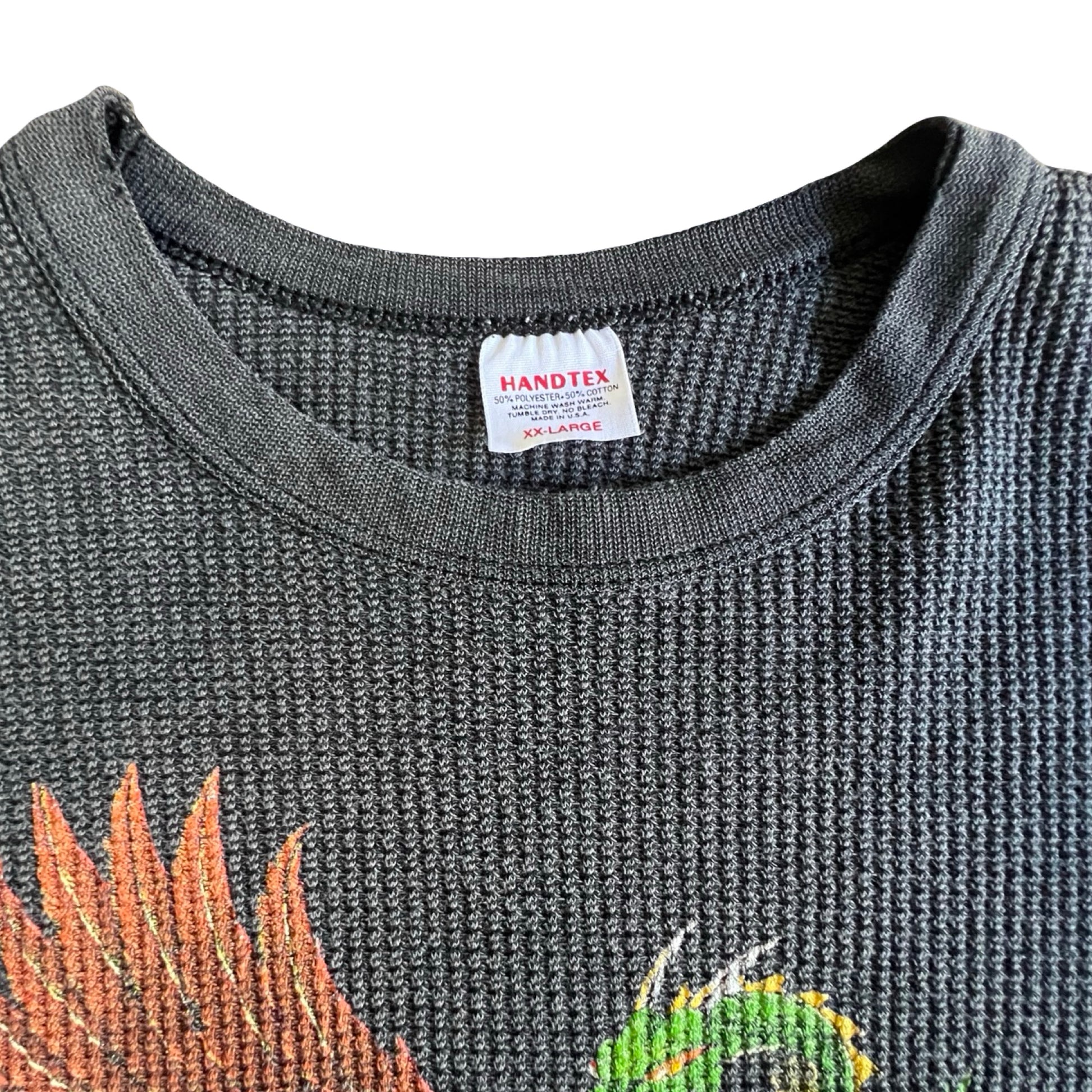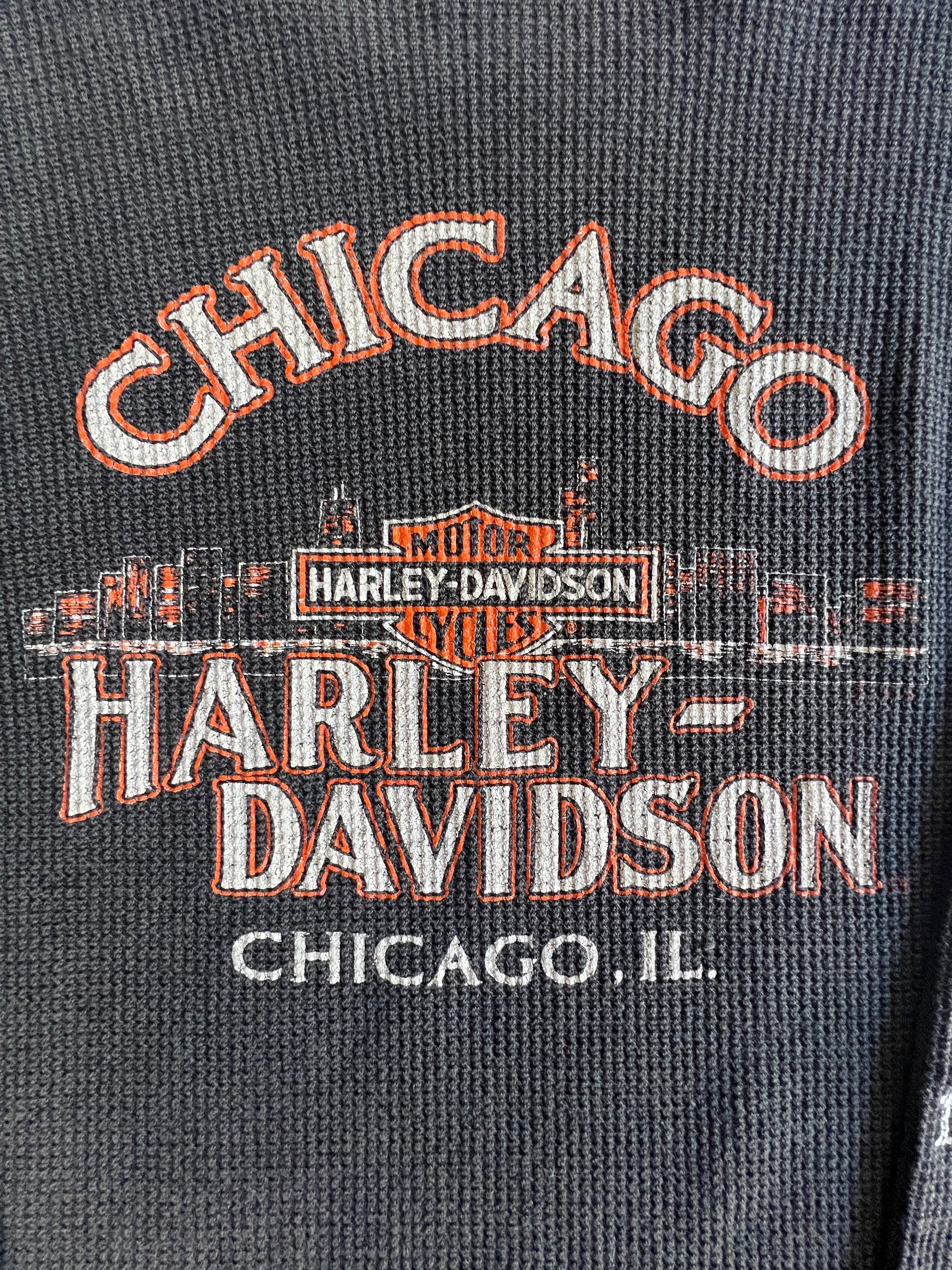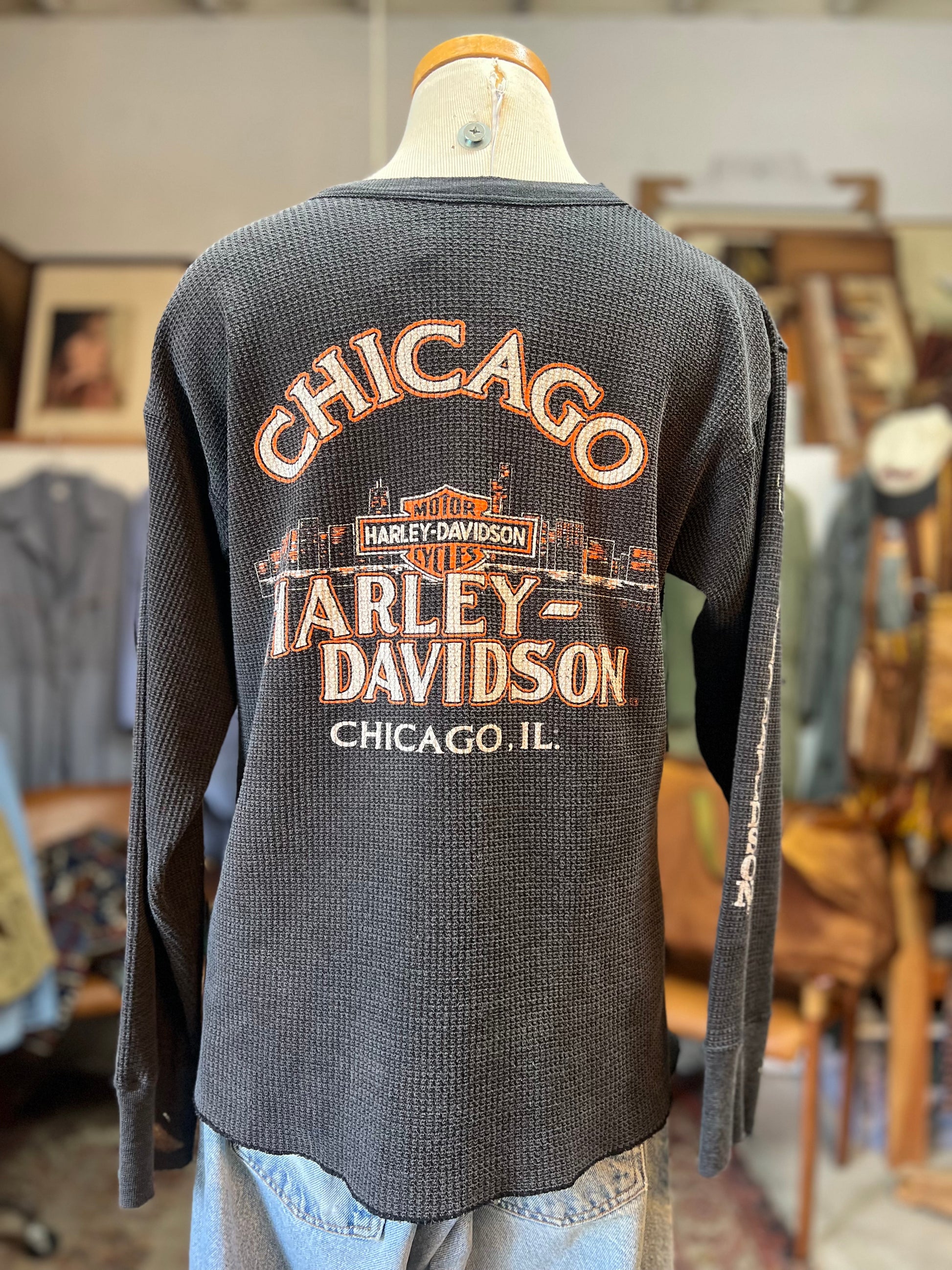 Another grail Harley Davidson piece! Original 1978 (copyright mark) The Eagle Has Landed thermal. These are very rare, especially in a larger size! This one is next level insane. Beautiful allover fading, gorgeous cracked graphics, with front, back, AND sleeve hits!! Distressing throughout, consistent with age with some paint and threadbare spots. Back graphic Chicago, IL. Handtex tag size XXL, measures 21” pit to pit and 24” top to bottom. What an extremely rare and incredible piece of Harley Davidson history!