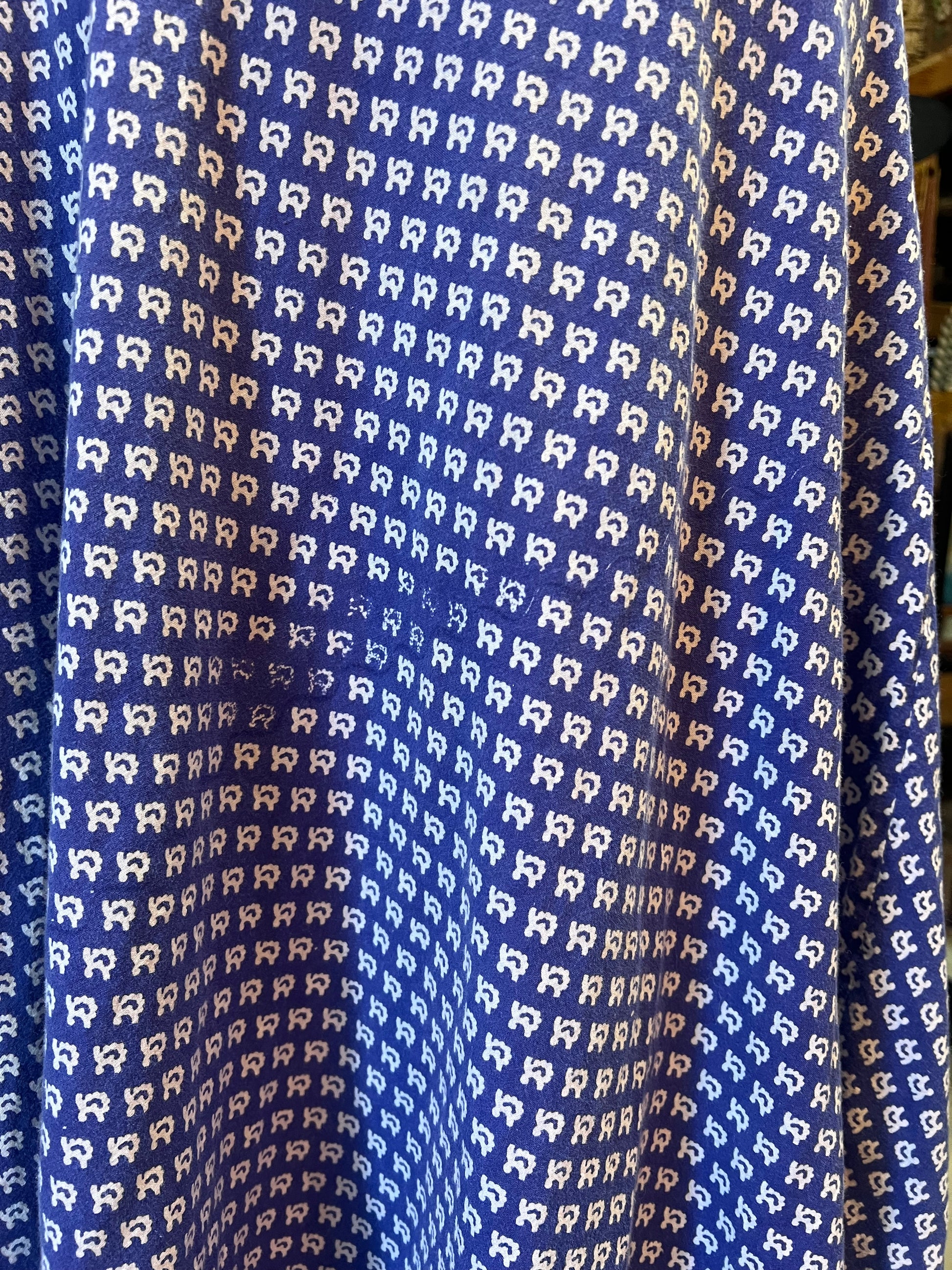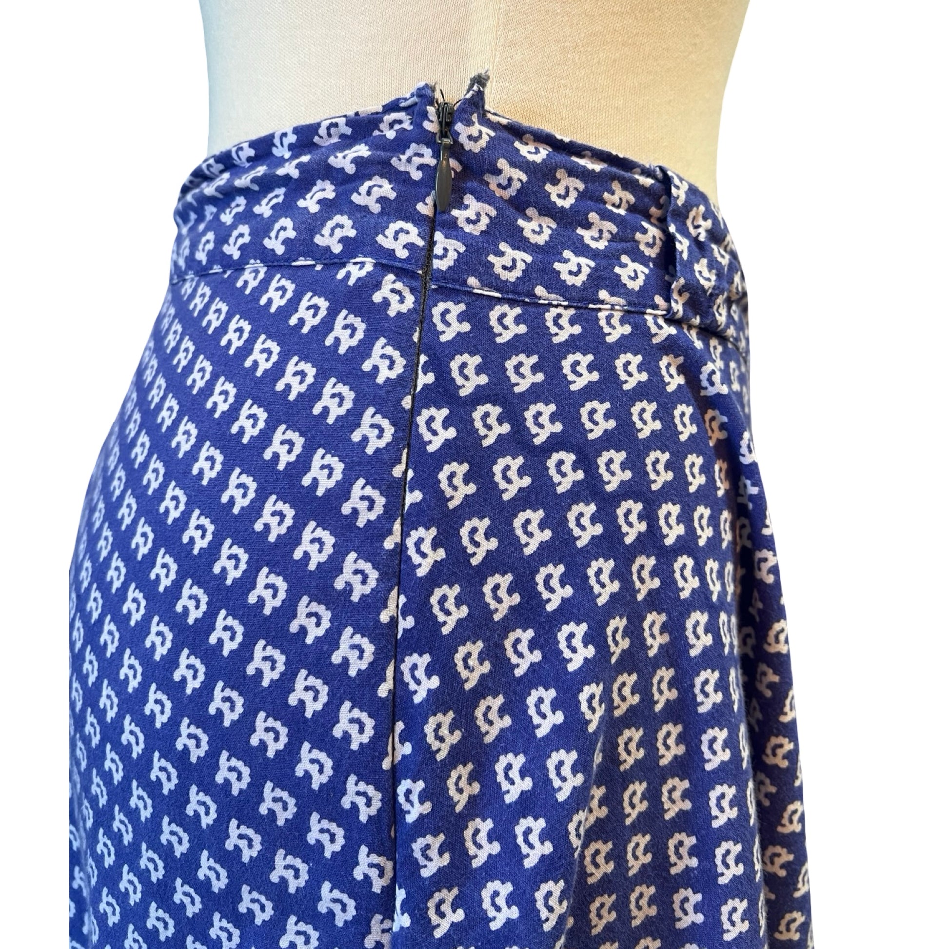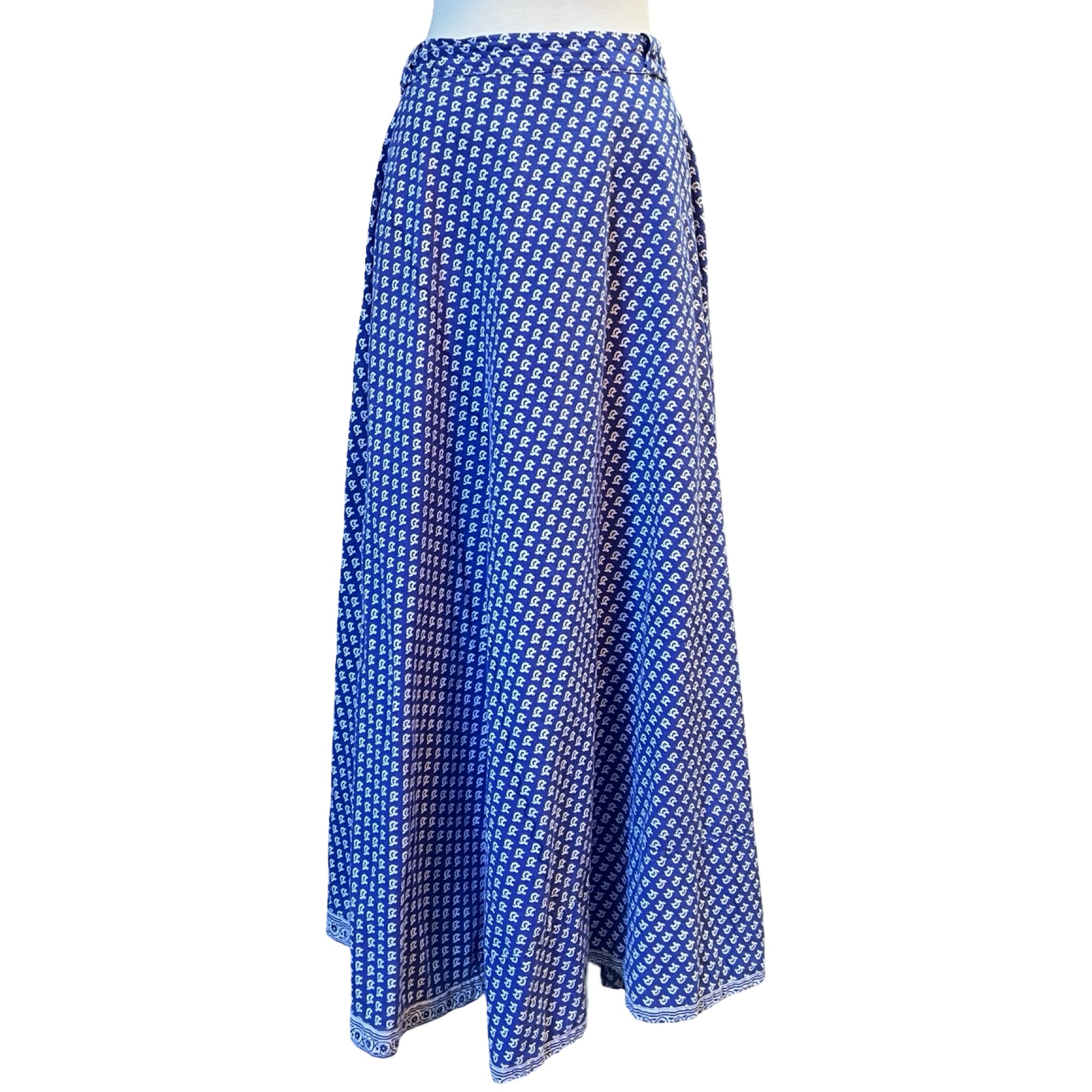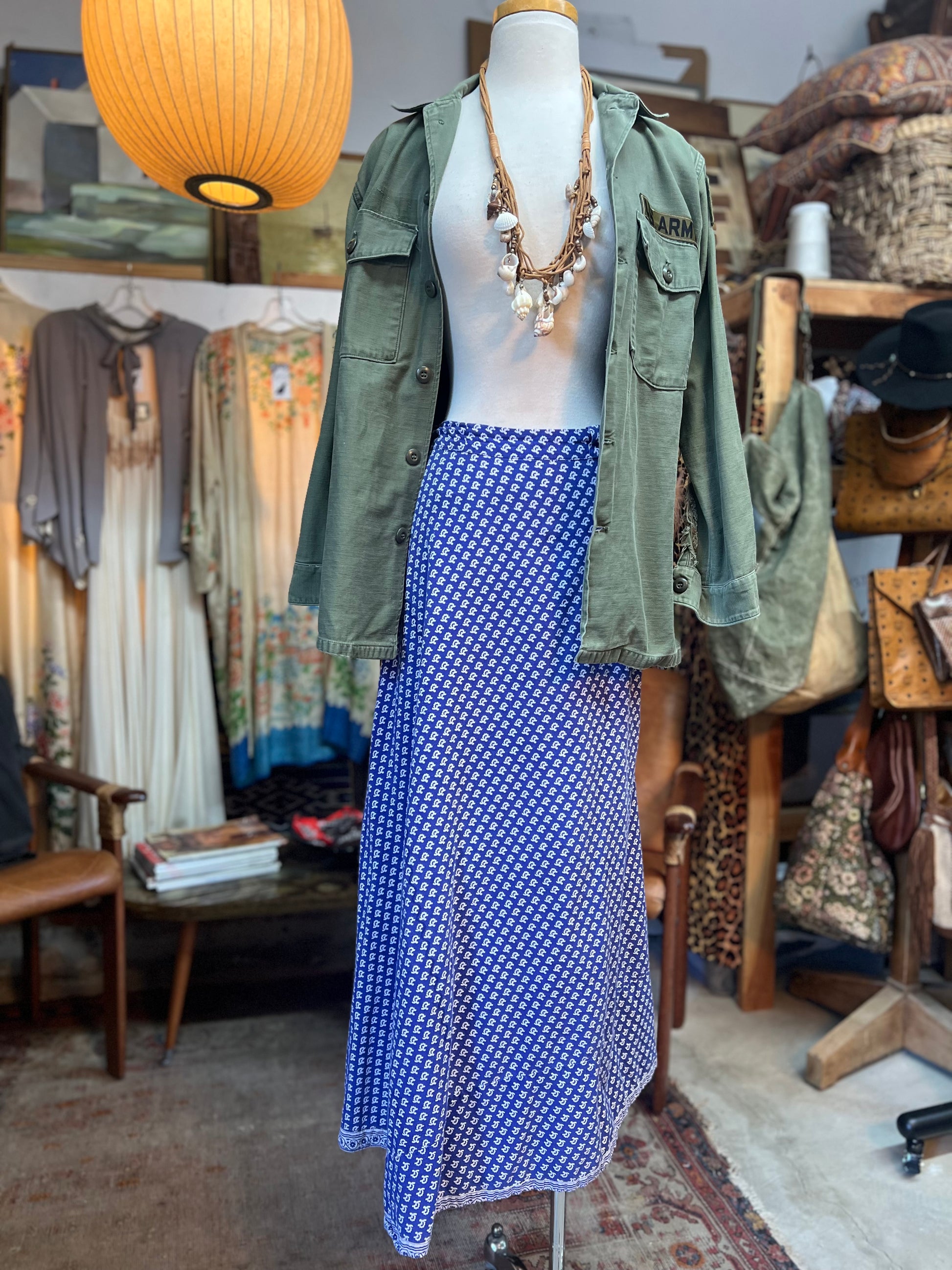 This gorgeous vintage 70’s India block print maxi skirt has been converted from a wrap skirt! Side zipper and hook & eye closure, waist measures 17” across and is meant to sit low on the hips (you can always take it in if you prefer high waisted). Lots of fabric make for dramatic movement with this one. Length is 40”. Irregular pattern in one section consistent with hand block printing.