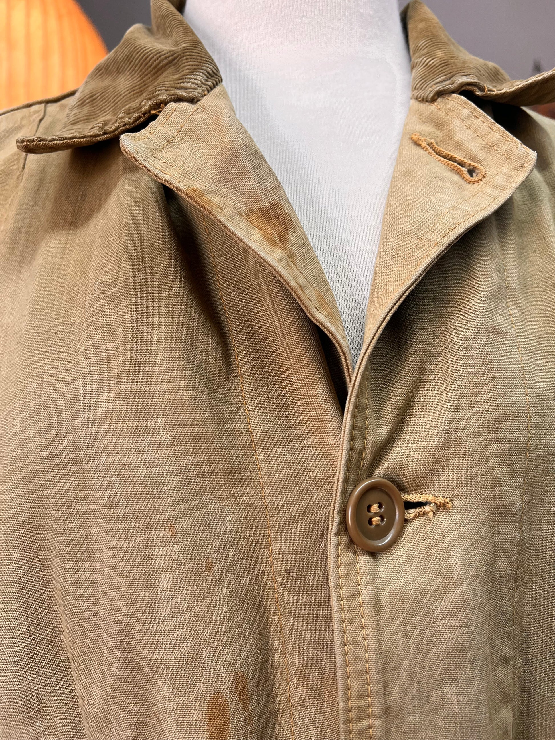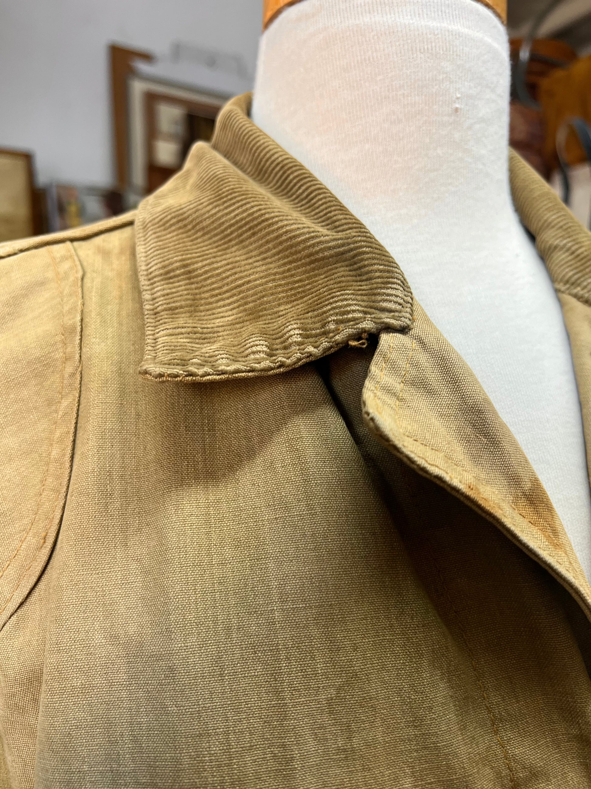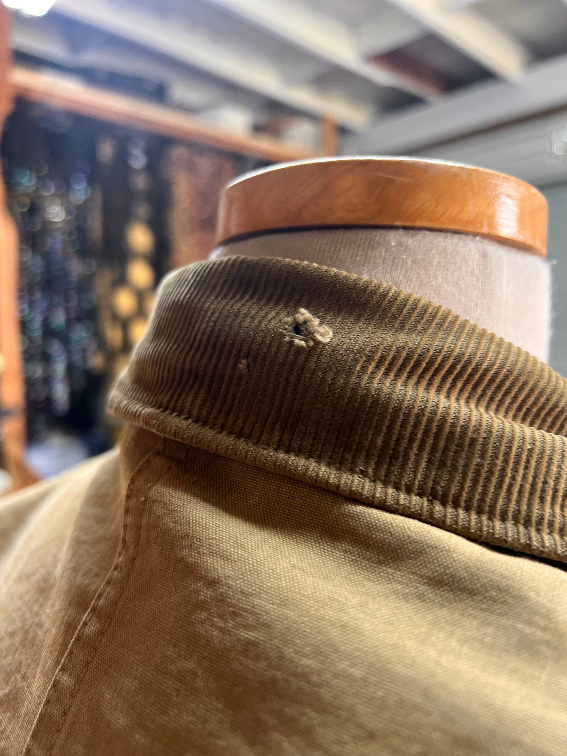 If you love gorgeous patina and heavy authentic distressing on your true vintage gear, then this one’s for you. Vintage 1950’s heavily distressed Duxbak hunting jacket in size xl, missing buttons, spots, stains, and holes throughout. Corduroy collar and cuffs. This one is dripping in character, such a beautiful piece! Freshly laundered.