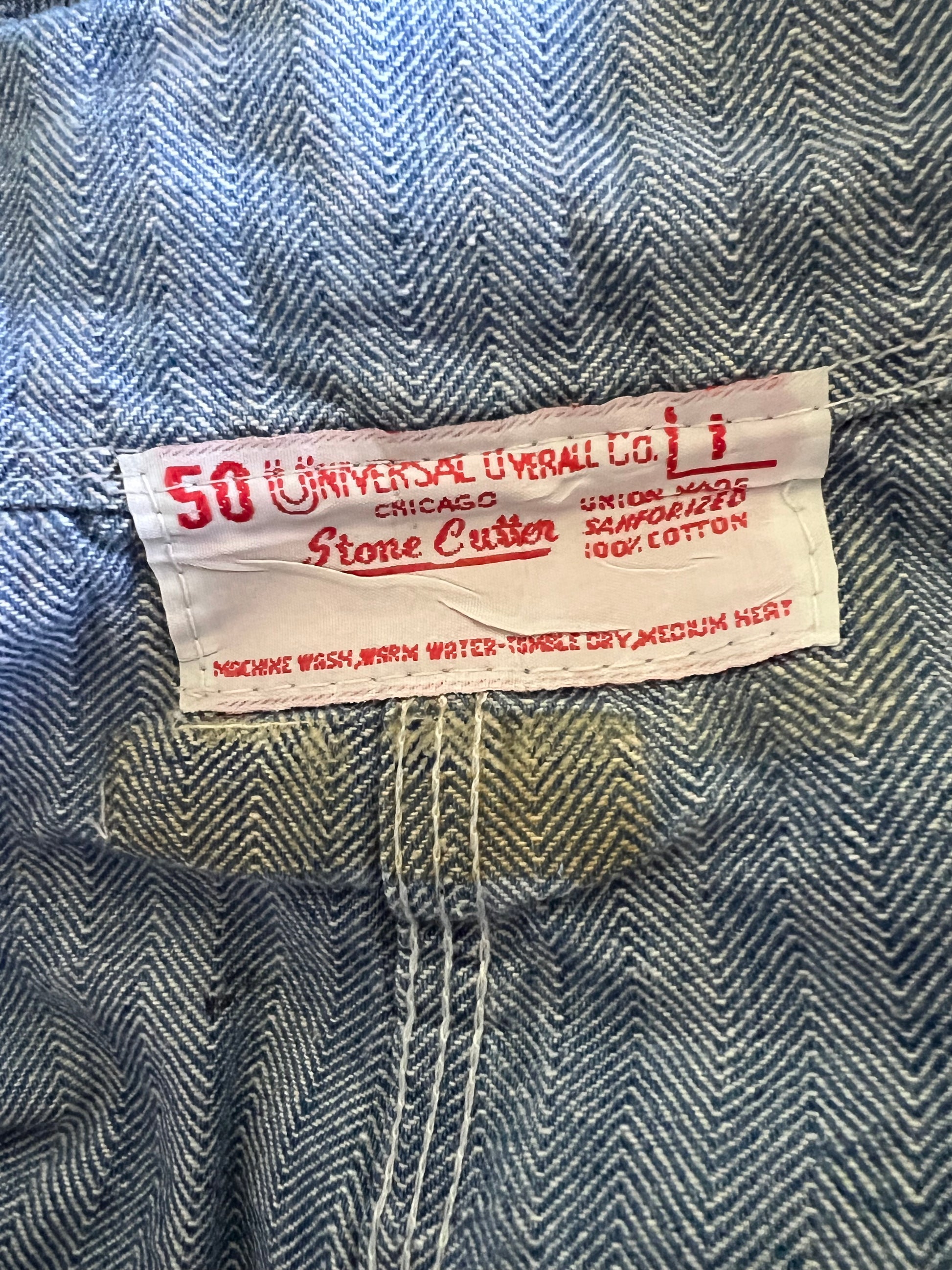 Great vintage 1950’s oversized herringbone twill denim machinist/chore coat. Button front, two large patch pockets in front, two open “through pockets” on sides. Small spot on front left chest, barely noticeable. Universal Overall Co. Chicago Stone Cutter tag size 50, measures 27” across the waistband and 44” base of collar to bottom. Rigid denim, no stretch.