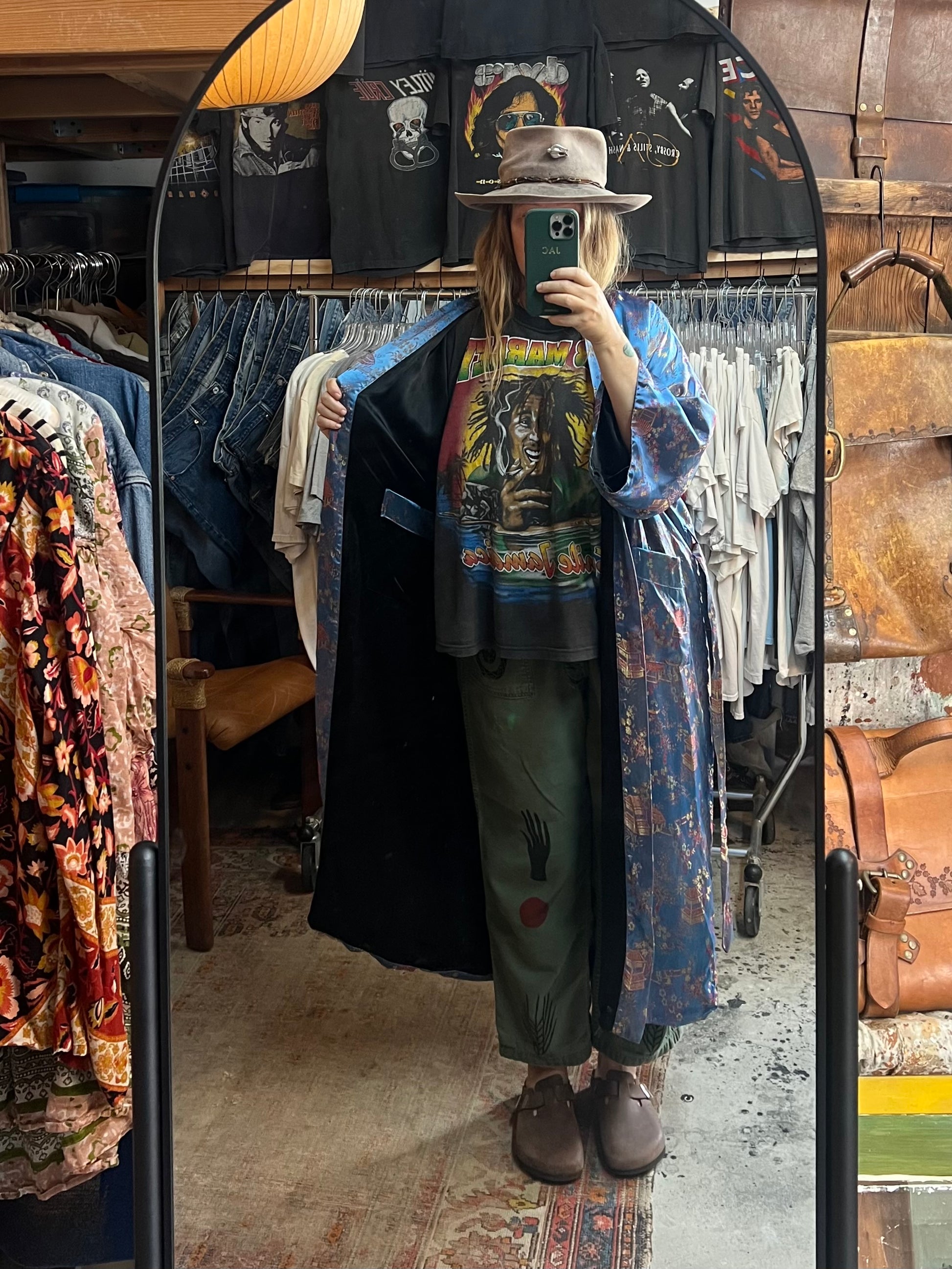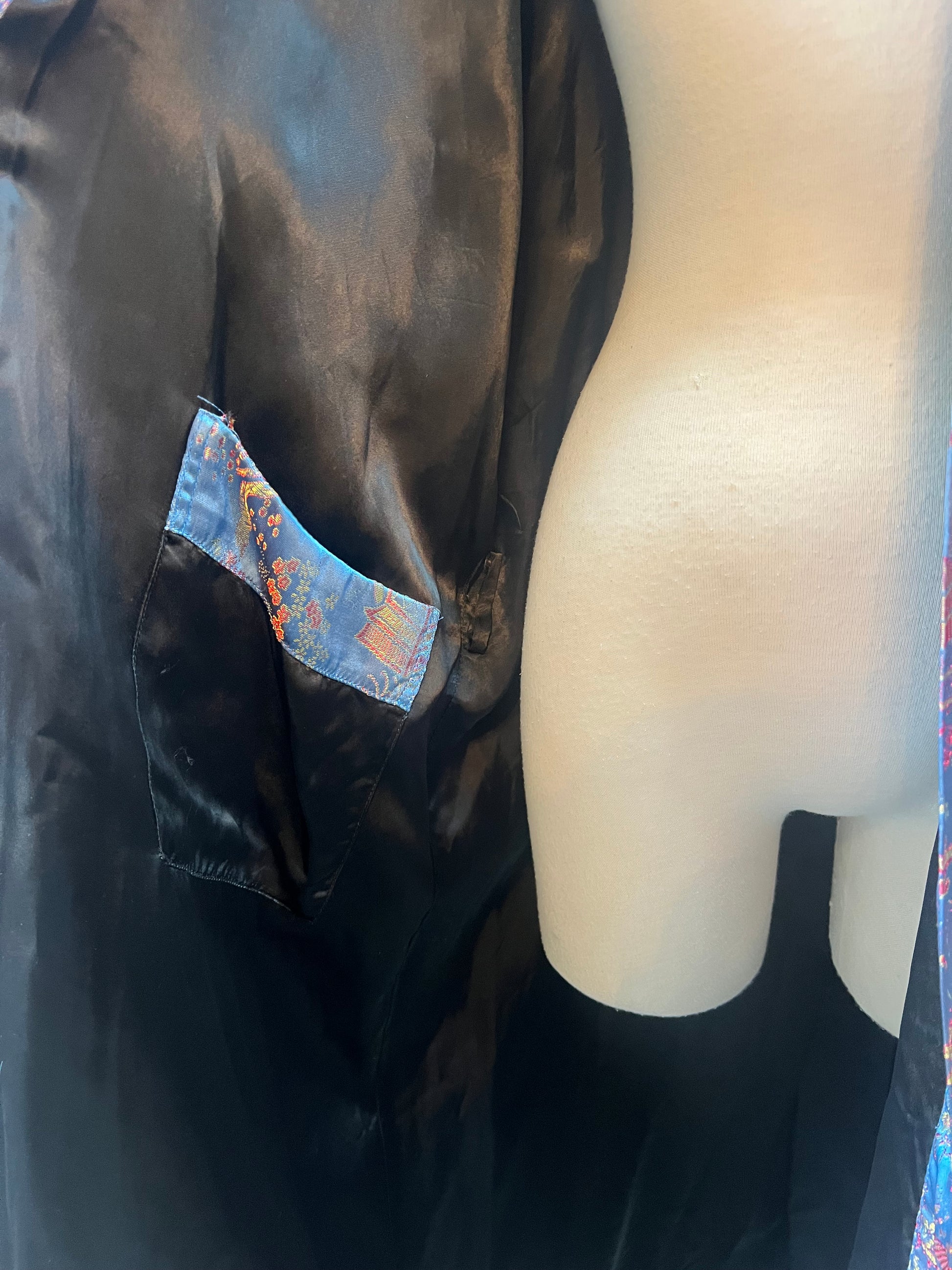 This vintage 1950’s silk brocade kimono robe is gorgeous!! Has some beautiful weight to it and it’s reversible!! Interior pockets and belt loops to easily switch to the other solid black side. Big patch pockets at hips on the blue side, chest pockets with contrasting trim on the black side. Comes with matching belt. No tags, one size fits all. Some loose threads throughout but otherwise in fabulous condition for her age. Such a stunning piece!
