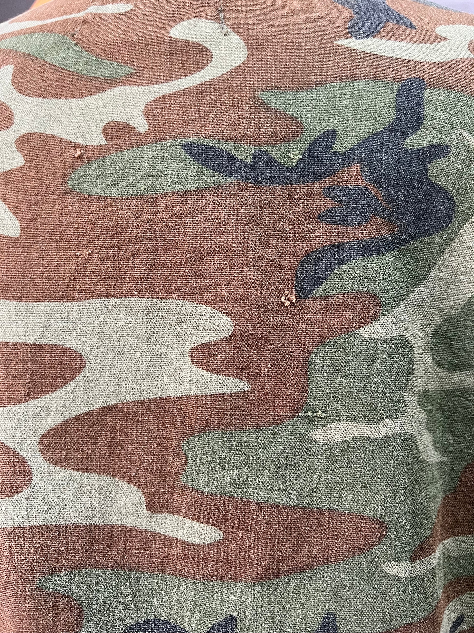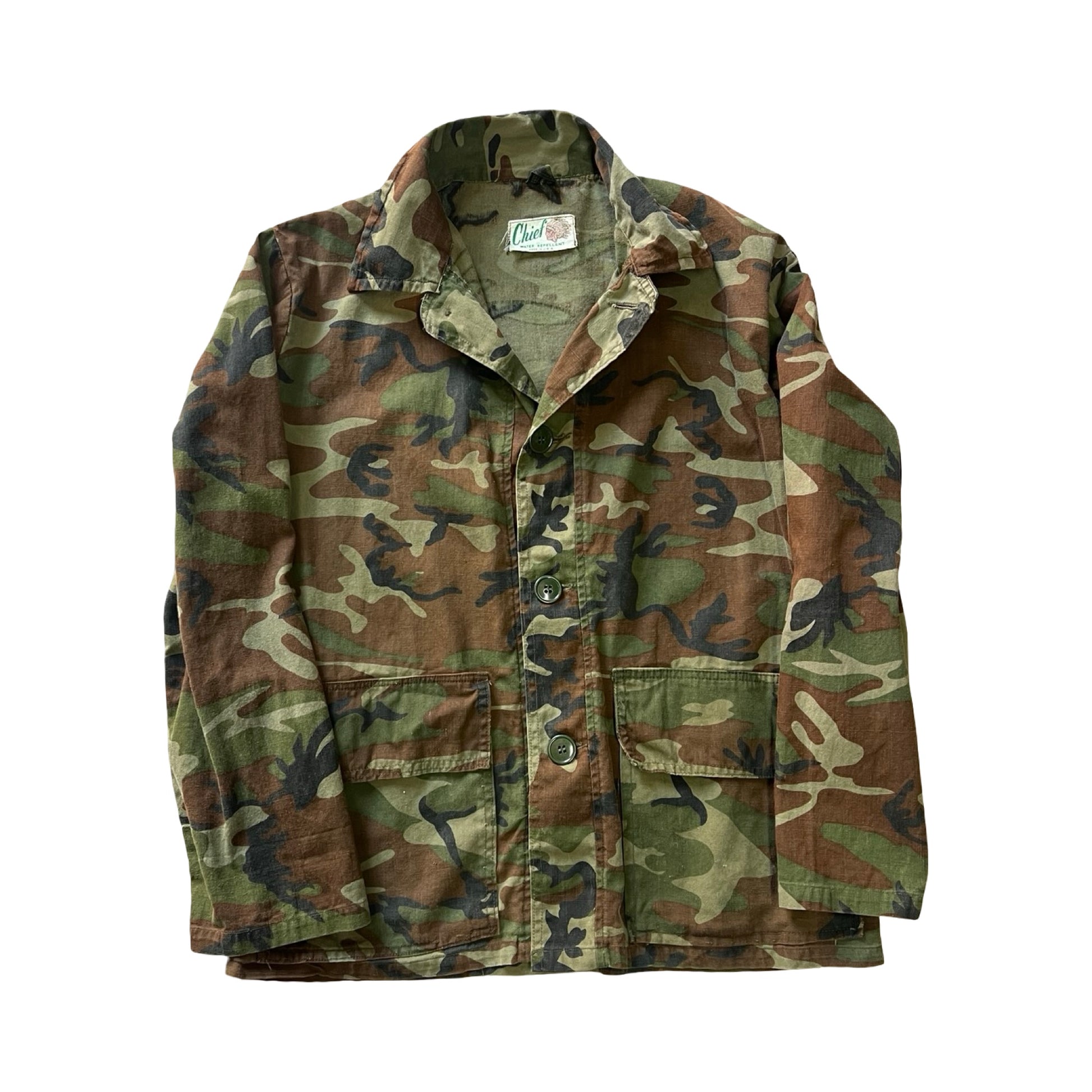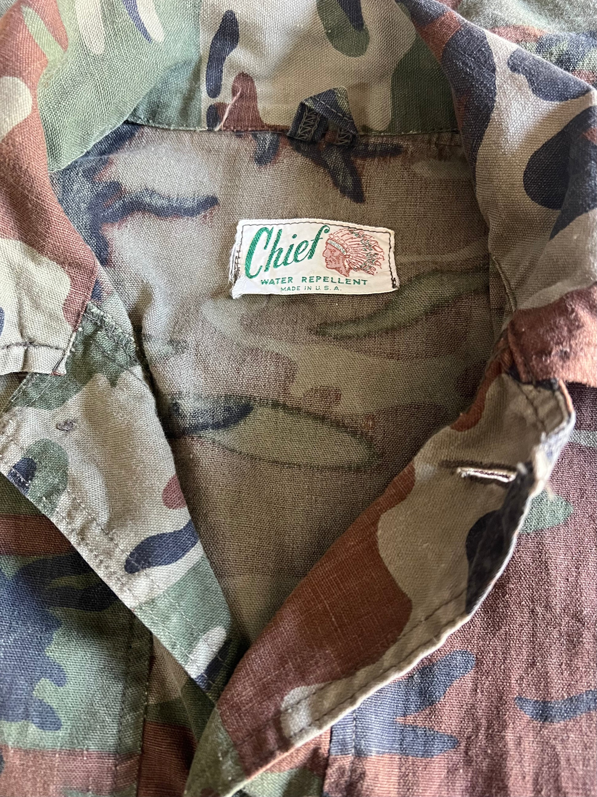 This 1960’s Chief brand camouflage shirt jacket is amazing! Hard to find them this soft and thin in a bigger xl size with a beautiful fade. Super versatile and can be worn as a shirt or a jacket. Nice exaggerated collar and cool bigger buttons. Some light distressing throughout and a couple small holes. No size tag, measures 27” pit to pit and 27.5” top to bottom. Incredible Chief Water Repellent Made In USA tag. This is one of the good ones.
