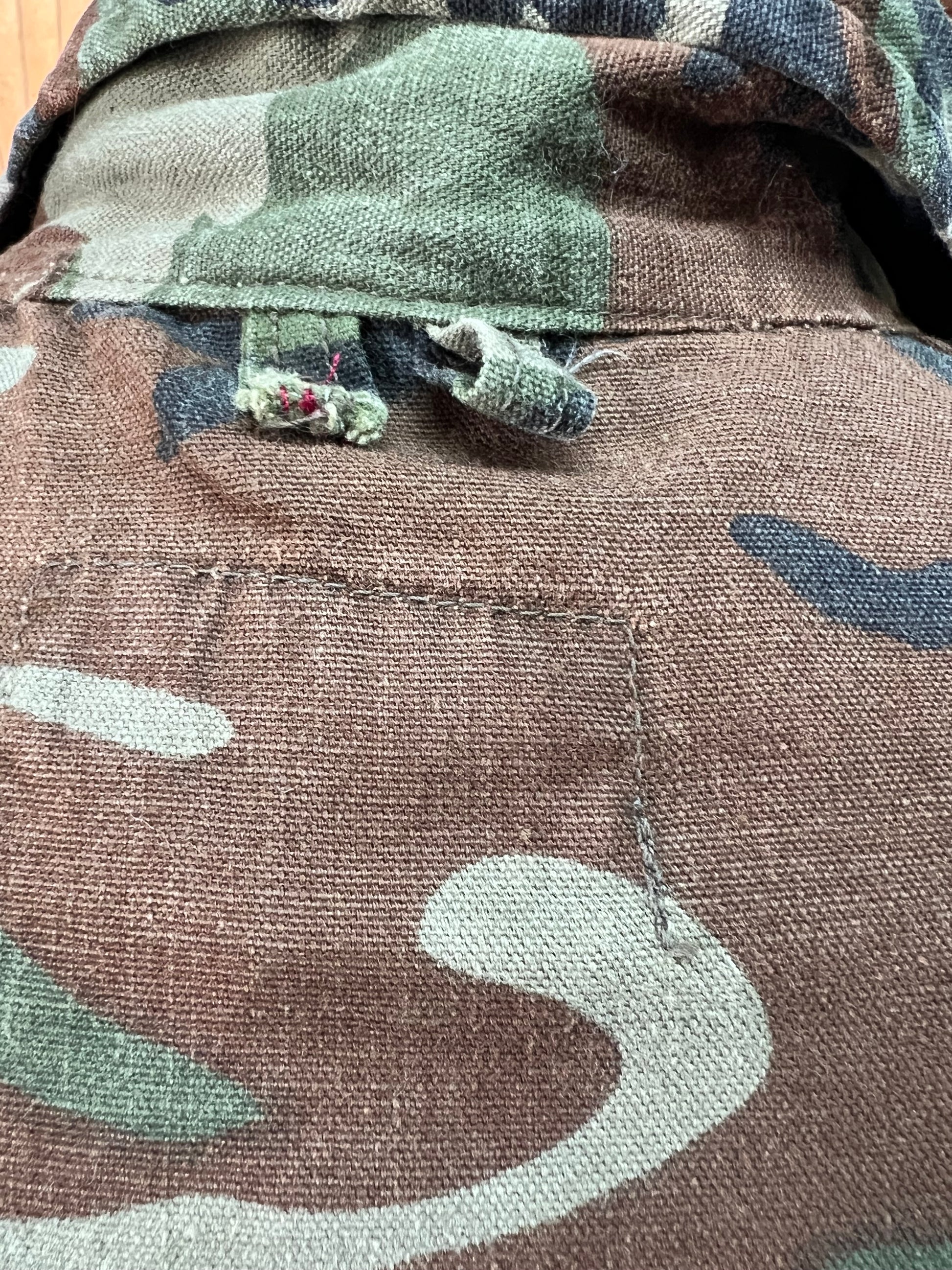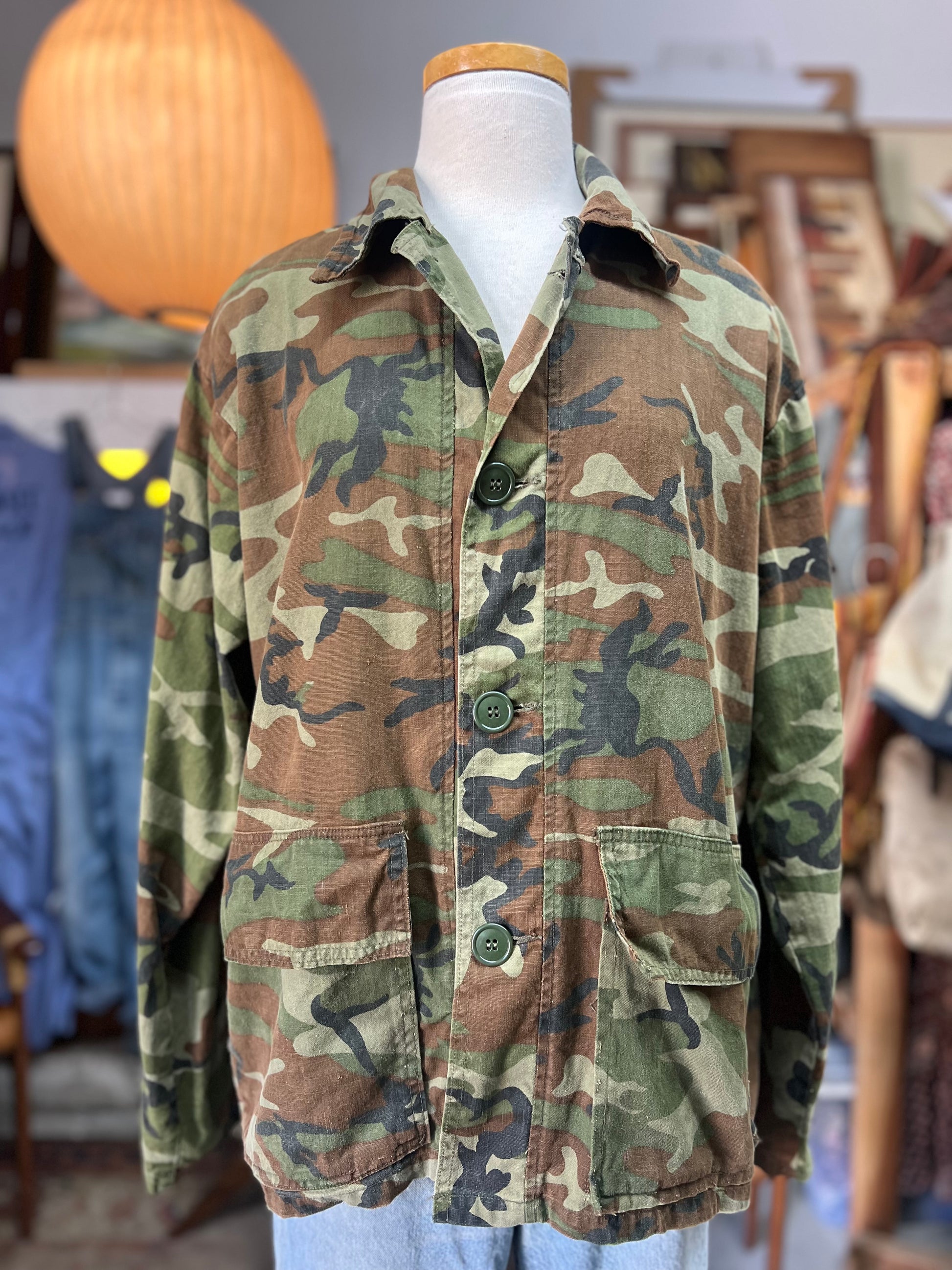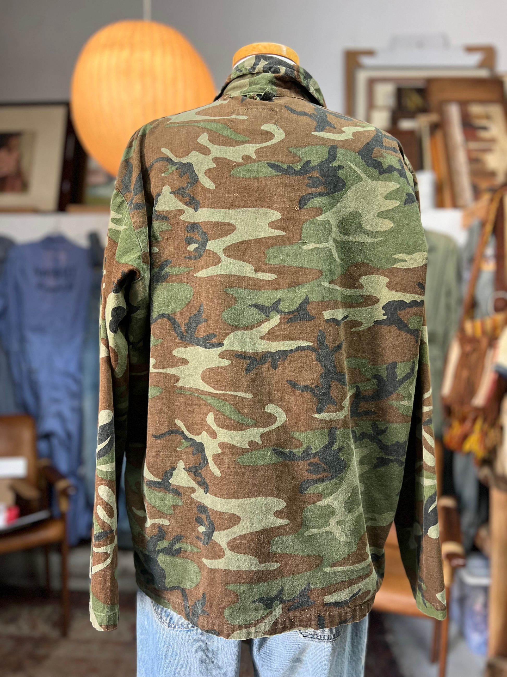 This 1960’s Chief brand camouflage shirt jacket is amazing! Hard to find them this soft and thin in a bigger xl size with a beautiful fade. Super versatile and can be worn as a shirt or a jacket. Nice exaggerated collar and cool bigger buttons. Some light distressing throughout and a couple small holes. No size tag, measures 27” pit to pit and 27.5” top to bottom. Incredible Chief Water Repellent Made In USA tag. This is one of the good ones.