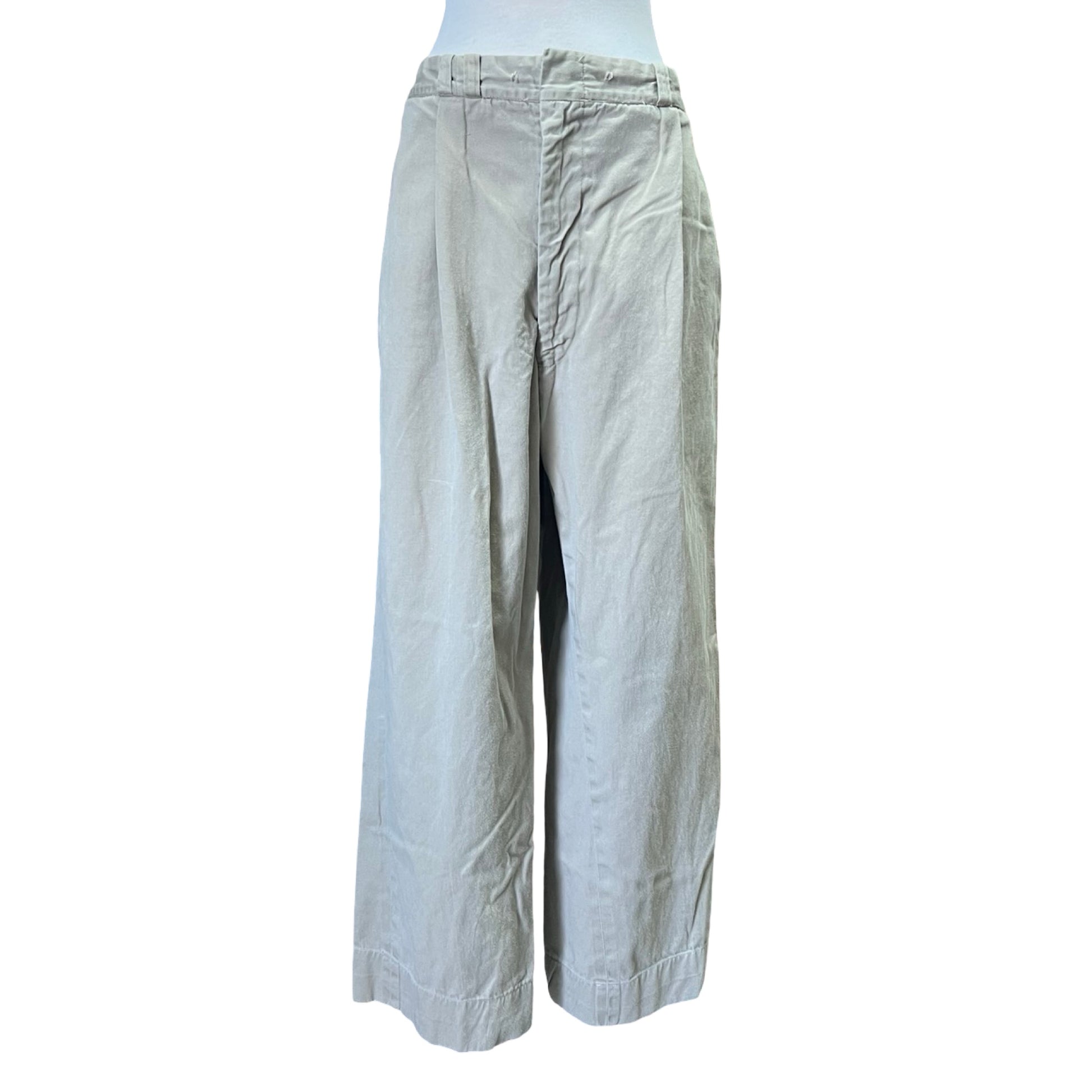 These vintage 1960’s military uniform khakis are incredible! Soft and worn but with some structure and in great condition. There have been alterations throughout…they were obviously taken in in the back and then let out, there are a few small holes in waistband (two inside, two outside) where there used to be a drawstring. There are also pleasers added to the front for a better fit, but they can be taken out. Overall an absolutely incredible pair of 60’s military workwear. Measures 38 x 29.