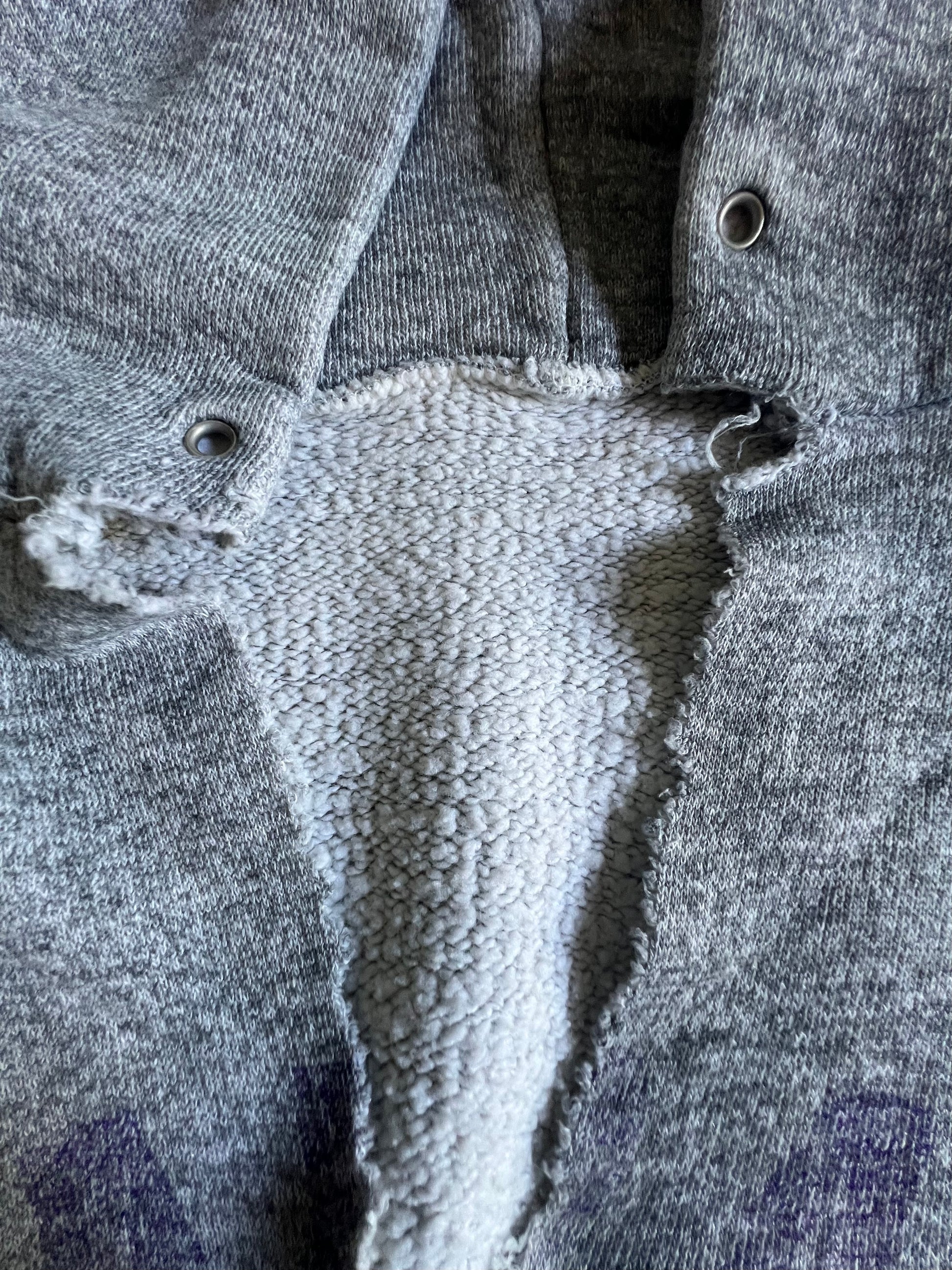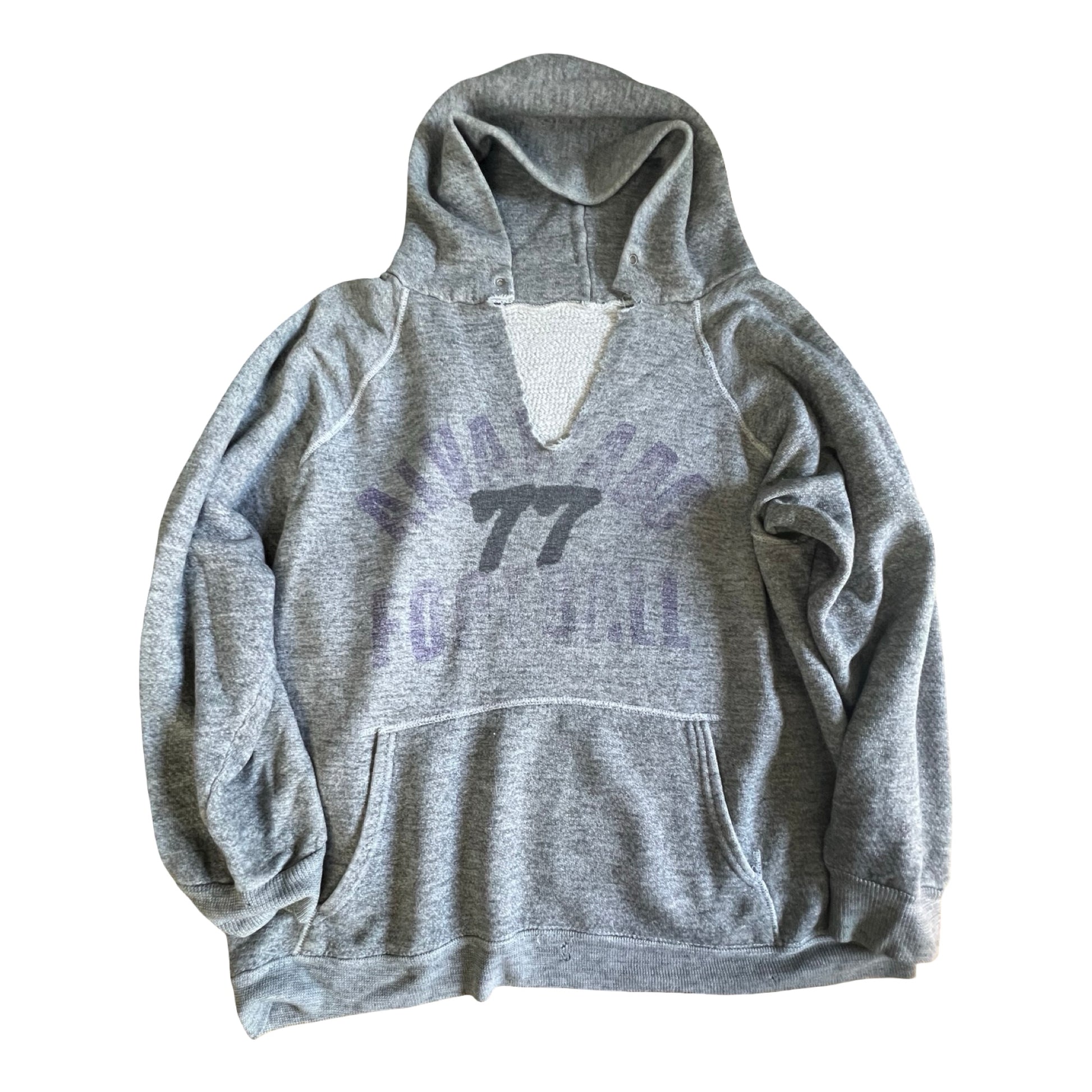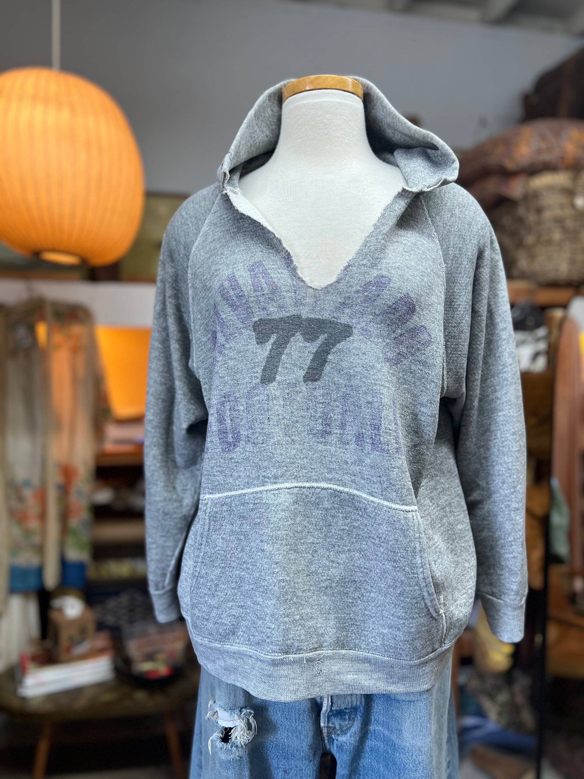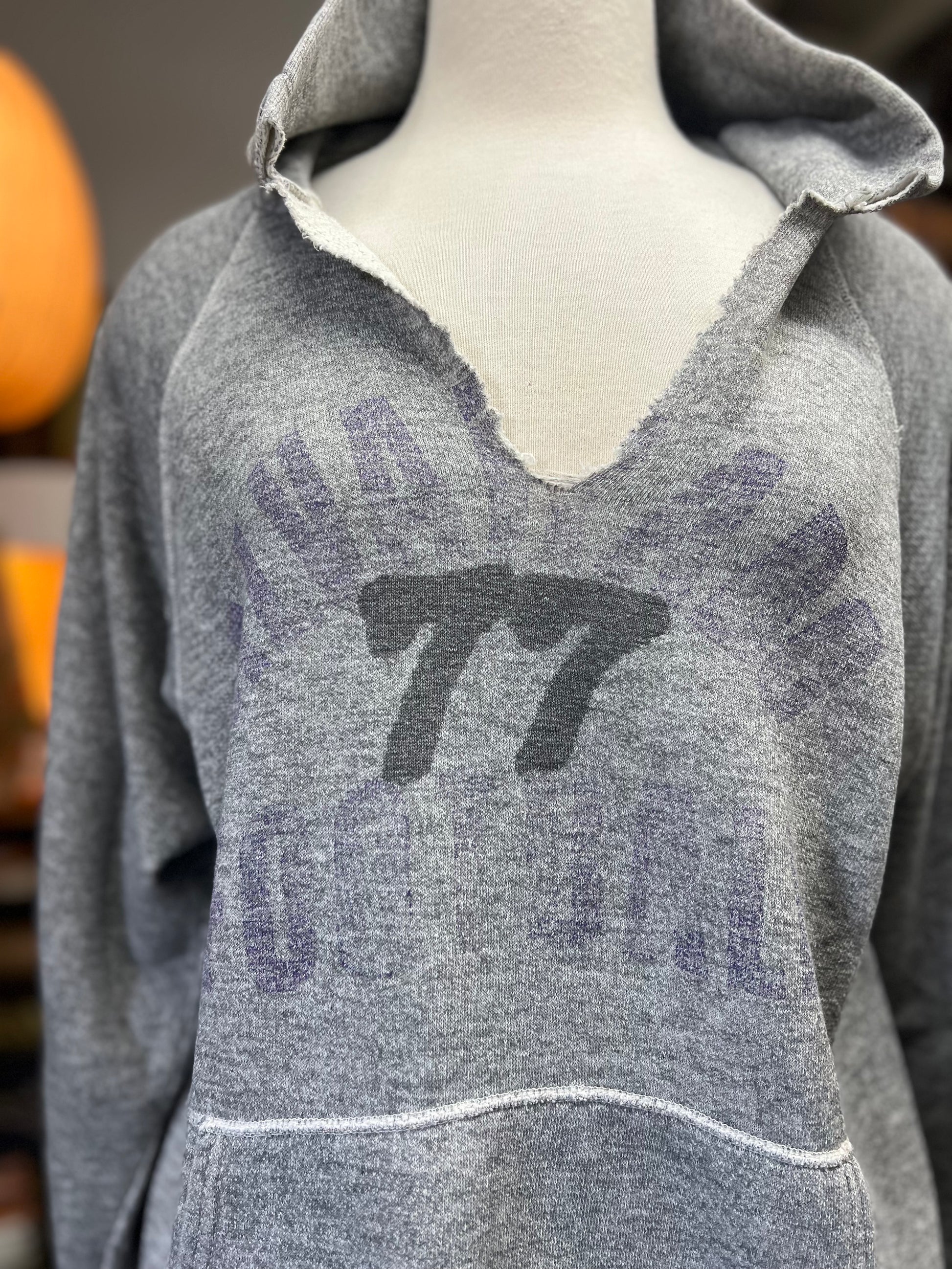 Such an amazing sweatshirt (I’d be keeping if it fit)!! Vintage 1970’s raglan hoodie, super soft and distressed. Alvarado Football #77 stenciled on front. Loose drapey boxy fit, measures 23” pit to pit and 22” top to bottom. Small holes and spots, cut at neck, distressing throughout consistent with age. Really great 70’s hoodie.