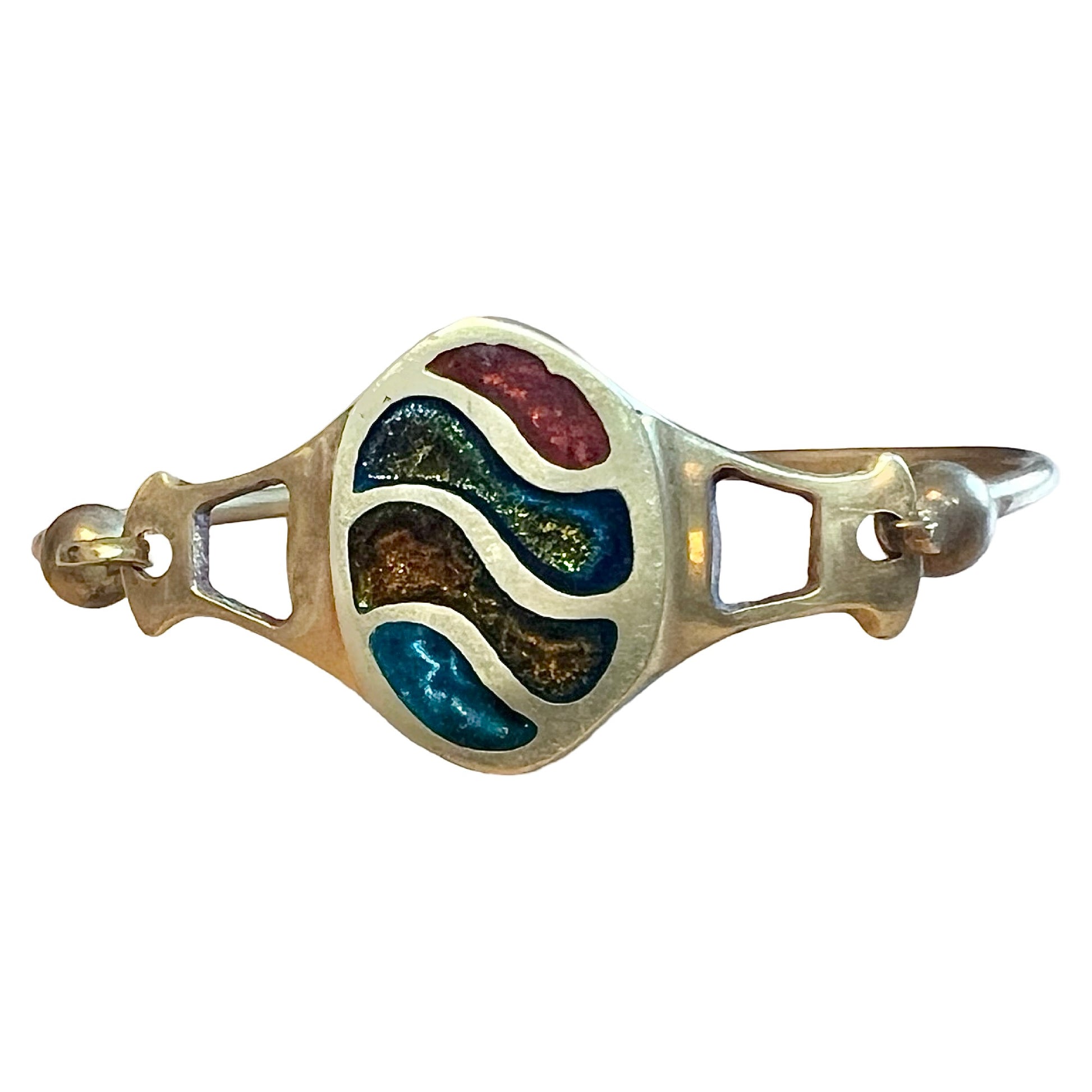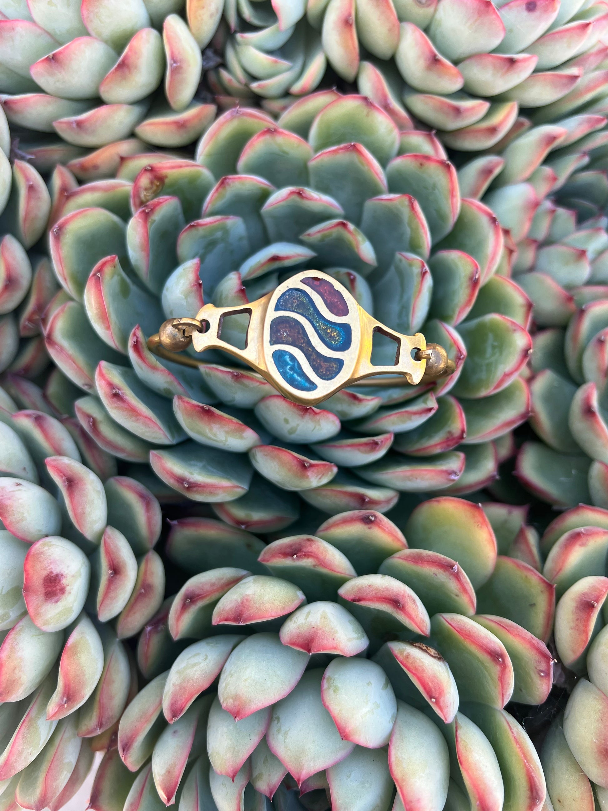 Vintage 1970’s modernist brass cuff with multi-color resin/stone inlay. Measures 6.5” in circumference with latch closure.