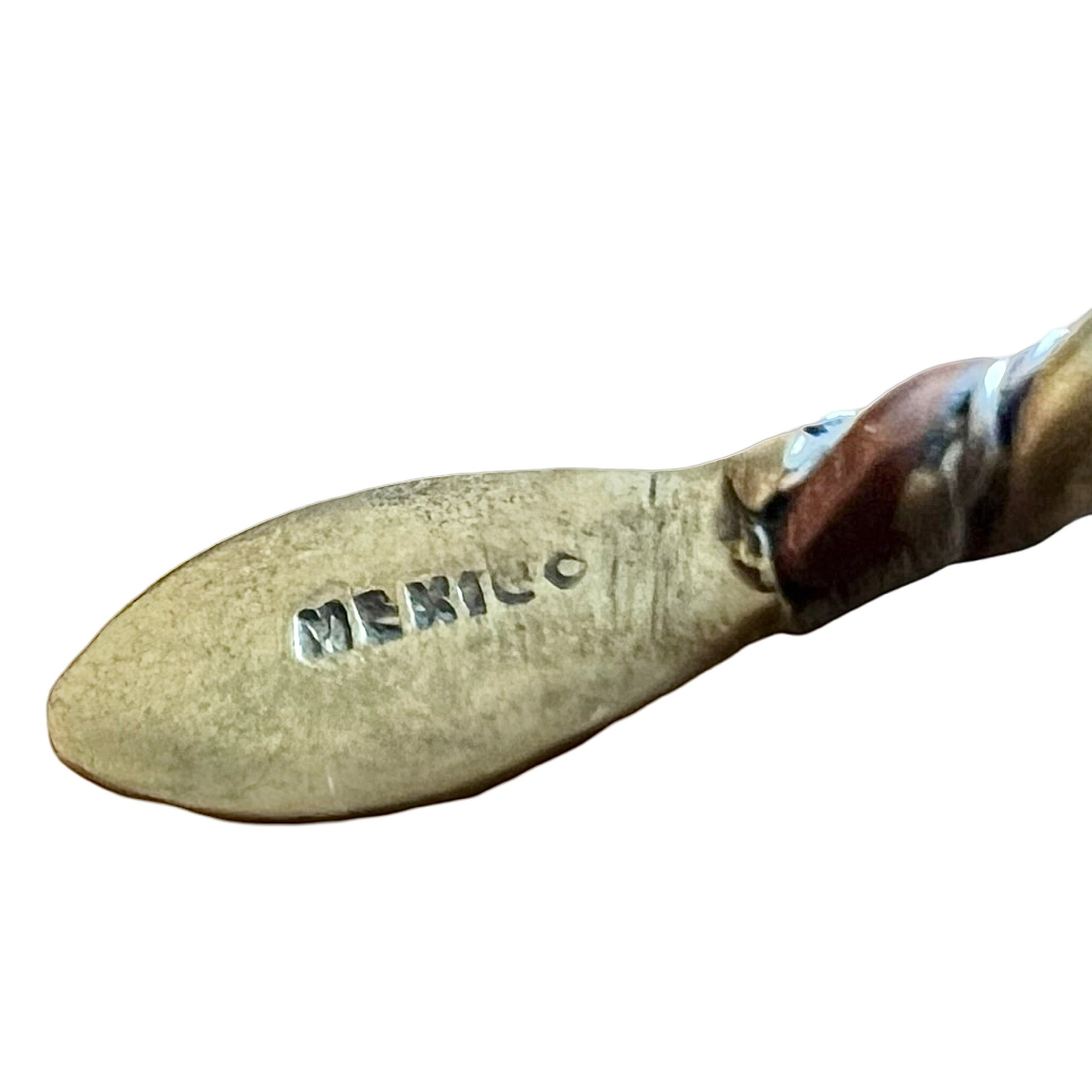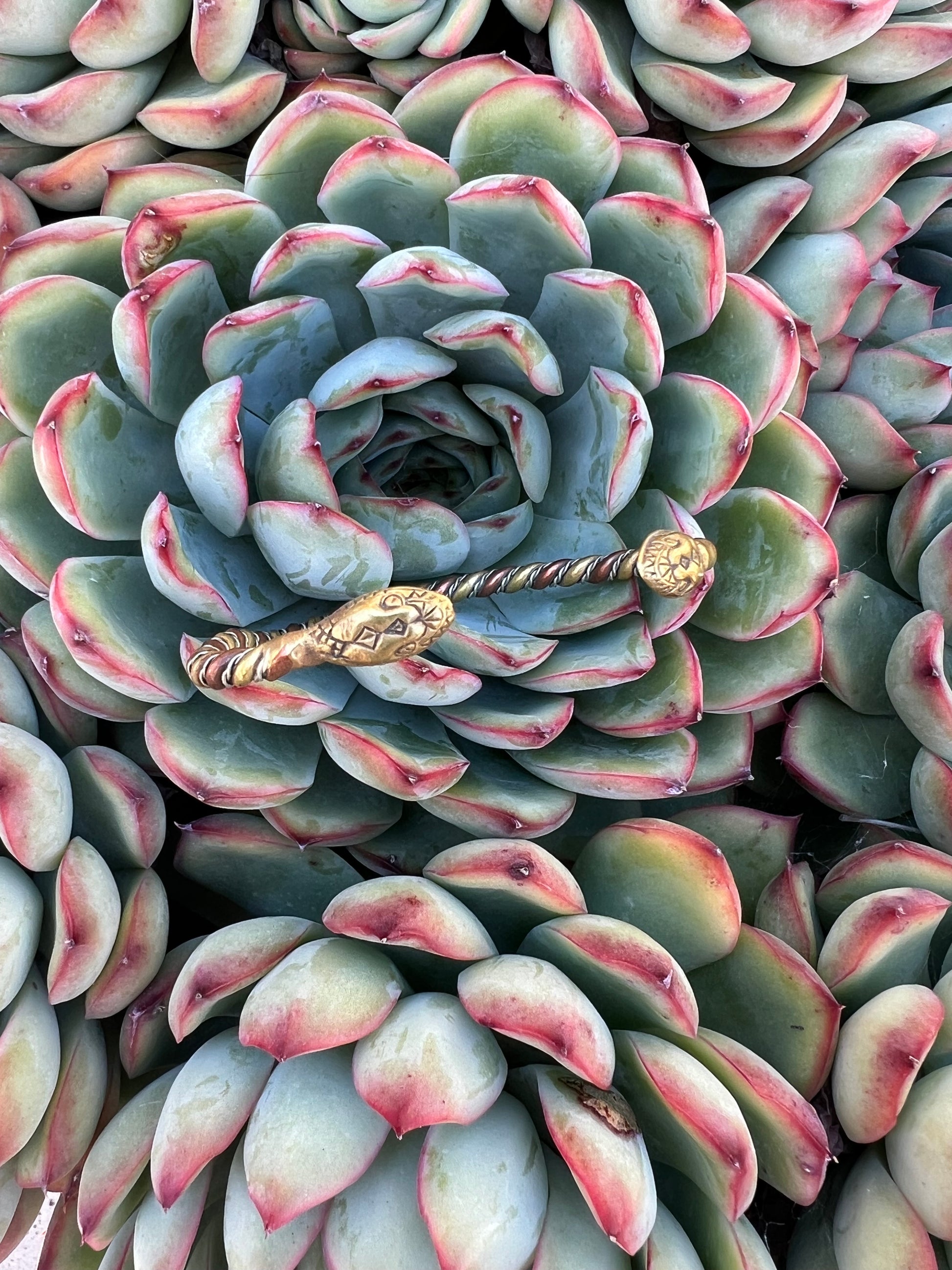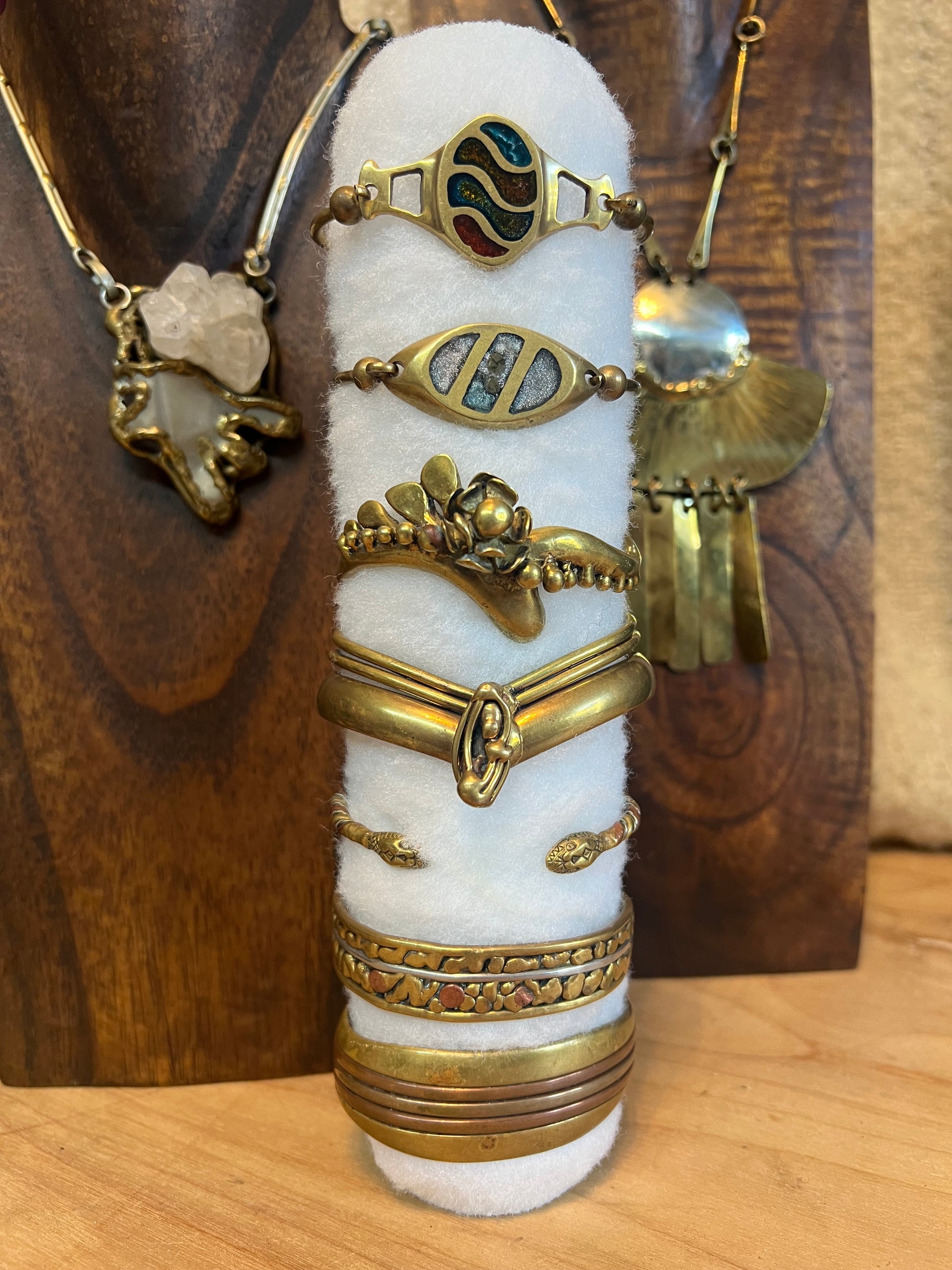 This sweet little cuff is crafted from twisted mixed metals and features a snake head on either side of the opening. Very soft metal makes it adjustable (and also a little wonky/bent). Stamped Mexico.