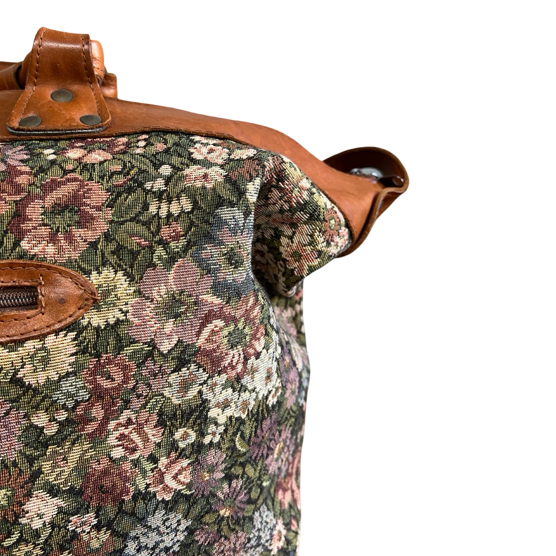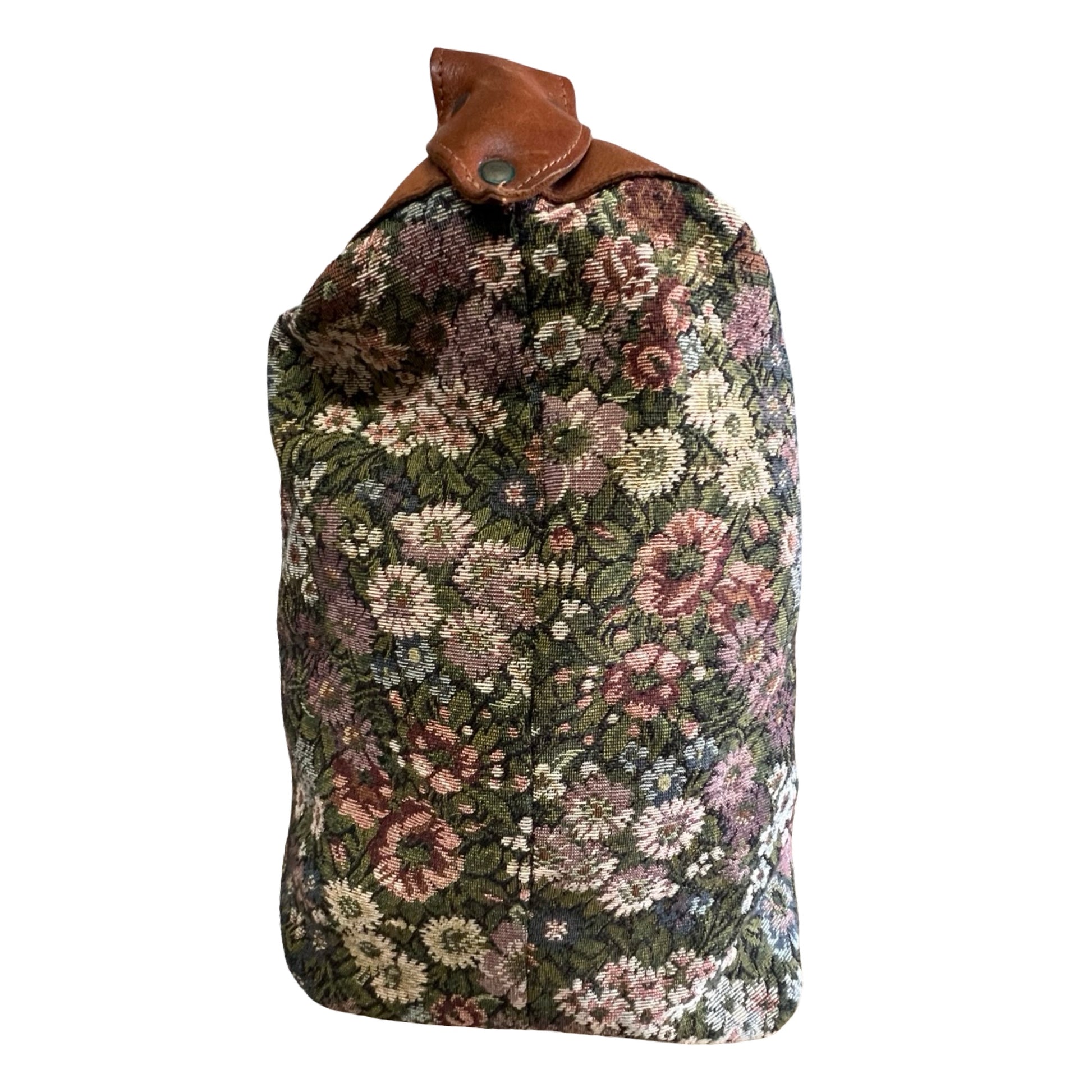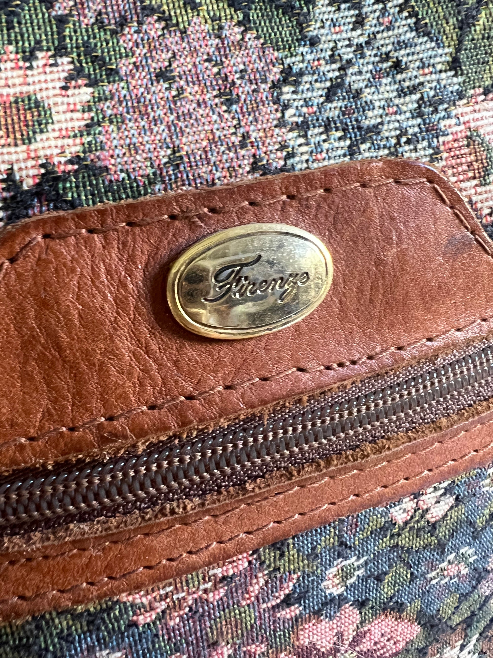 I’ve had this bag forever and I love her!! Such an amazing 80’s weekender duffle in floral needlepoint trimmed in caramel leather. Gold Firenze namplate on front outside pocket with an adjustable shoulder strap (can be worn crossbody). Wonderful vintage condition, very clean inside, all four corner brass feet in tact (missing middle one). Measures 17” across the bottom, 24” across the top, 16” high. **faint smell of Nana’s attic and Febreeze…nothing major but worth noting**