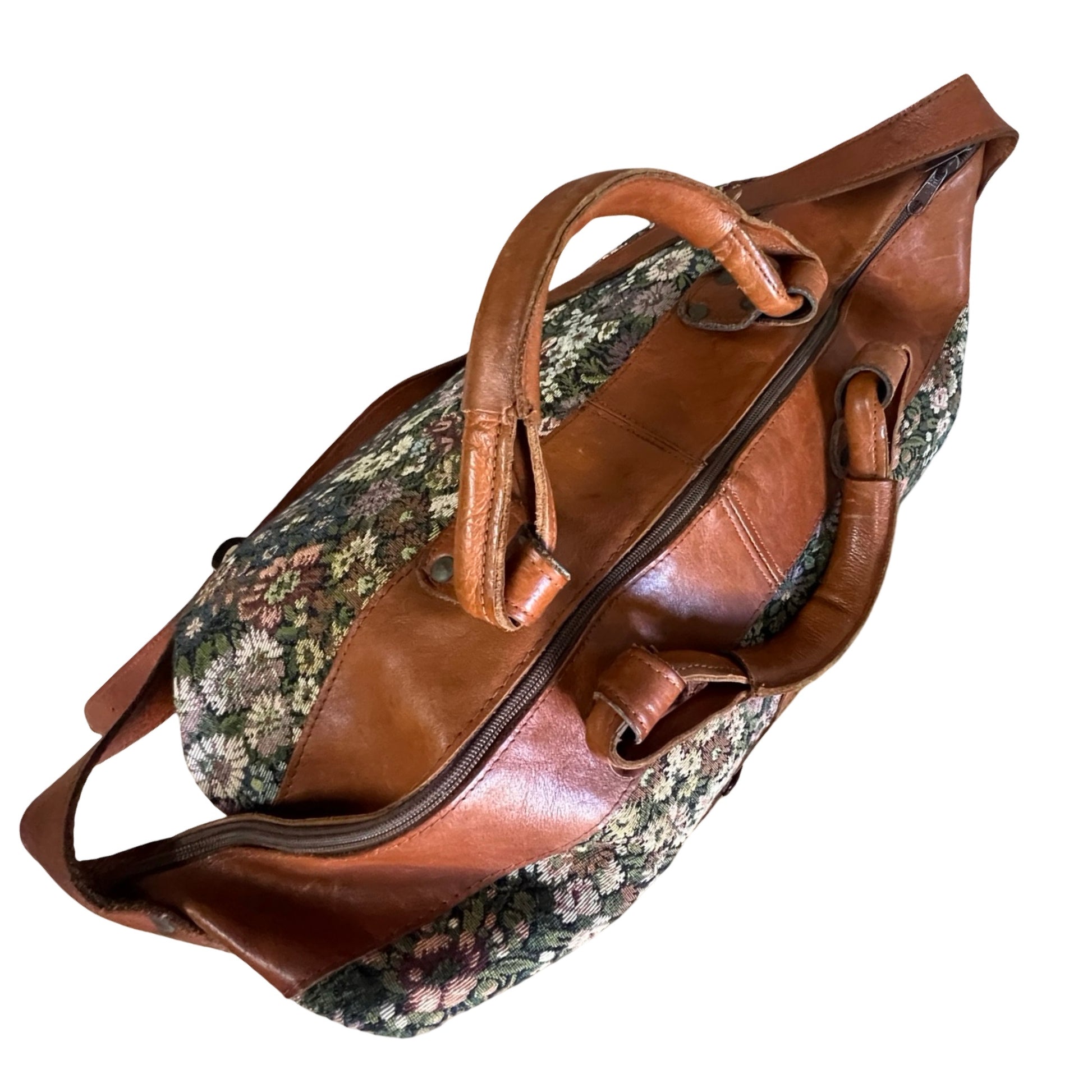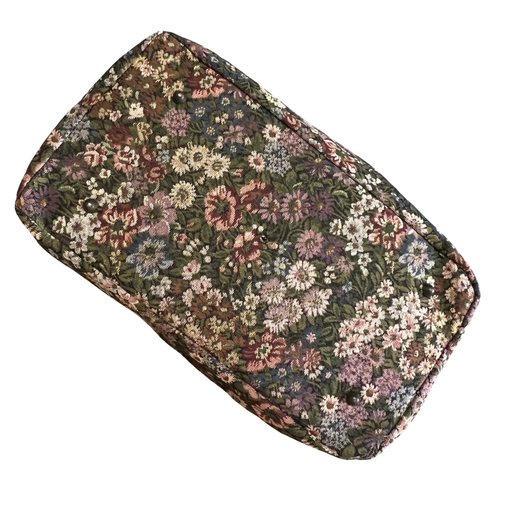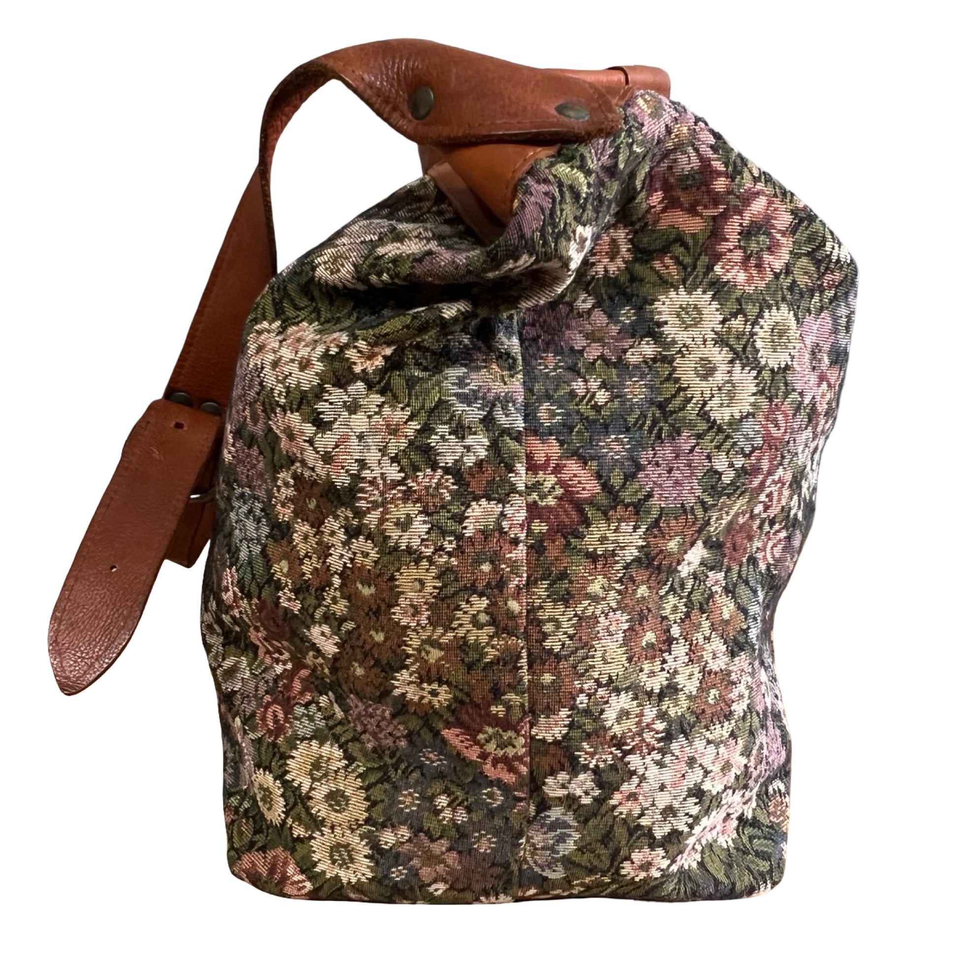 I’ve had this bag forever and I love her!! Such an amazing 80’s weekender duffle in floral needlepoint trimmed in caramel leather. Gold Firenze namplate on front outside pocket with an adjustable shoulder strap (can be worn crossbody). Wonderful vintage condition, very clean inside, all four corner brass feet in tact (missing middle one). Measures 17” across the bottom, 24” across the top, 16” high. **faint smell of Nana’s attic and Febreeze…nothing major but worth noting**