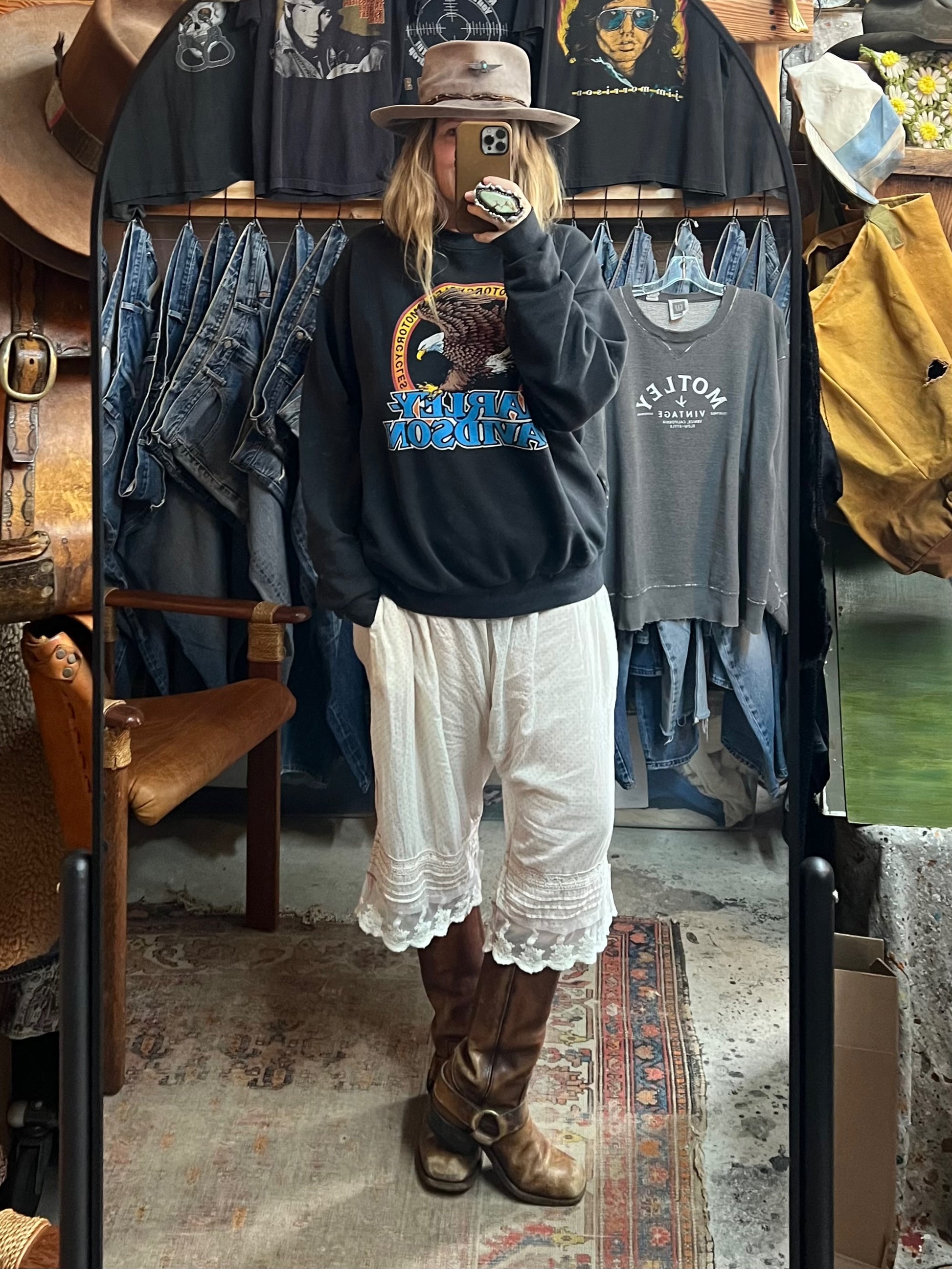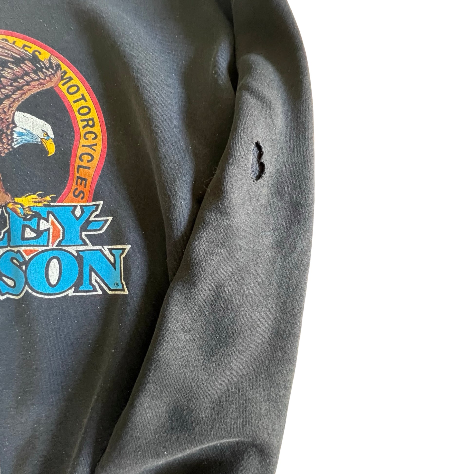 Vintage Harley Davidson 1992 graphic eagle sweatshirt. Some allover wear, mild pilling and distressing consistent with age and a hole in left sleeve (see photos). Copyright 1992 Holoubek, making this a collectors piece made by the official or licensed manufacturer of Harley merchandise in the 80’s and 90’s. Front bright eagle graphics, back Chillicothe, Ohio. Tag size XL, measures 25” pit to pit and 27” top to bottom.