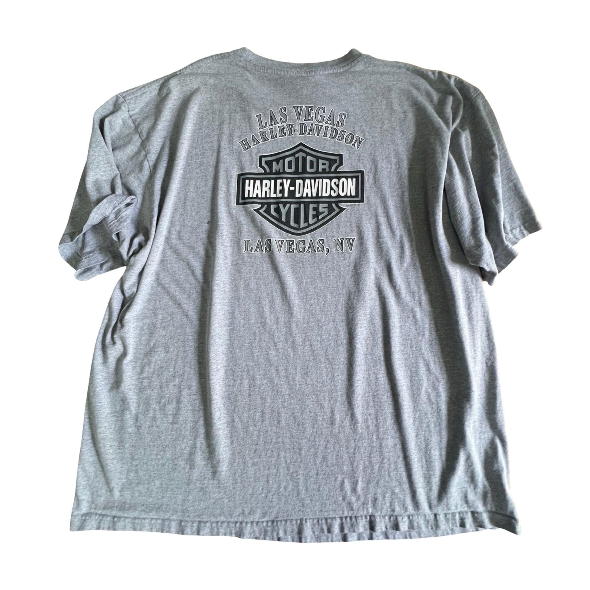 Vintage soft and faded oversized Harley double sided tee. Eagle and 3D emblem graphics on front, Las Vegas NV graphics on back. Tag size 3XL, measures 28” pit to pit and 30.5” top to bottom.