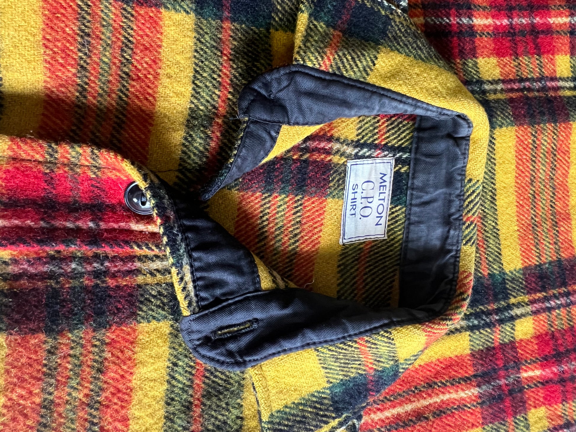 Beautiful vintage 1950’s Melton C.P.O. Shirt. Thick wool flannel in a super rare colorway! A Melton CPO Shirt is a heavy wool outerwear shirt made from melton wool, a dense, warm, and weatherproof fabric. CPO stands for Chief Petty Officer, the rank of the U.S. Navy sailors to whom the shirt was originally issued in the 1930s. This shirt is a real beauty. No size tag, measures 21” pit to pit and 29.5” top to bottom.