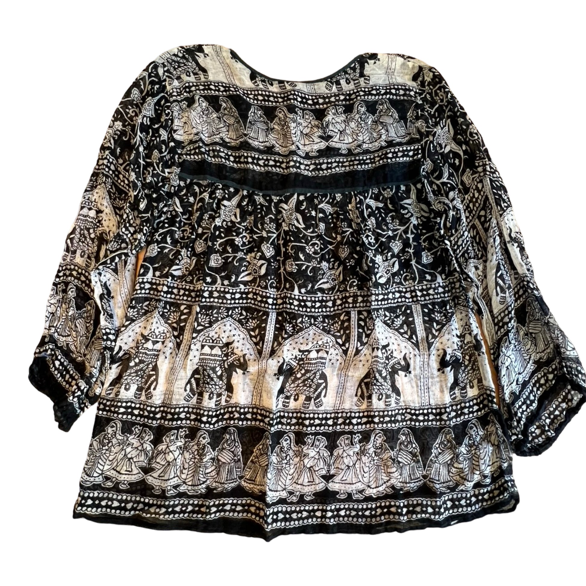 Vintage 70’s/80’s India cotton gauze block print blouse in a rare black and white colorway. Soft, thin, and sheer with long sleeves. Tagged size medium, measures 19” pit to pit and 26” top to bottom.