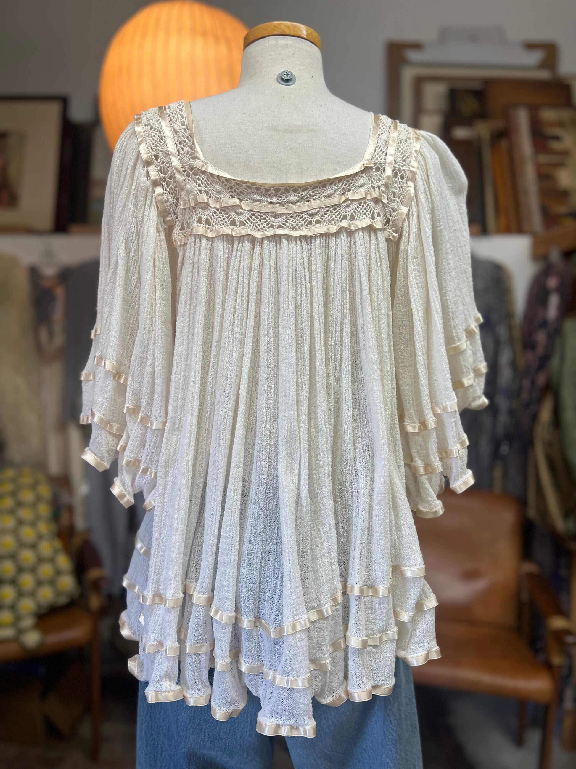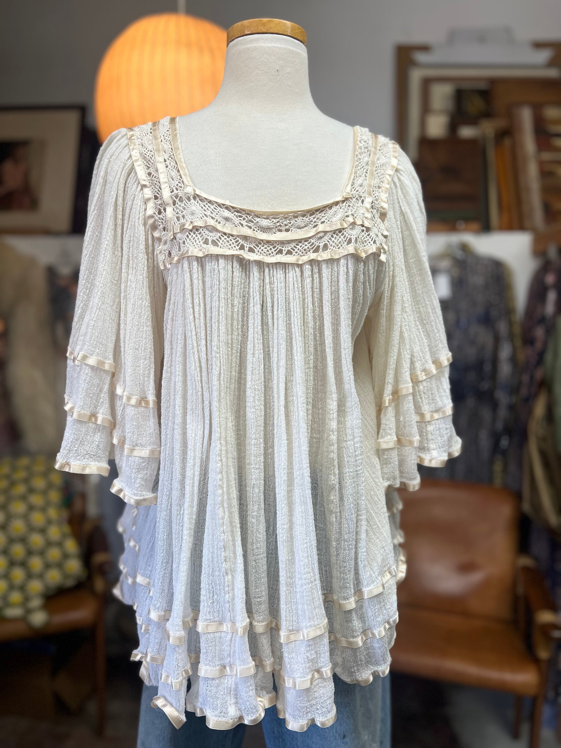 Vintage 70’s Angel Sleeve Ribbon Trim Gauze Top