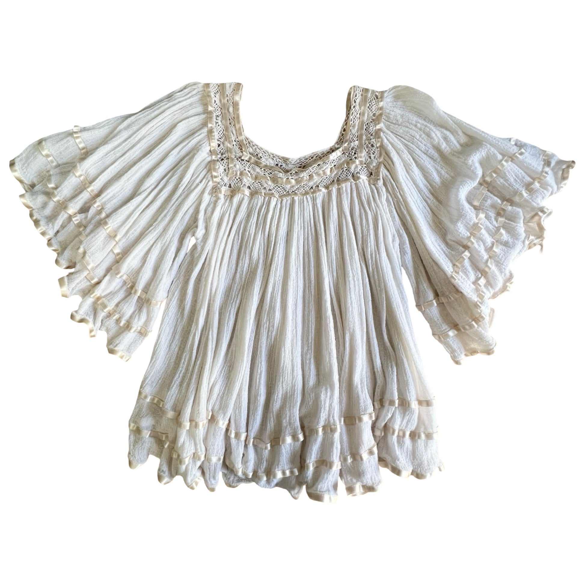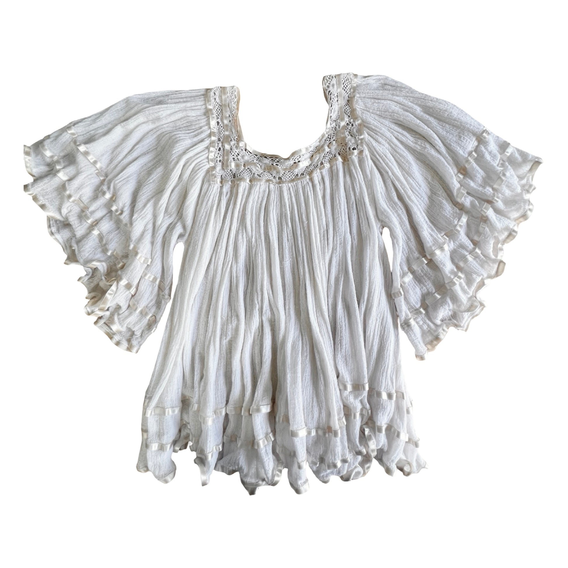 Beautiful authentic voluminous gauze top with lots of flowy fabric and angel sleeves. Three rows of cream ribbon on hem, neck, and sleeves. Measures 19” across chest, best for a small/medium for desired loose fit. Some loose threads throughout, not at all noticeable, consistent with age.