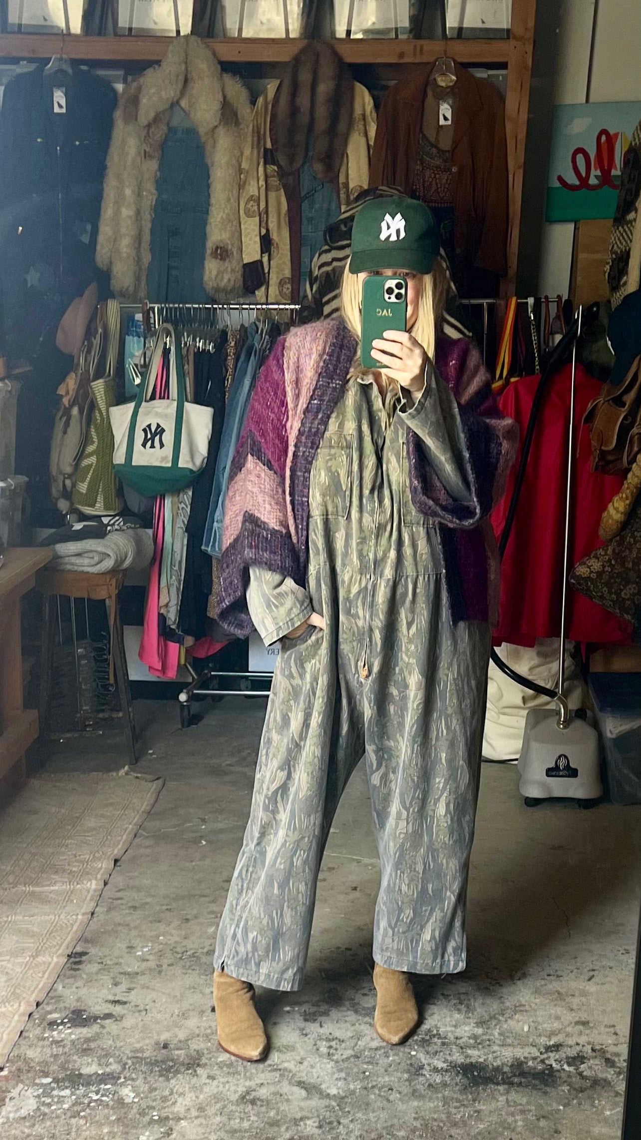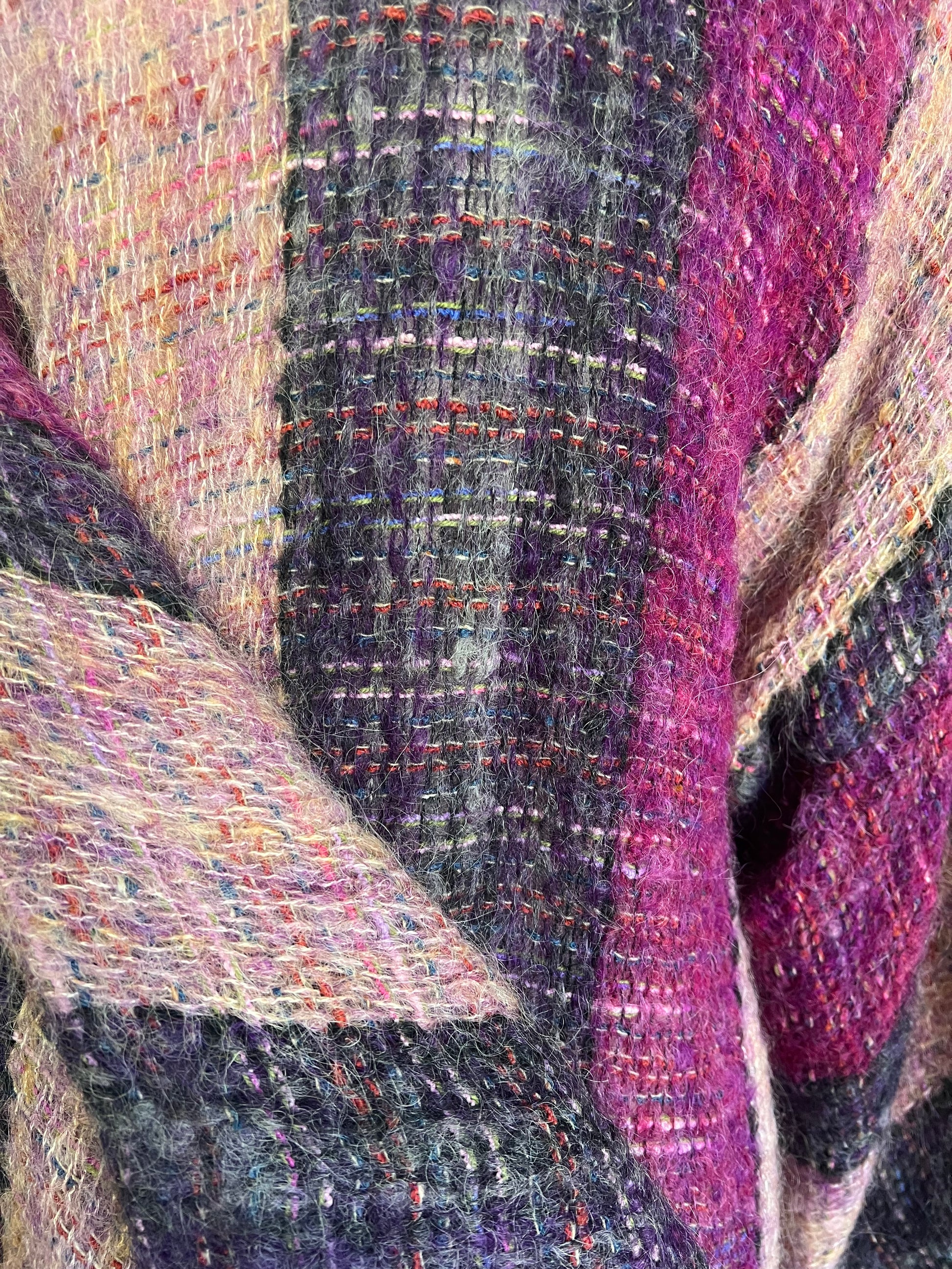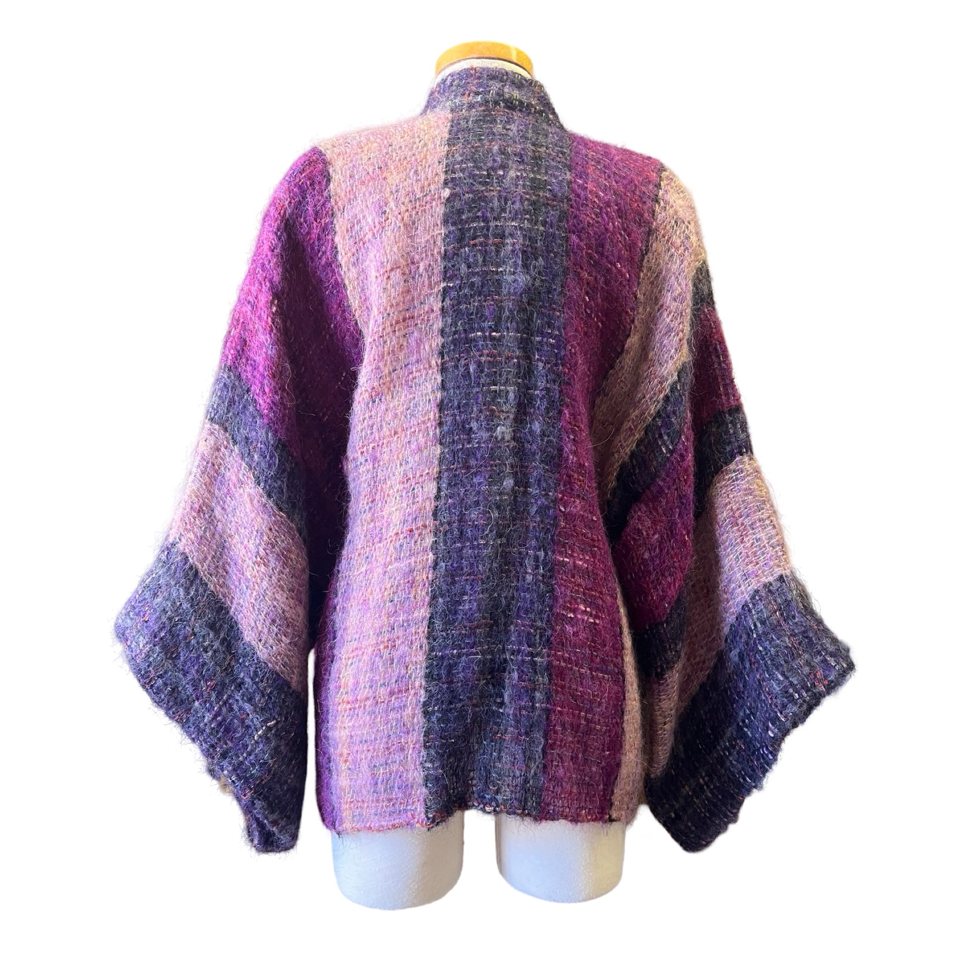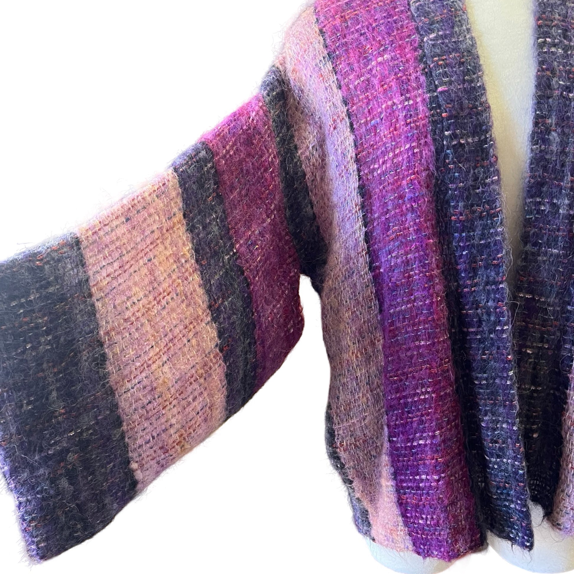 Beautiful 70’s textile knit kimono sleeve sweater jacket by Nikos Handwoven. Great nubby knit with gorgeous shades of pinks and purples…and she has pockets! Layer her over just about anything to elevate your outfit and add a bit of texture. O/S