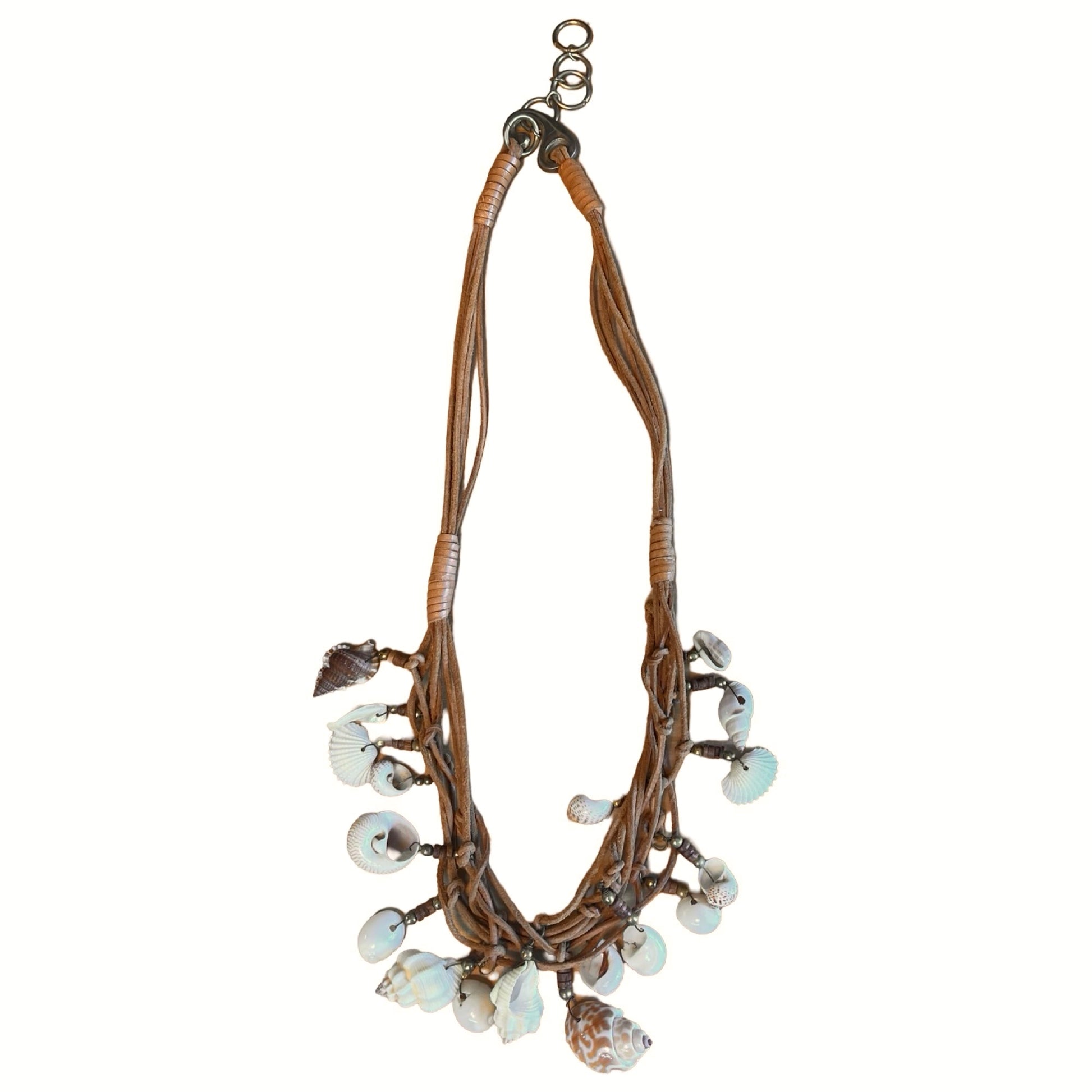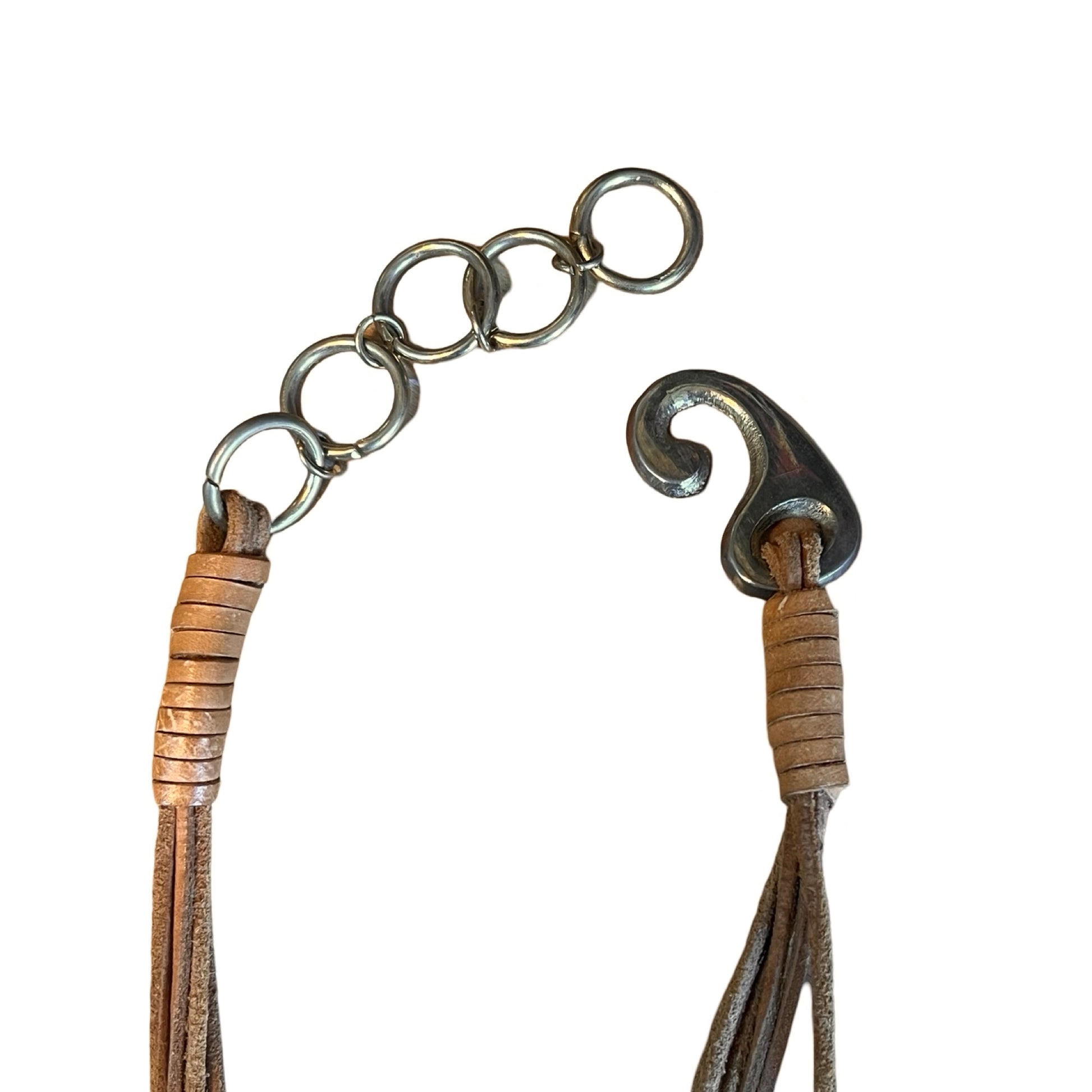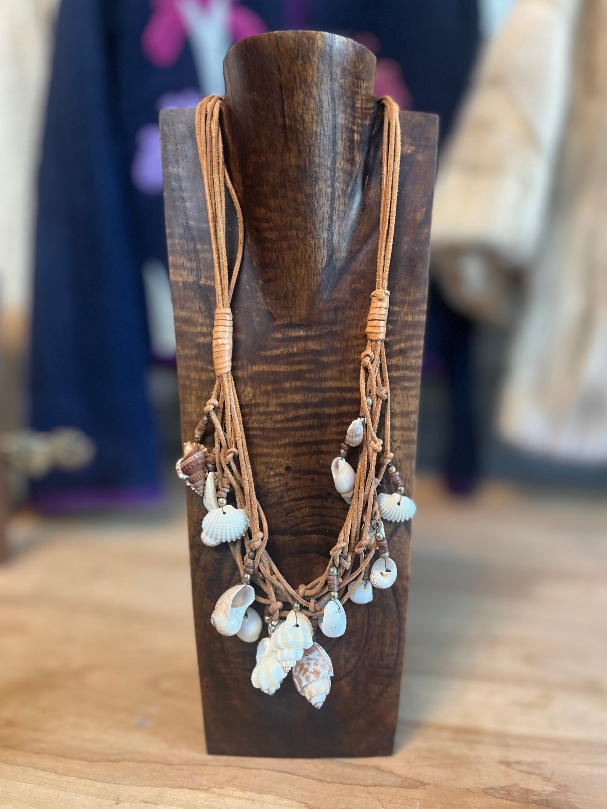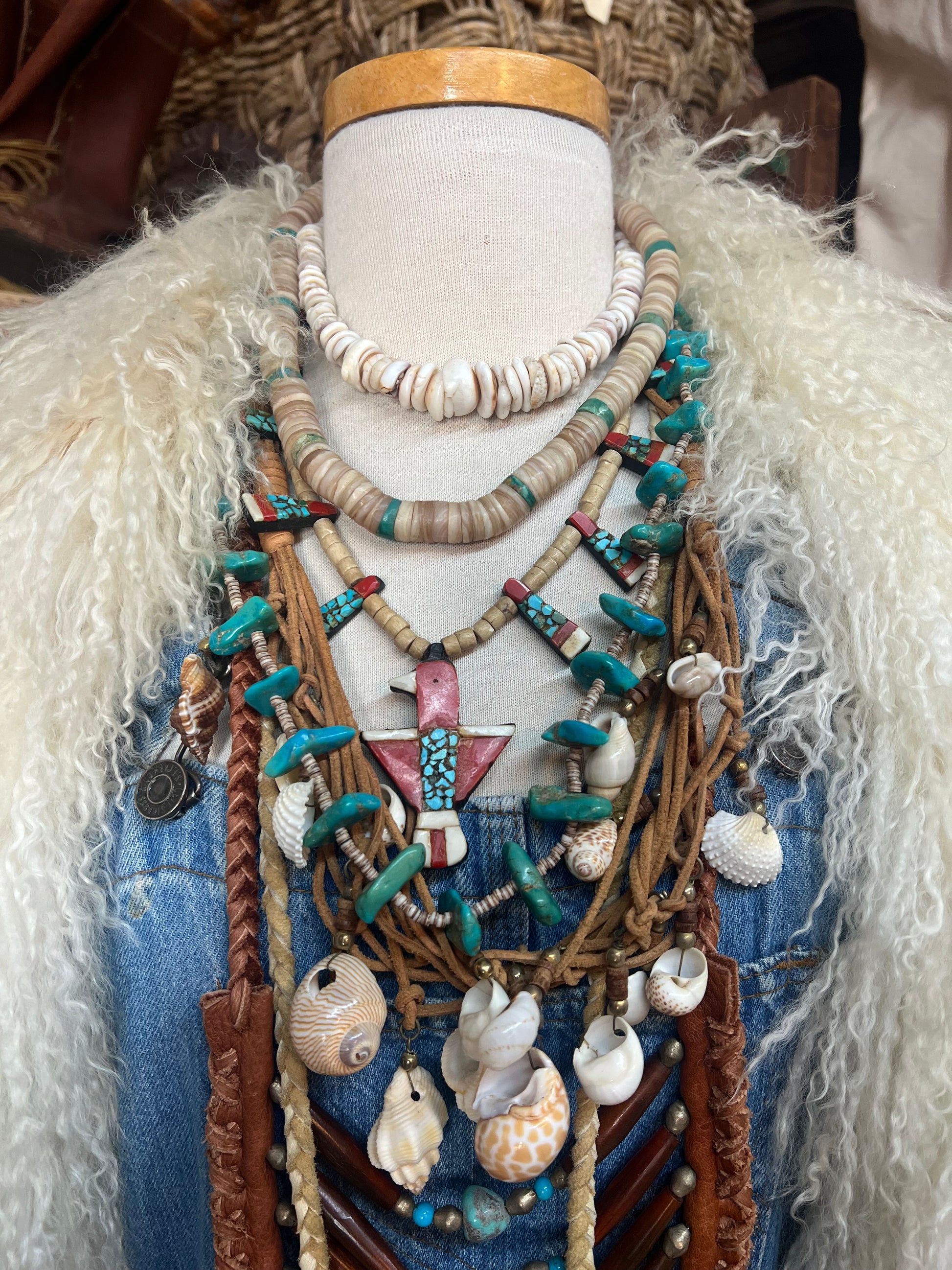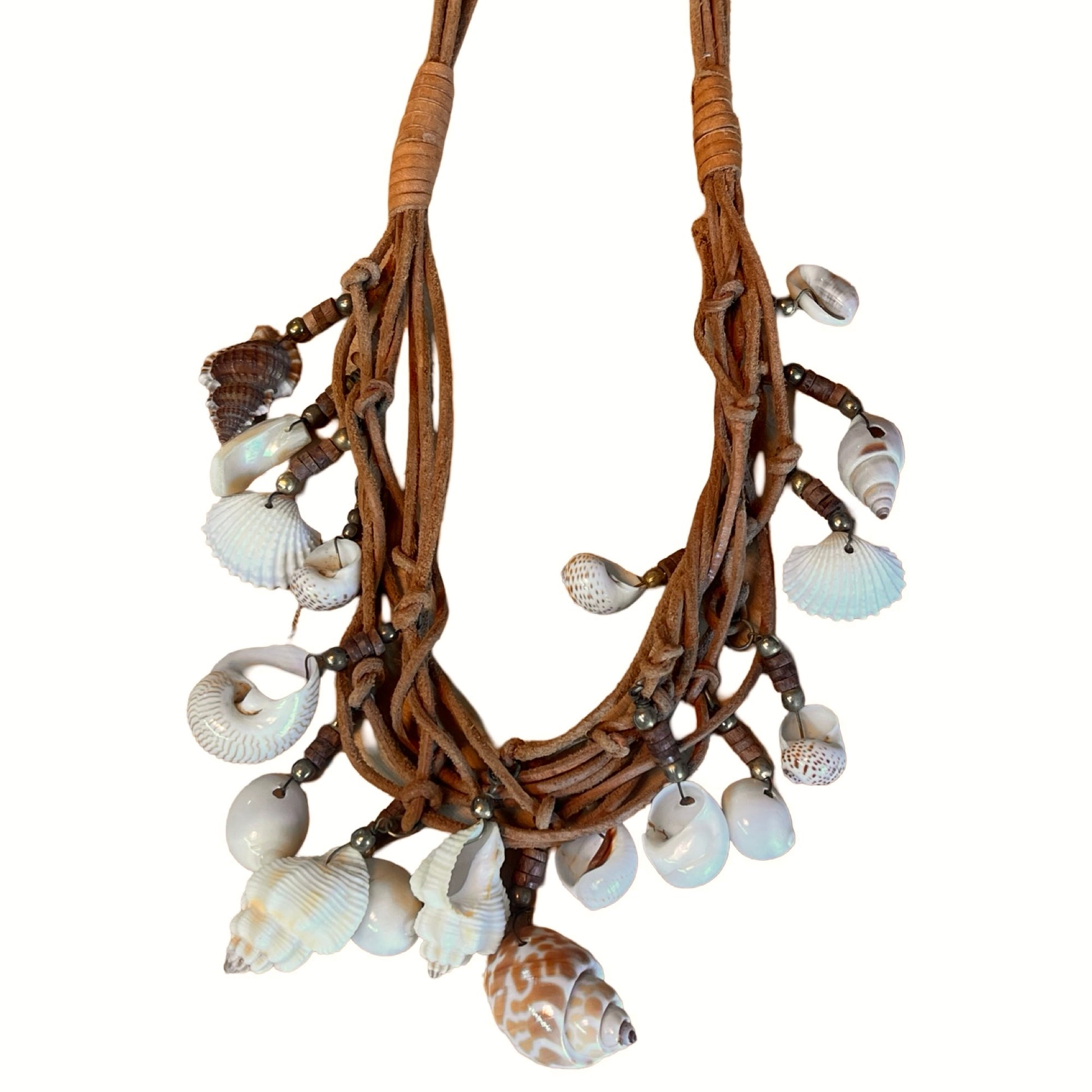 Love this necklace! Giving major bohemain beachy vibes, this vintage 70’s necklace is basically a tangled mess of leather and shells….dreamy! Really cool adjustable hook and eye closure. Measures 16” drop at longest length and 33” total length. The perfect boho layering piece but just as great on its own!