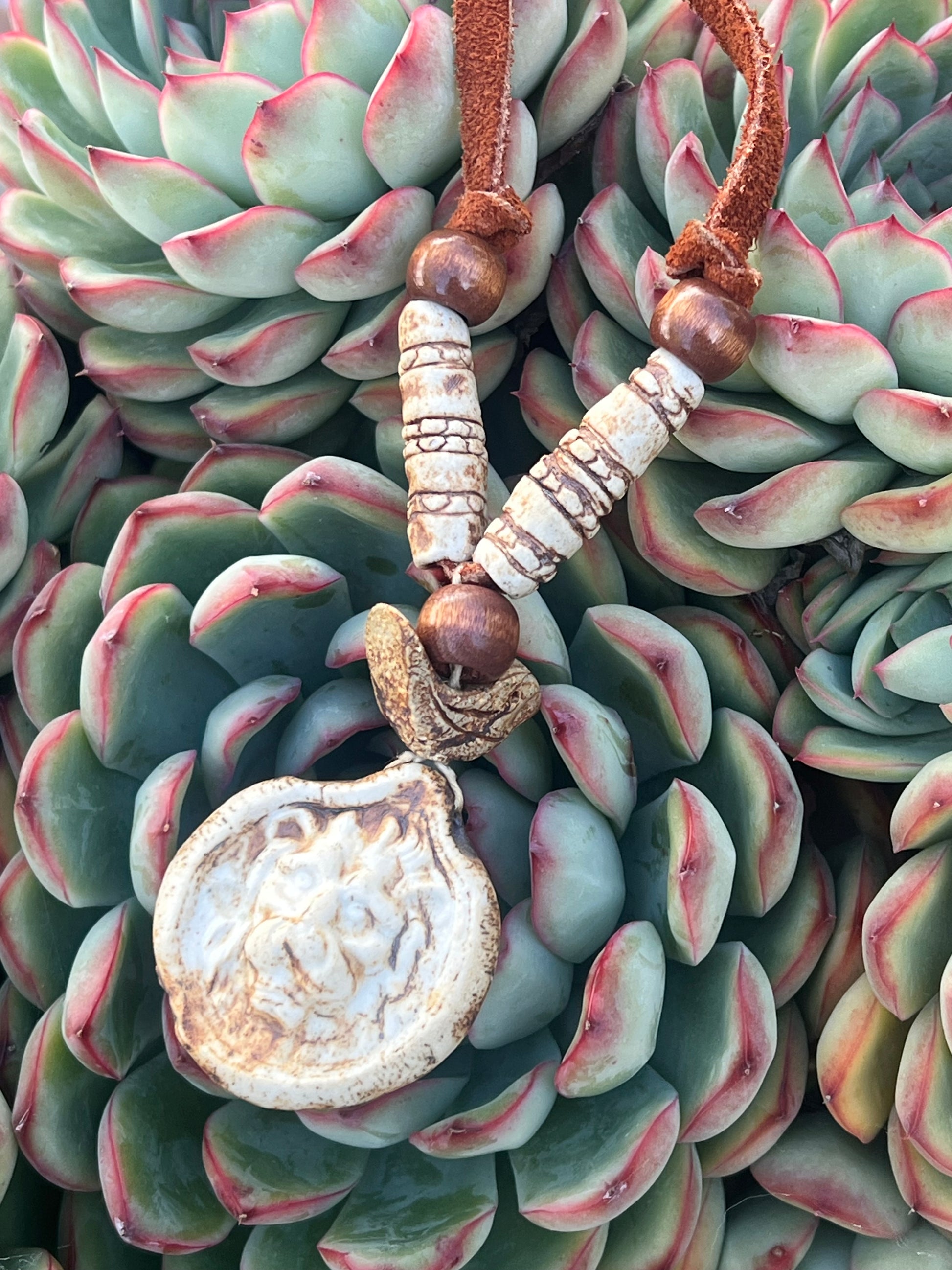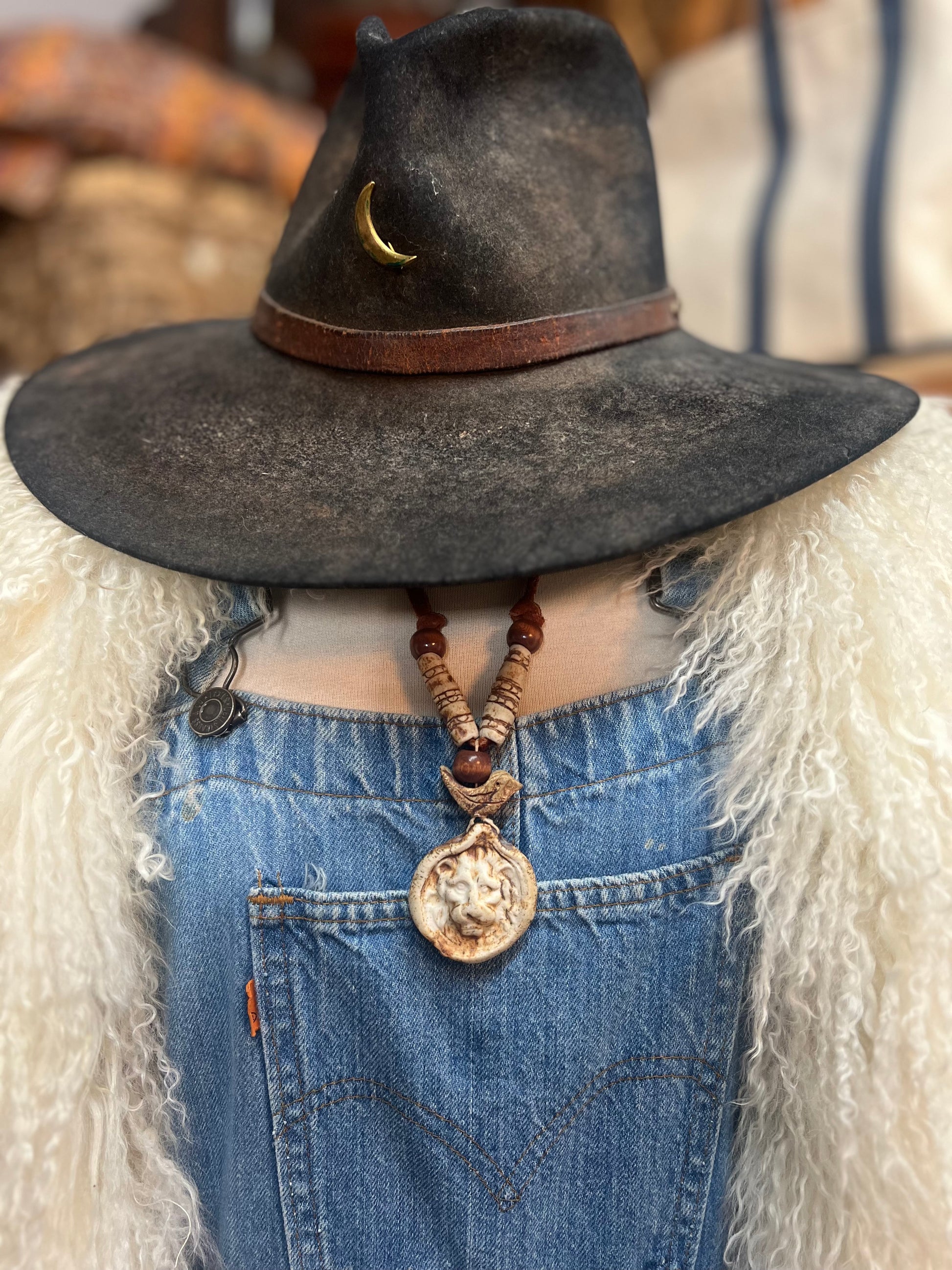 The sweetest one-if-a-kind 70’s handmade necklace featuring pottery lion medallion with little bird and wood & decorative pottery beads. Adjustable length on raw leather/suede.